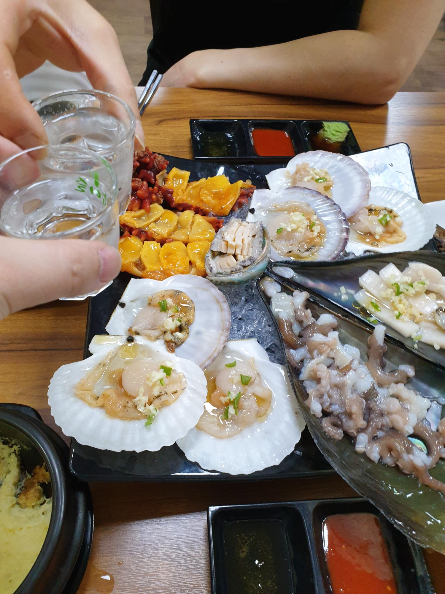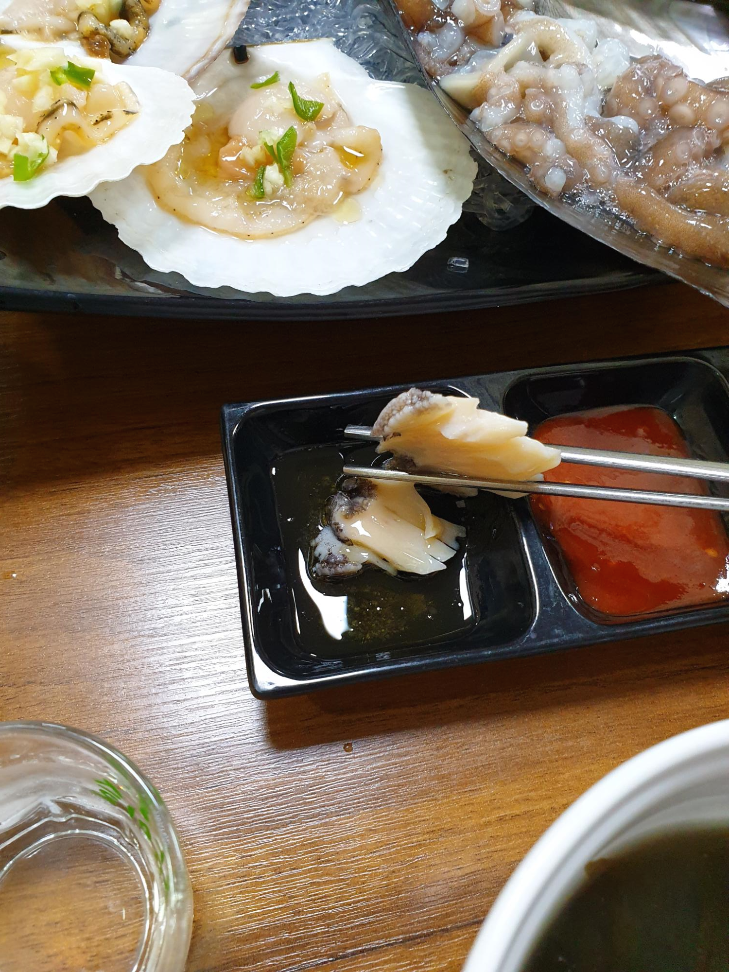 그래도 즐거운 자리인데 술잔을 기울이며 최대한 즐겨봐야죠. 술잔과 함께 해물모듬을 즐겨봅니다.