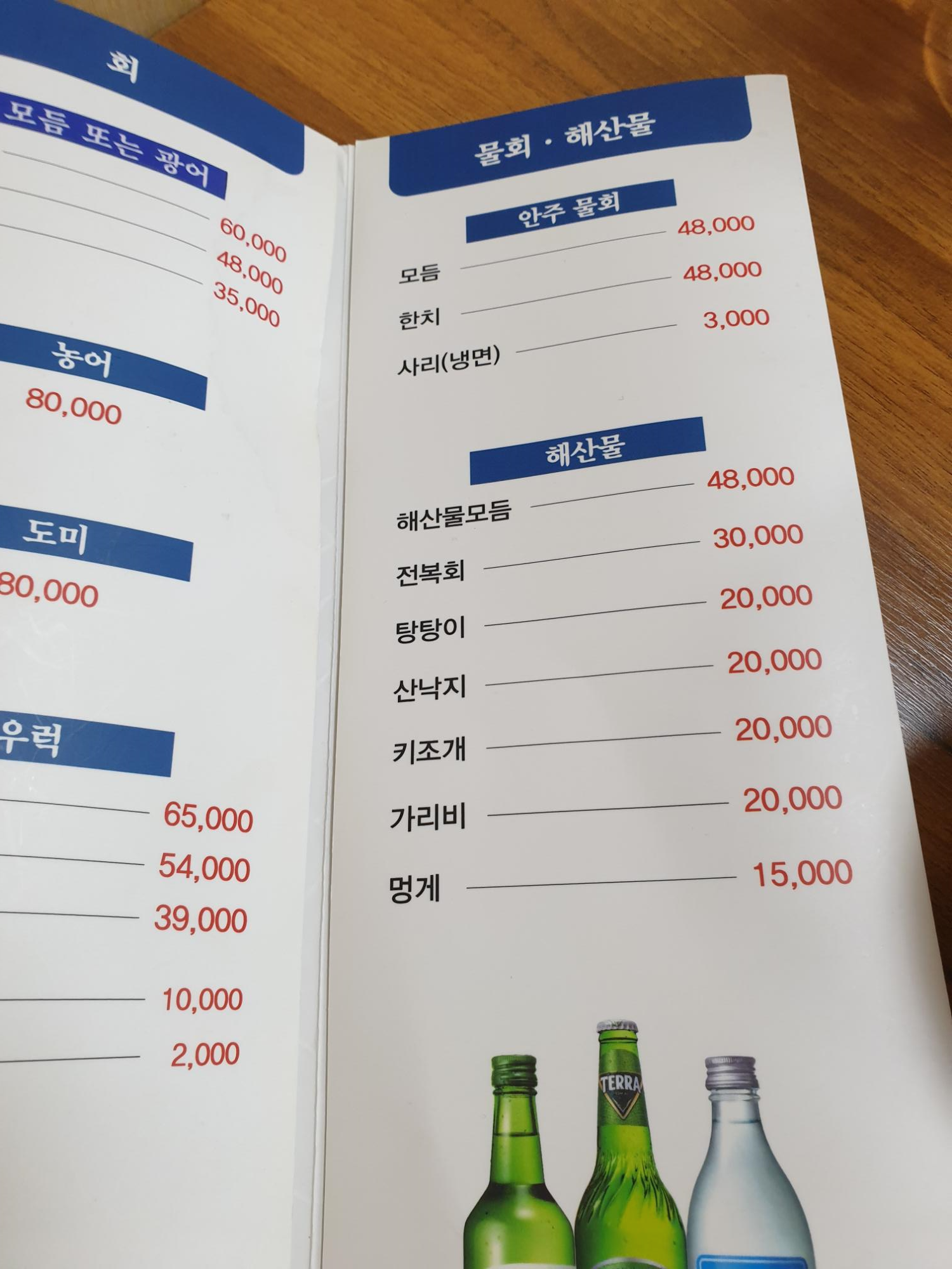 입장해서 메뉴가 맞는지 다시한번 메뉴판을 보며 확인을 합니다. 해물모듬 48000원 밖에서 보았던 그대로 입니다. 해물모듬과 해물에 어울리는 소주를 시킵니다.