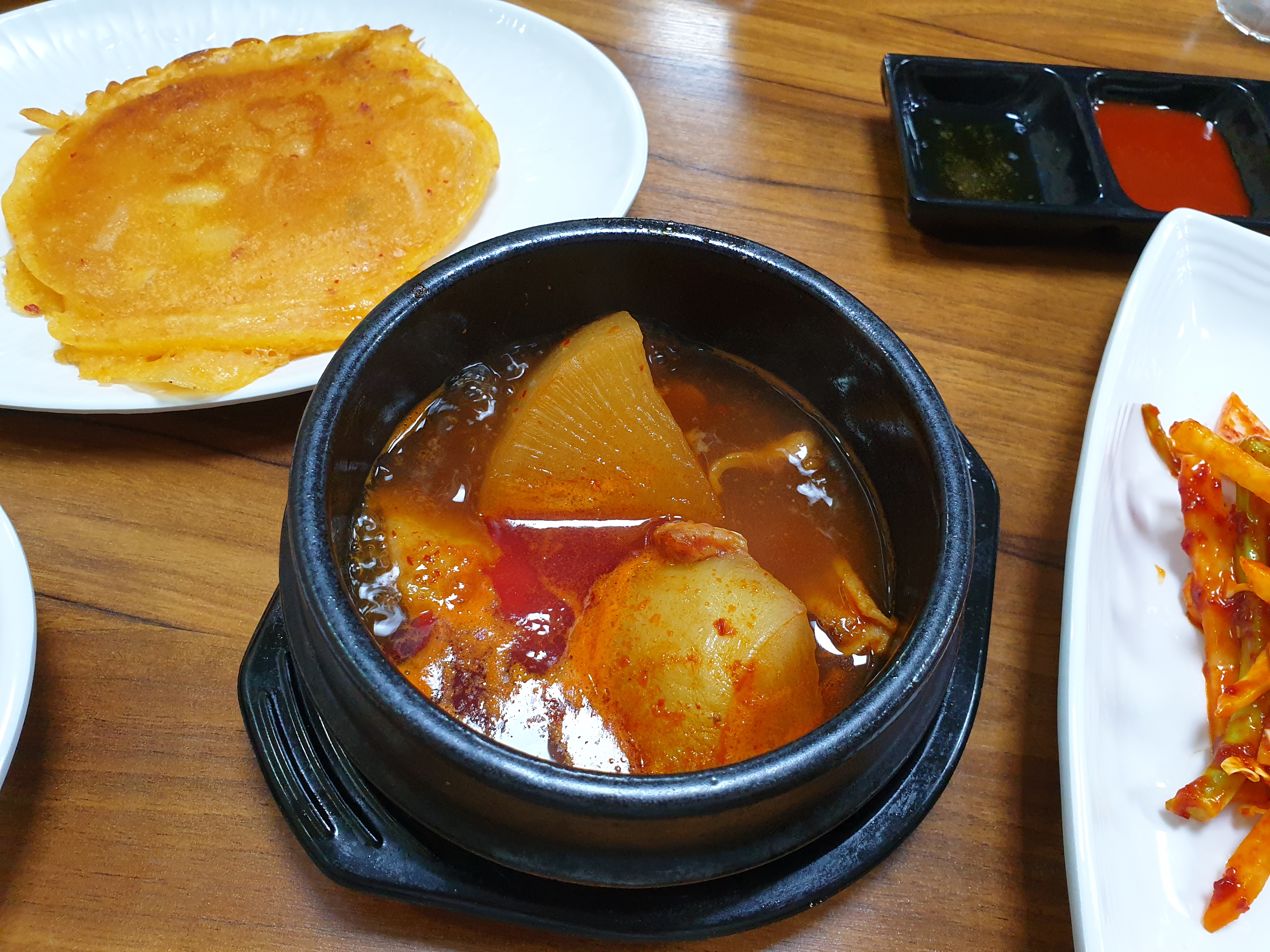 하나씩 요리가 나오기 시작합니다. 생선에 무를 졸여낸 탕인지 졸임인지 매우 헷갈리는 메뉴가 나옵니다. 불안하기 시작합니다...