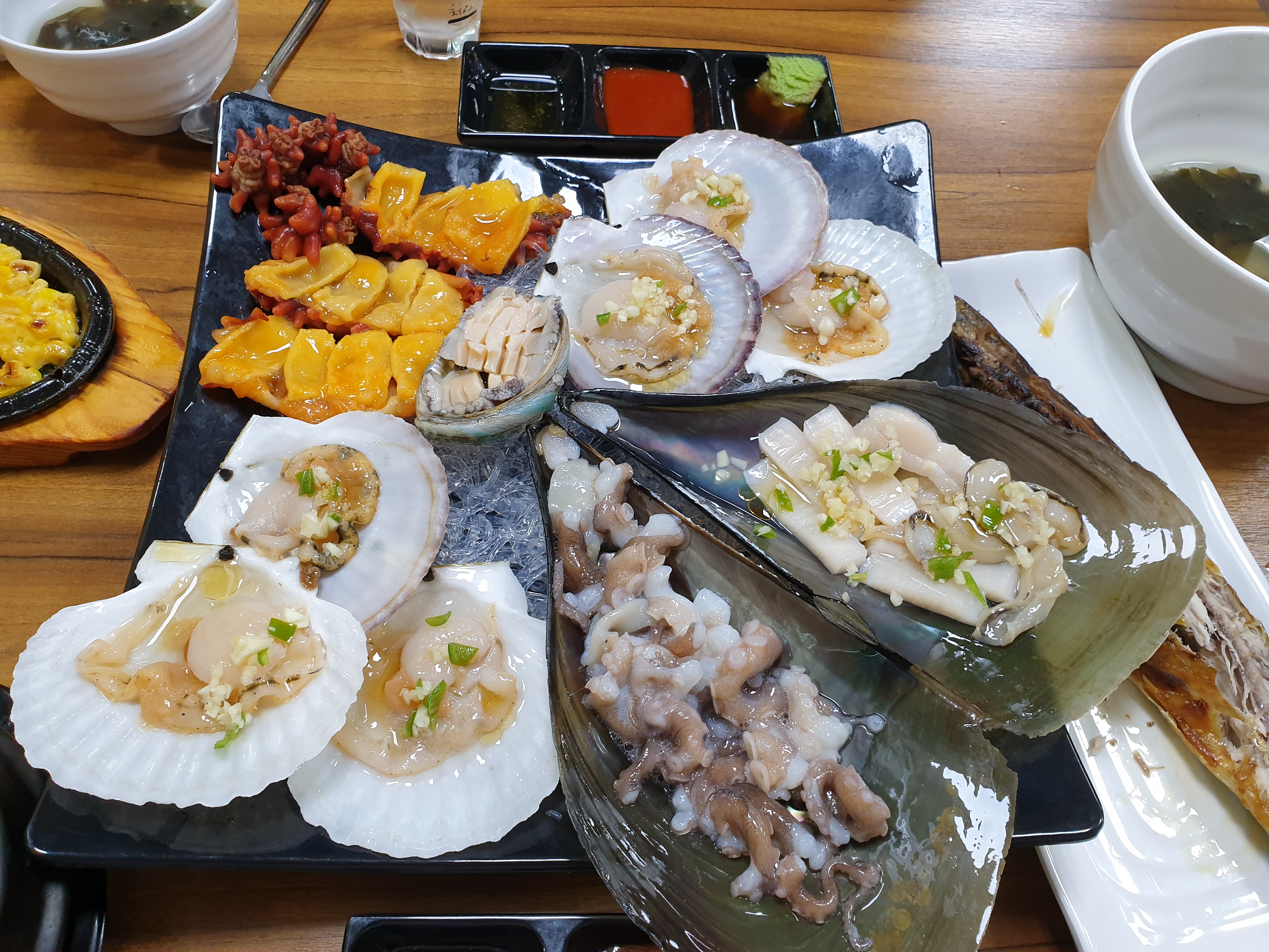 자 이 모든것을 상쇄할만한 해물모듬을 기다리며 드디어 메인이 나왔습니다. 하지만 비주얼이 제가 어디서 먹은 해물모듬보다 가장 초라하게 느껴집니다. 아니 보통의 비주얼인데 제가 스키다시에 실망을 해서 일까요... 별로 식욕이 당기지 않습니다. 전복 한개가 애처롭게 느껴집니다.