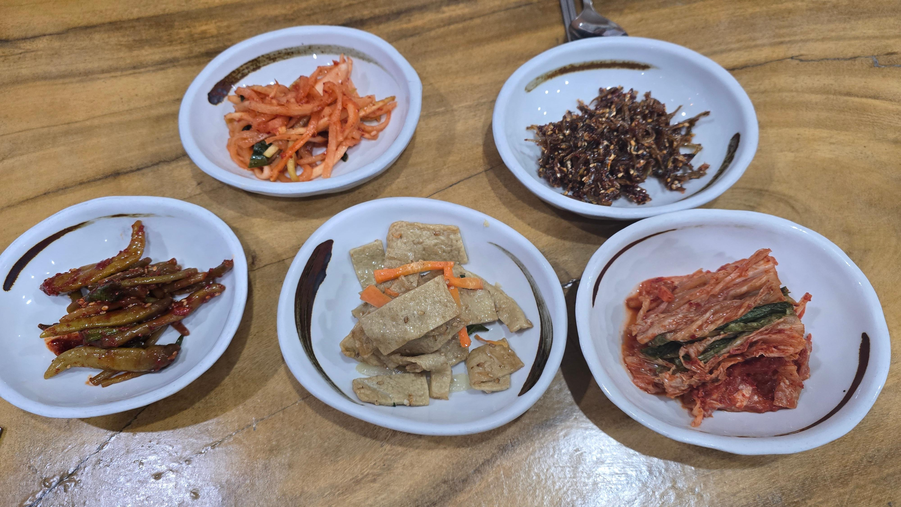 주문을 하고 잠시 기다리자 밑반찬부터 세팅을 해주시는데 무생채, 멸치볶음, 고추짱아찌, 어묵볶음, 배추김치의 매우 토속적인 5첩반상이 아침식사용으로 과하지도 않고 모자르지도 않게 느껴지며 매우 맛있어 보이는 비주얼을 자랑하고 있습니다. 반찬의 맛을 보니 적당한 간에 짜지도 달지도 않은 적절한 맛으로 조식용 반찬으로는 매우 만족스러운 상태입니다.