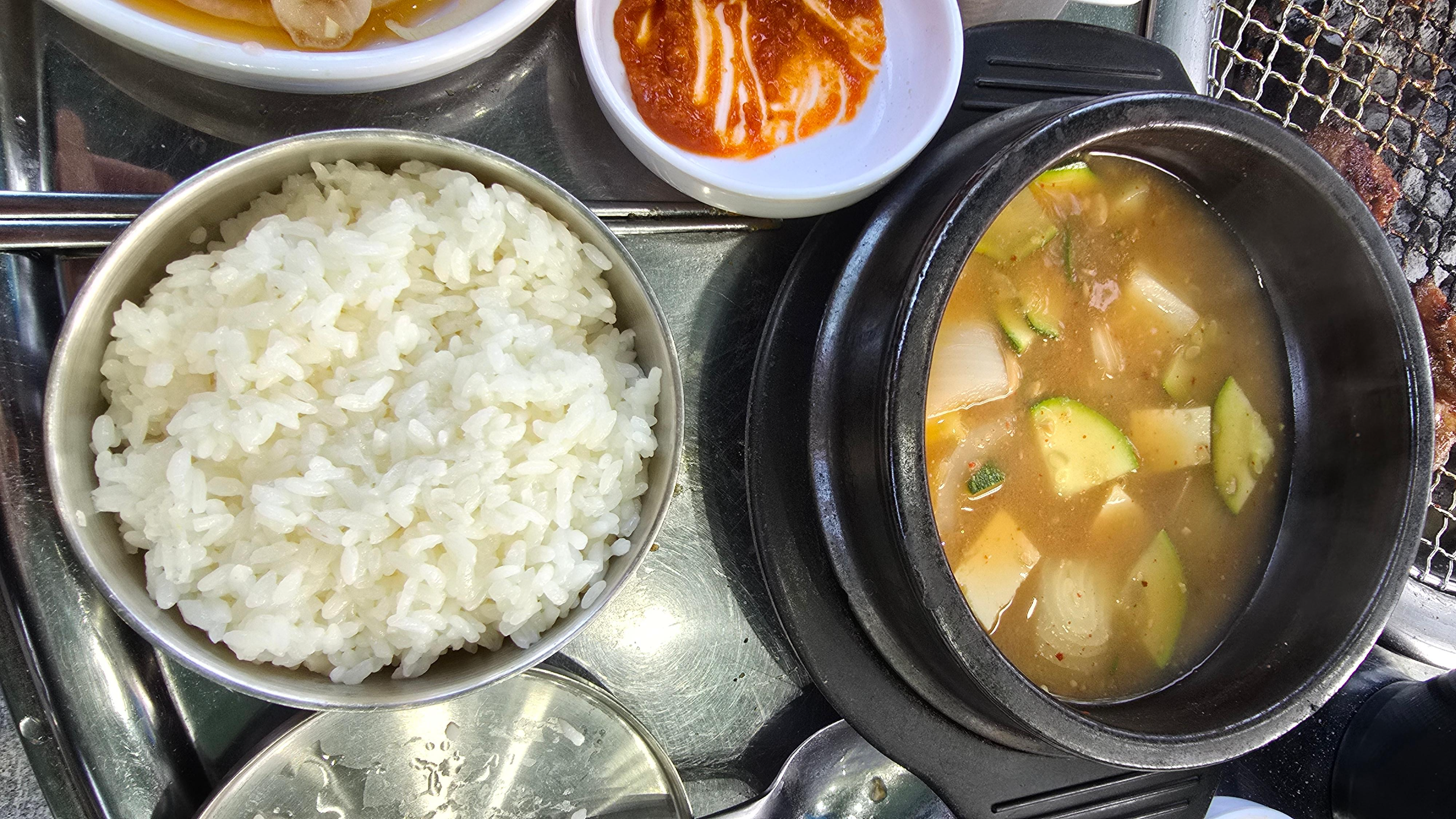 고깃집의 마무리로 냉면은 먹었겠다 된장찌개도 맛이 궁금해져서 주문을 하고 맛을보니 모든것이 완벽할 수는 없는법 된장찌개는 슴슴한 간을 좋아하는 사람들이 매우 좋아할 만한 어쩌면 된장국이라 불러도 될정도의 담백한 맛을 보여주며 야채로 나온 청양고추와 마늘을 썰어넣고 숯불에 올려 조금 졸여서 먹으면 베이스간이 좋기 때문에 최고의 된장찌개로 업그레이드되는 마법을 보여줍니다.