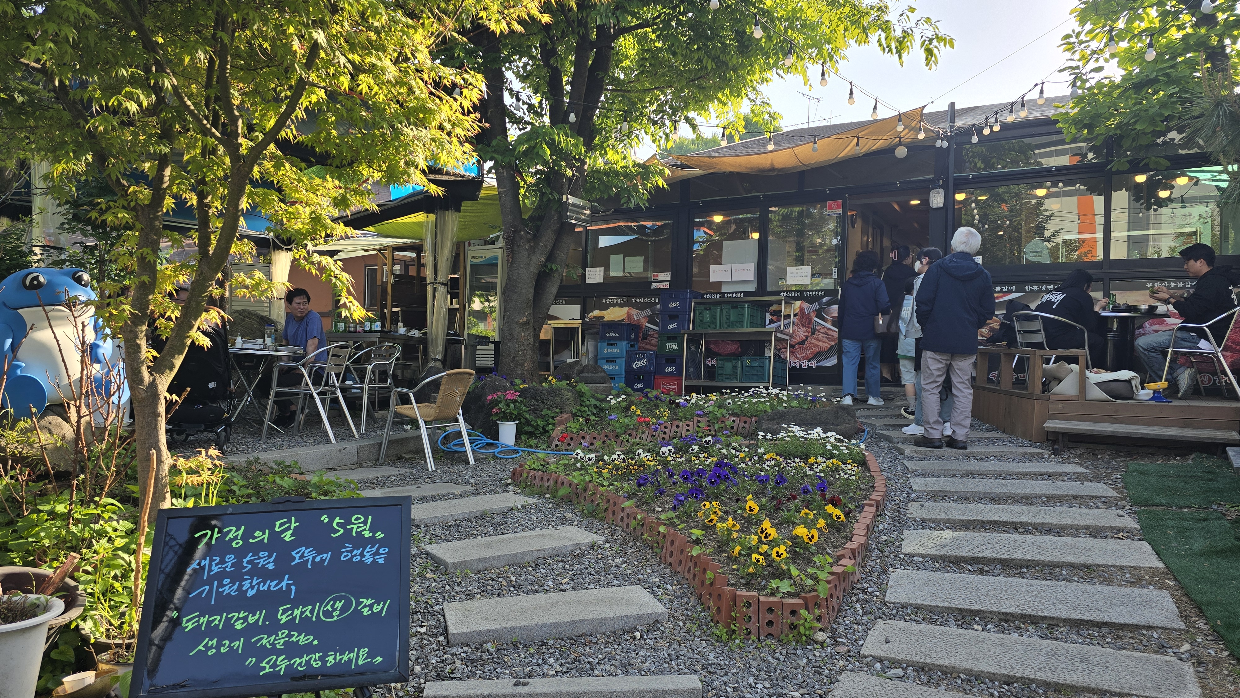 가게로 들어가 자리를 알아보니 야외테이블은 원형테이블로 4인이상 앉기가 쉽지않아 2자리를 붙여야 되는데 자리가 떨어져 있어 실내로 들어가도 되는지 문의하니 실내는 강아지를 데리고 들어갈 수가 없는 공간이라 어쩔수 없이 야외에 앉아야 된다고 합니다. 이를 어쩌나 고민하다 야외 떨어진 2자리를 붙이기로 원만히 합의하고 입장을 합니다.