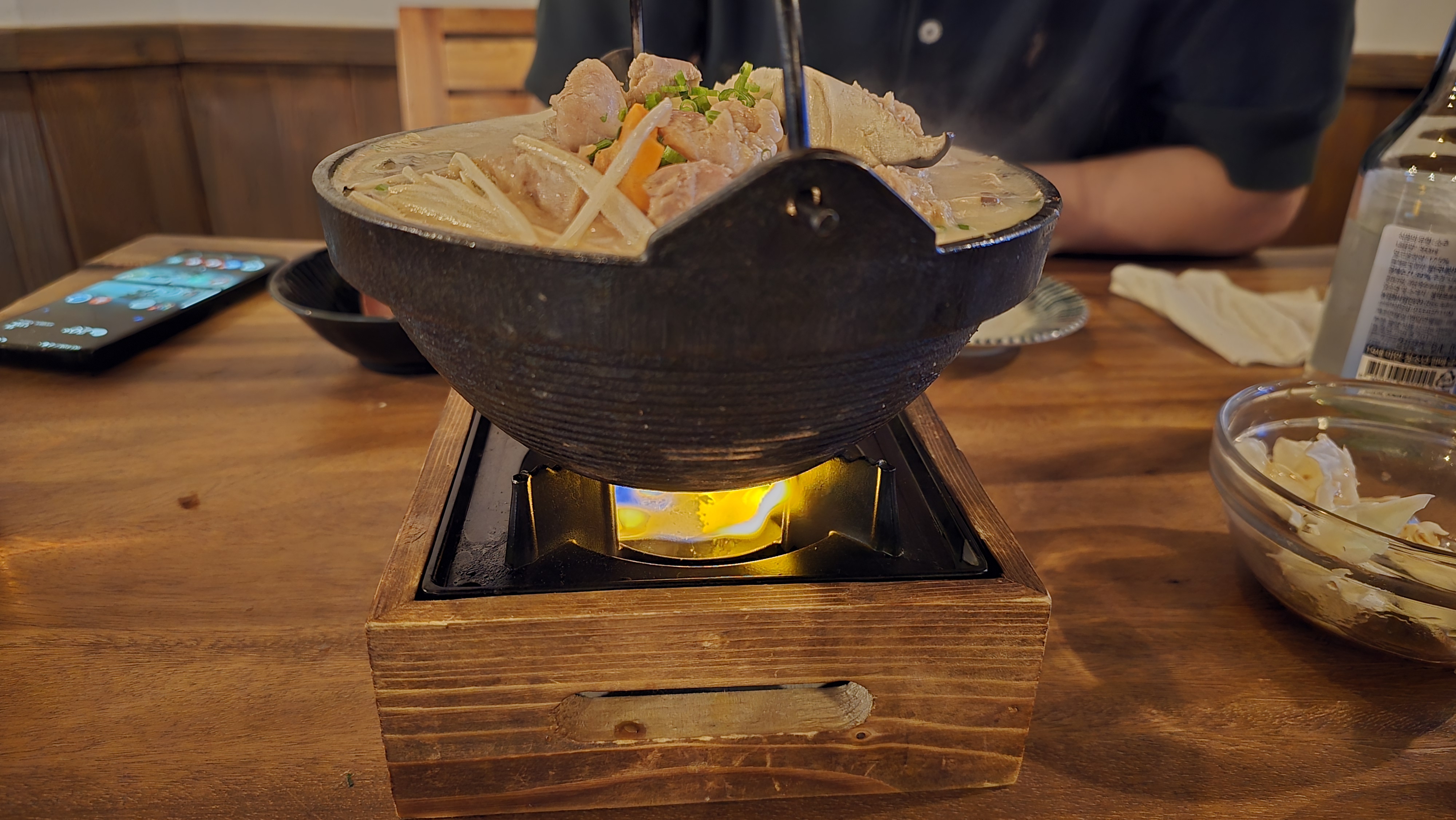 국물을 한숟갈 떠먹어보니 미지근해서 이상하다 생각하니 역시 미니화로에 불을 붙여서 즉석에서 끓여먹는 좋은 분위기를 연출해주시고 있습니다. 충분히 끓여서 나베를 한입먹으니 참으로 밍밍하면서도 국물과 재료가 따로노는 상당히 실망스러운 맛을 보여주고 있습니다. 좋은 분위기에 기대가 너무 컸던 탓일까 충분히 졸여가며 먹어봐도 국물은 감칠맛이 없고 맹탕에 재료들도 따로노는 정말로 역대급 맛이 없는 나베에 잠시 정신이 혼미해지게 됩니다.