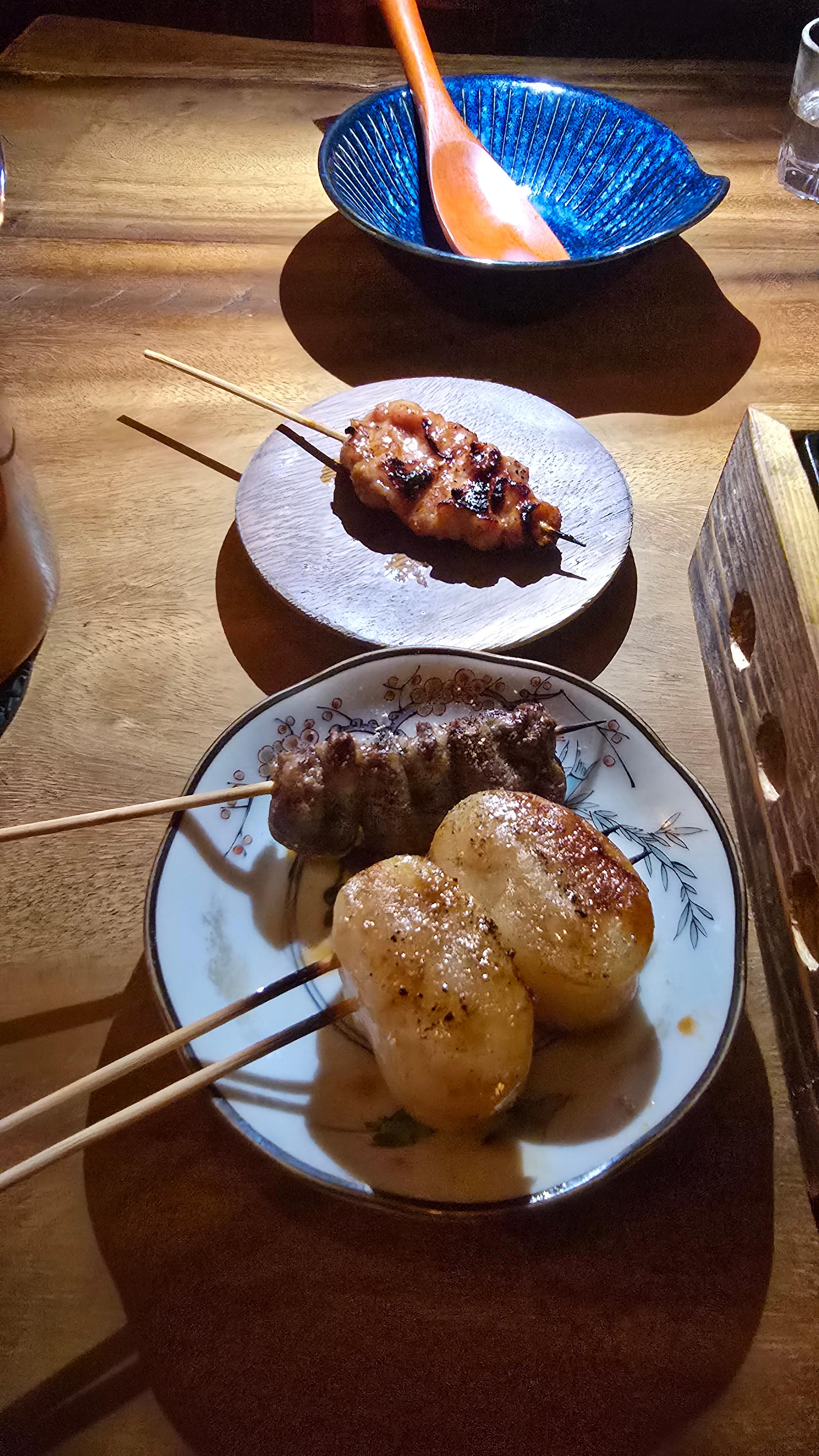 아마 국물요리는 호불호가 갈려 취향에 맞지 않을 것이다라는 생각으로 이자카야의 실패가 없는 메뉴인 꼬치를 주문하여 먹기로 하고 닭의 가슴살과 염통을 이용한 야키토리와 키조개관자 꼬치를 주문하여 나베의 충격에서 벗어나기로 합니다.