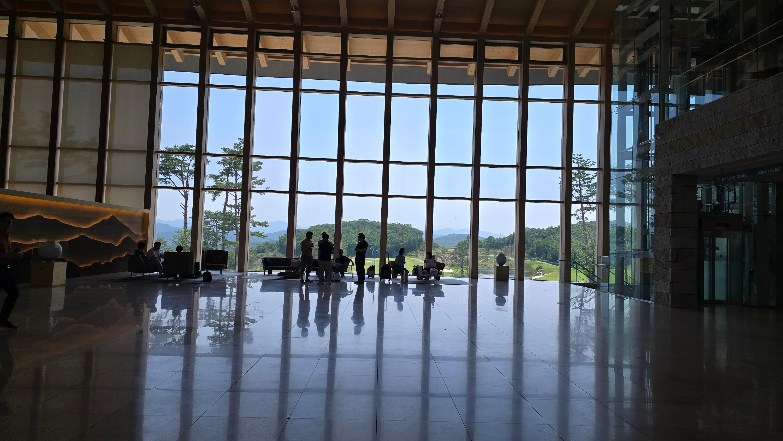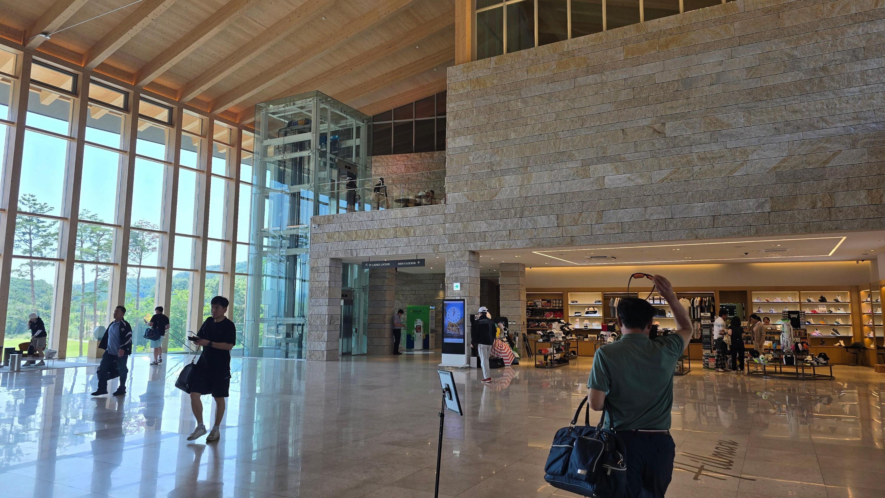 클럽하우스 내부도 사람들이 많은데 전혀 붐비는 것처럼 느껴지지 않게 드넓은 공간을 나타내고 있으며 바닥은 고급스러운 대리석 장식과 함께 바깥으로 골프장 전경을 볼 수 있는 자연채광이 들어오는 구조로 매우 자연친화적인 모습을 나타내고 있습니다.