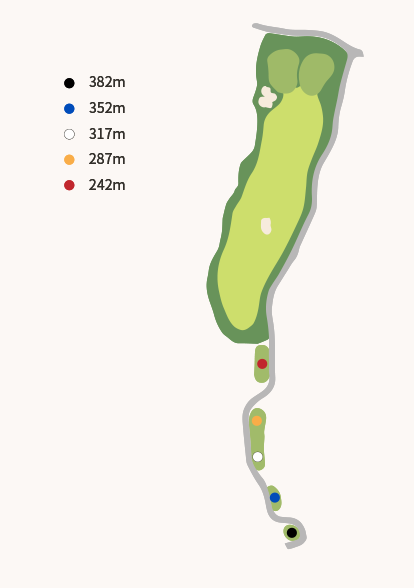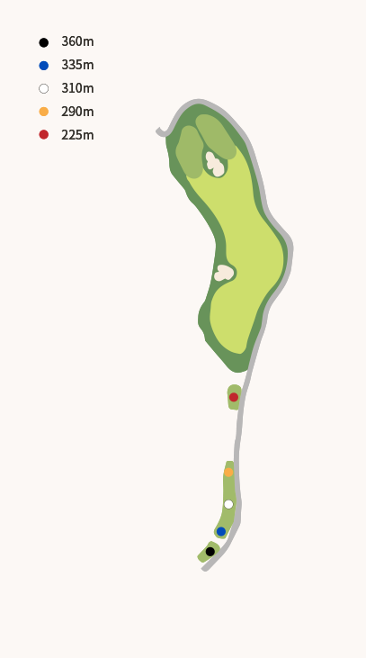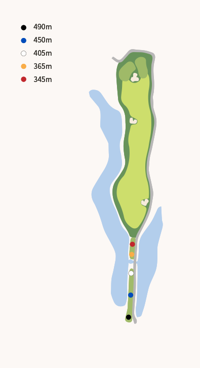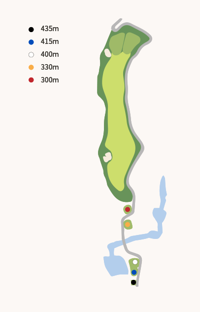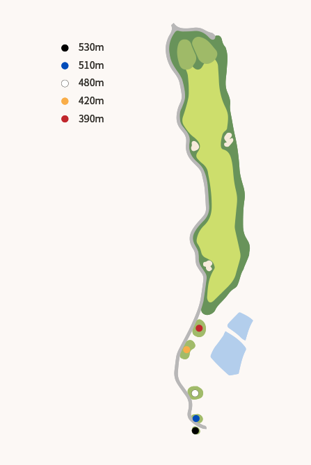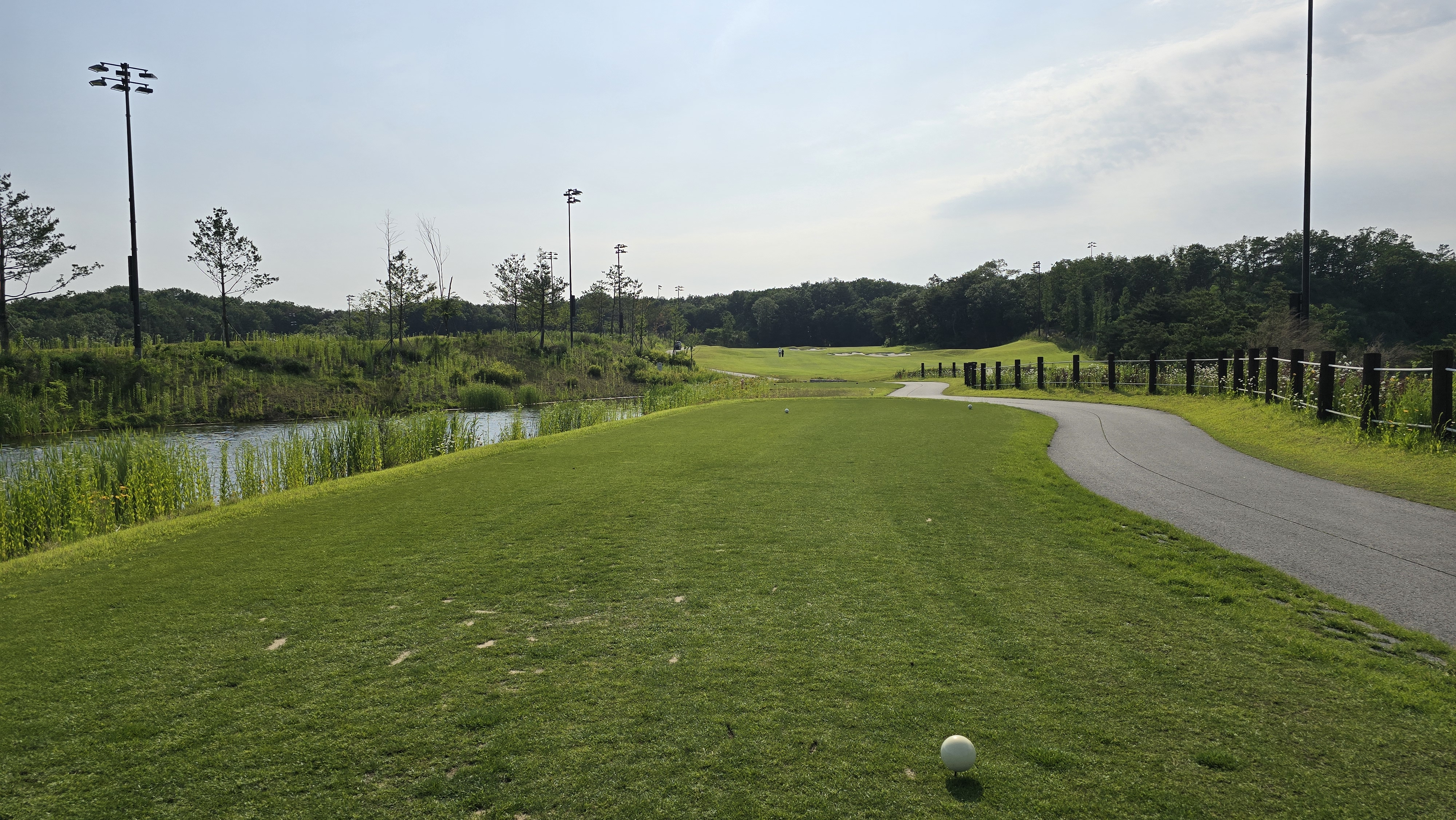 4번 330m 거리의 파4홀로 앞쪽으로는 워터해저드가 자리하고 IP지점이 좁게 보이며 오른쪽카드도로를 따라서는 OB 구역이라 열리면 바로 죽게되는 심리적 압박감을 주는 코스라 할 수 있습니다.