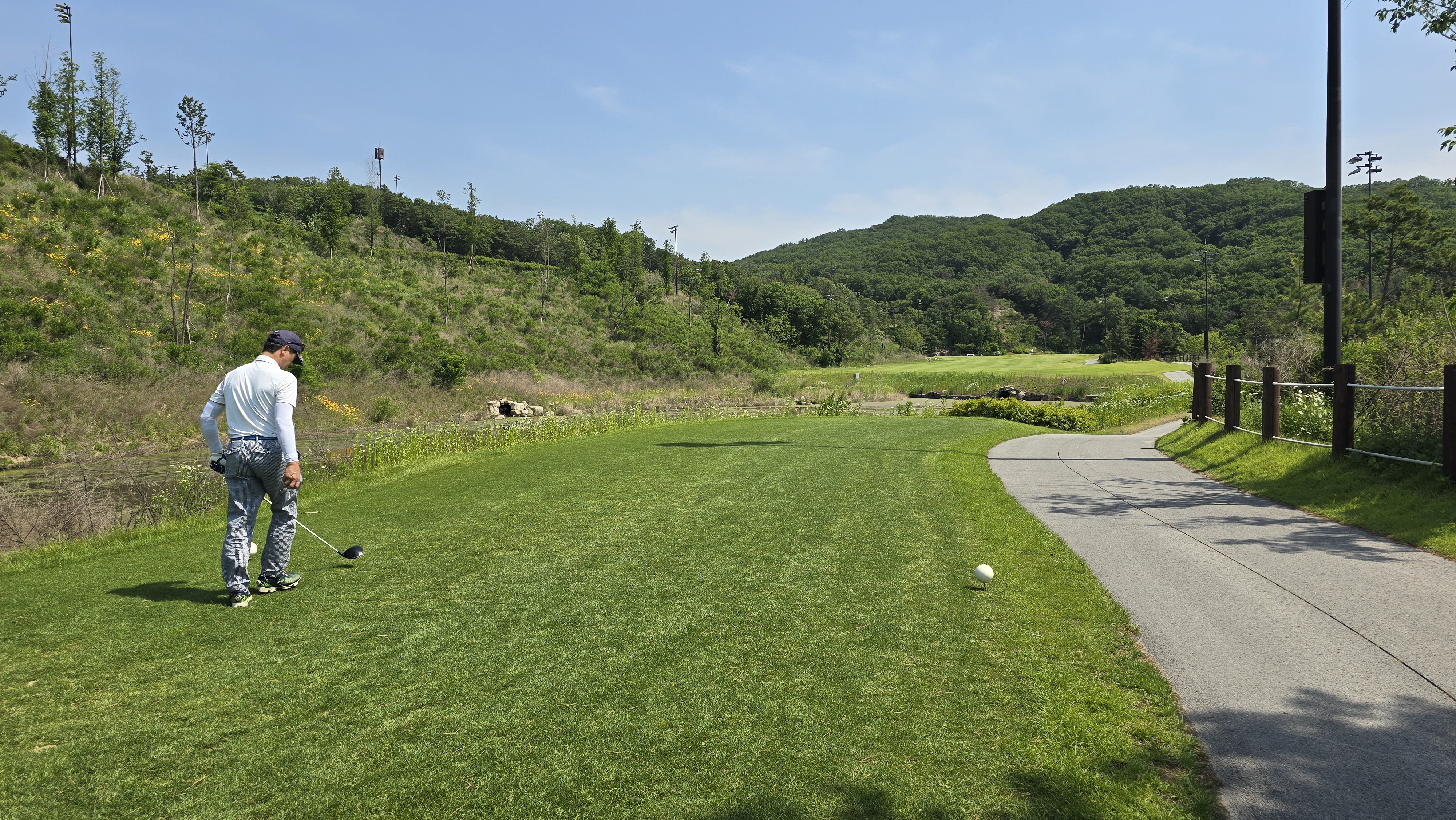 슬라이스홀로 IP지점 가운데를 보아도 오른쪽 OB가 자주난다는 캐디님의 조언에 따라 왼쪽 방향을 잡아서 티샷하지만 무의식적으로 OB를 인식하여 당기는 티샷을 보게 됩니다. 물론 왼쪽은 해저드고 법면이라 조금이라도 살가능성이 있지만 역시 슬라이스홀 OB는 플레이어를 긴장되게 만드는 것 같습니다.