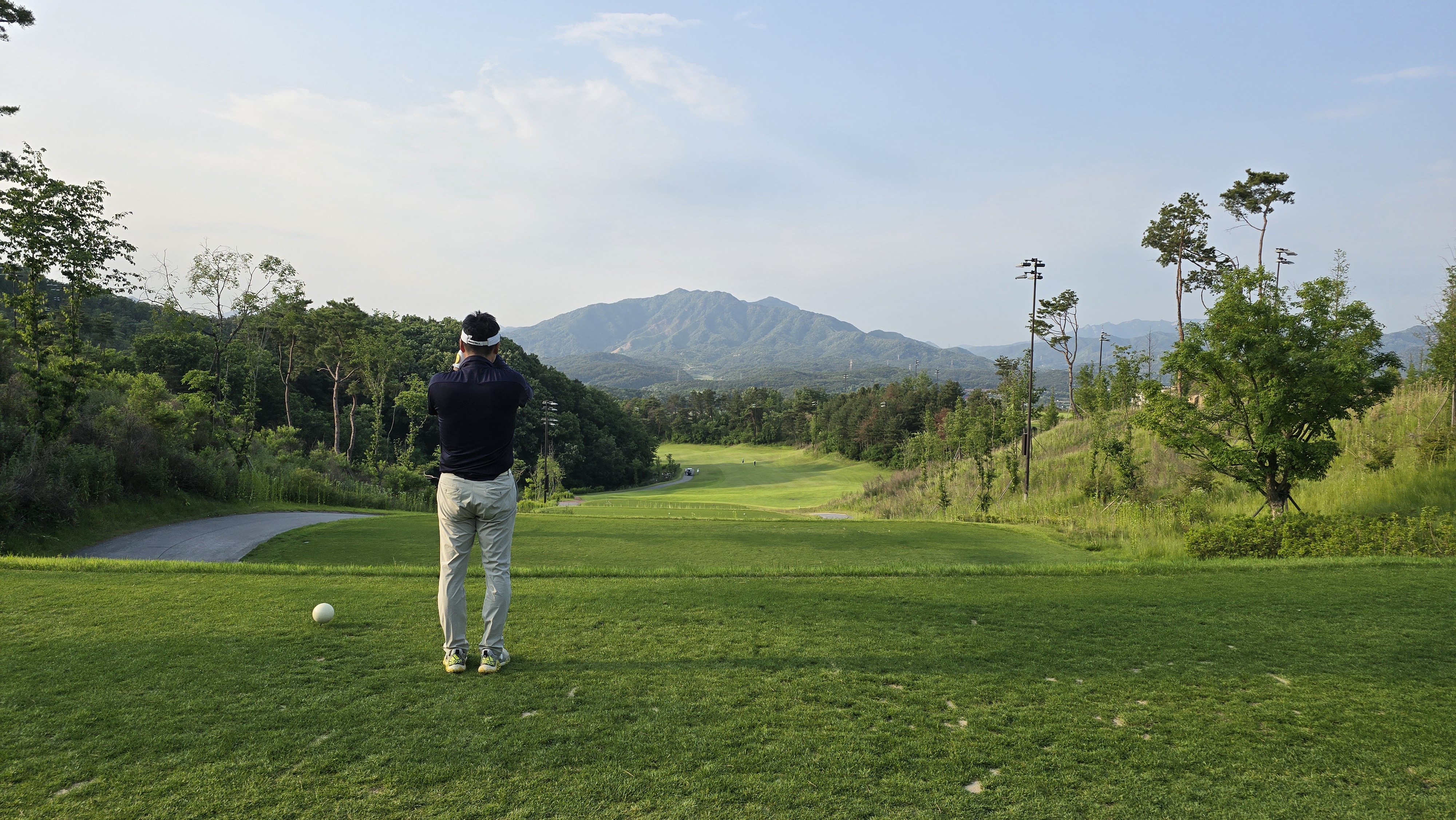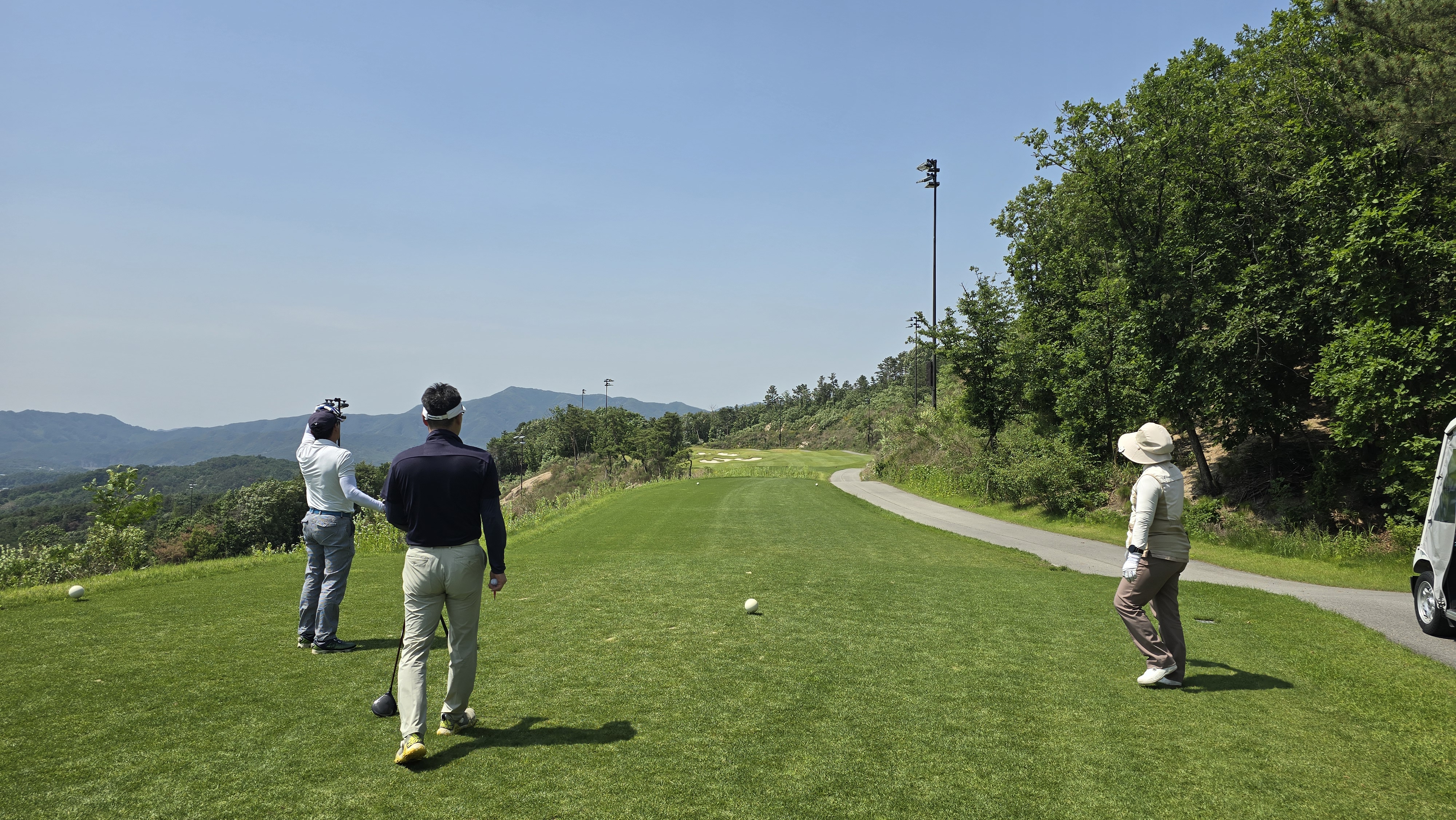 왼쪽이 OB이고 전홀이라 위험도하고 극단적으로 오른쪽을 바라보고 티샷을 하는 모습을 담아봅니다. 극단적으로 오른쪽을 보았는데도 티샷은 당겨져서 페어웨이 중앙으로 가는 모습을 보게 됩니다. 역시 골프에서 배제는 중요한 기술인것 같습니다.