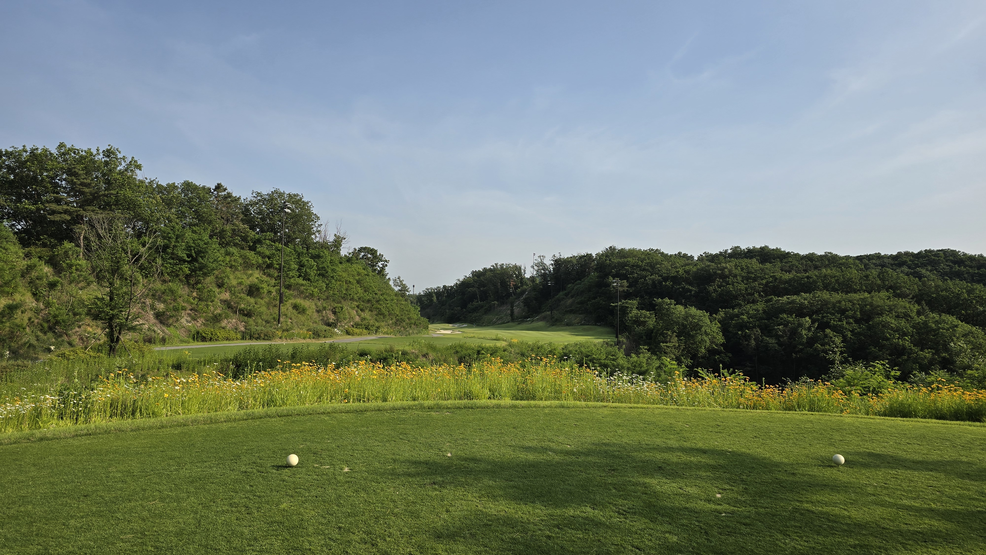 티샷을 치는 순간을 담아보니 핀이 뒤로 날아가고 푸른하늘로 골프공이 뻗은듯이 날아가는 아주 역동적인 모습을 담아내게 됩니다. 포천힐마루는 한폭의 그림같이 이쁘게 꾸며놓았기 때문에 너무 스코어에만 집중하기 보다 자연을 둘러보면서 마음의 안정감을 찾는다면 스코어도 좋아질 것이라 생각됩니다.