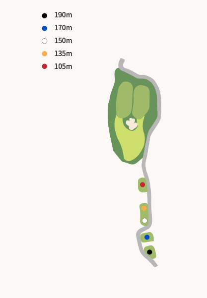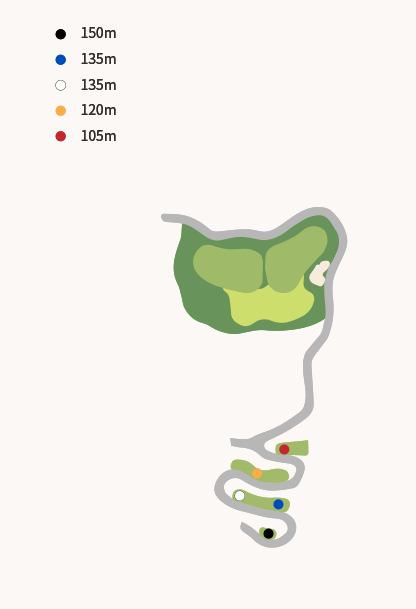 6번 150m 거리의 파3홀 좌그린 우그린 가운데 깊은 벙커를 주의하며 공략이 필요하며 우그린의 경우 도로옆에 공간이 없고 조금이라도 슬라이스가 나면 바로 OB가 나므로 슬라이스가 주로 나는 초보자라면 좌그린 쪽을 겨냥하는 것도 안전하다고 할 수 있습니다. 가장 무난한 파3이지만 거리가 있고 우그린만 조심하면 된다 할 수 있습니다.