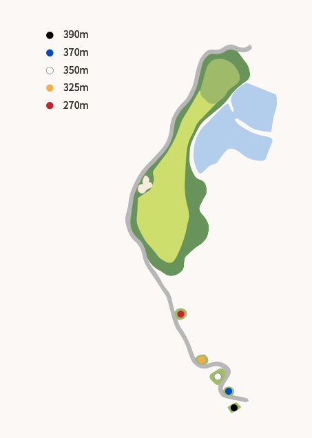 네스트코스의 마지막 9번 320m 거리의 파4홀입니다. 마지막에 좋은 스코어로 마무리하기 위해선 왼쪽 OB 구역으로 당기지 않고 오른쪽을 겨냥한 안전한 티샷이 요구되며 좌우 그린중 좌그린이 걸리면 공간이 없기 때문에 오른쪽으로 좀더 방향을 잡는것이 안전한 마무리를 하기에 좋습니다.