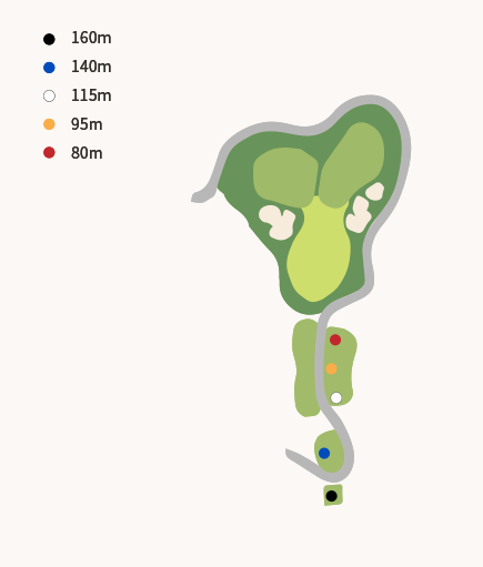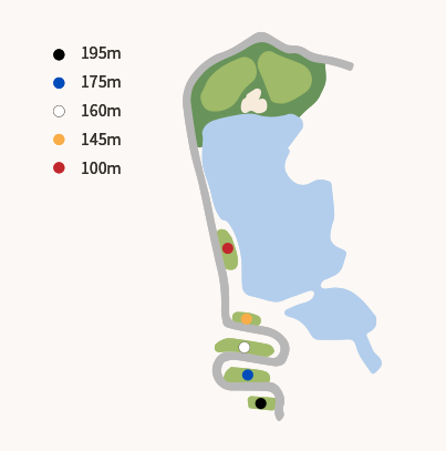 8번 160m 거리의 파3홀 정면에는 그린도입부까지 호수가 자리잡고 있으며 뒤쪽으로는 카트도로와 공간이 없기 때문에 거의 아일랜드 홀이라 봐도 무방한 구성입니다. 10m 이상 되는 내리막에 그린주변으로 바람이 변화무쌍하여 거리맞추기 쉽지 않은데 앞핀이라도 꽂아져 있으며 난이도가 급상승하는 코스로 마음을 비운다는 생각으로 공략하면 의외로 좋은 결과를 얻을 수 있습니다.