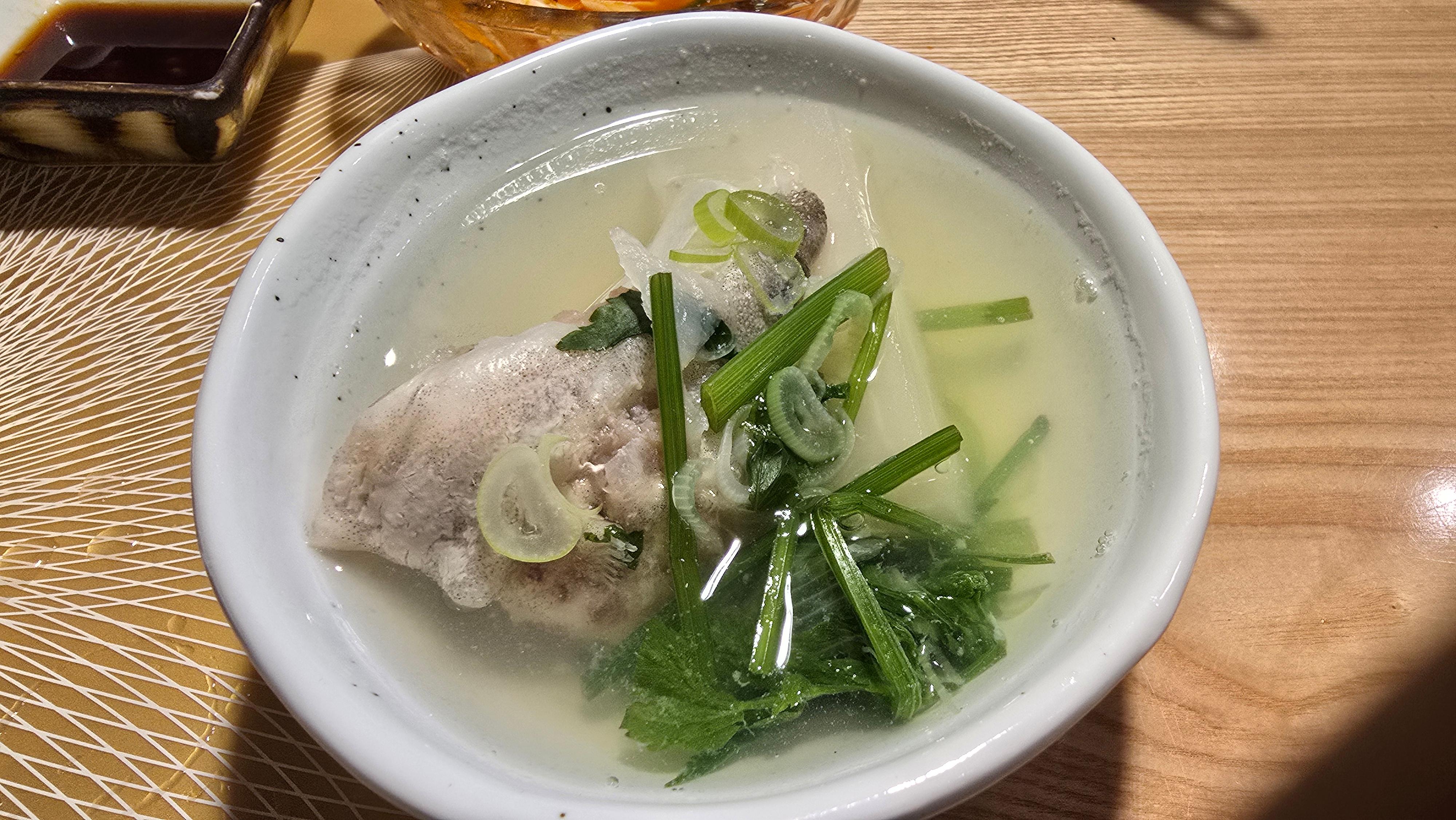 맛있게 즐기다보니 따뜻한 국물로 마무리를 하고 싶어 나온 지리탕을 맛보니 역시 적당한 간에 생선육수가 스며들어 감칠맛이 넘치며 비리지 않게 조리한 기술에 감탄하며 남은 술을 모조리 비워버리고 술을 깰려고 탕을 시켰는데 추가적으로 술을 주문하게 되는 상황을 맞이하게 됩니다.