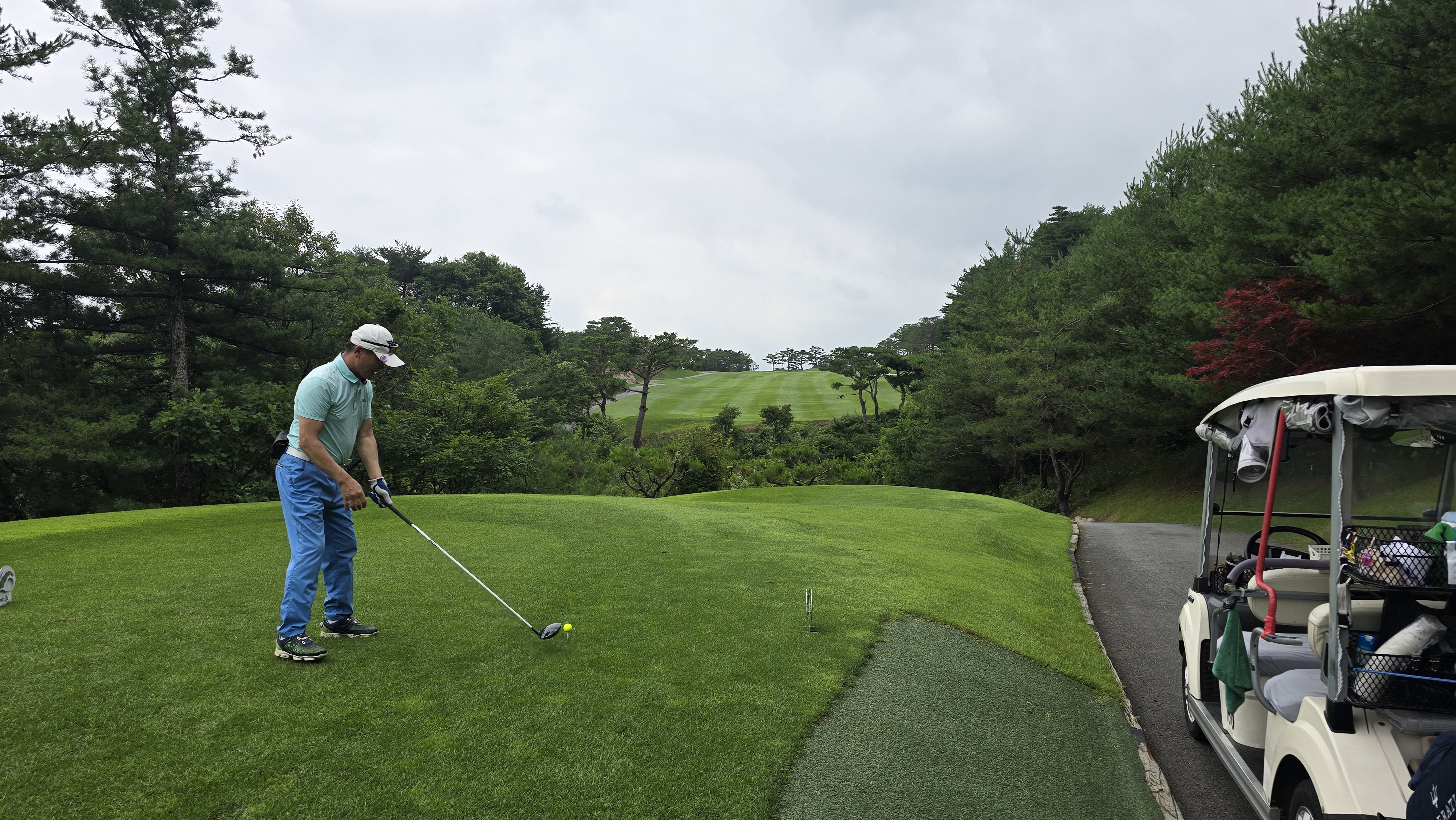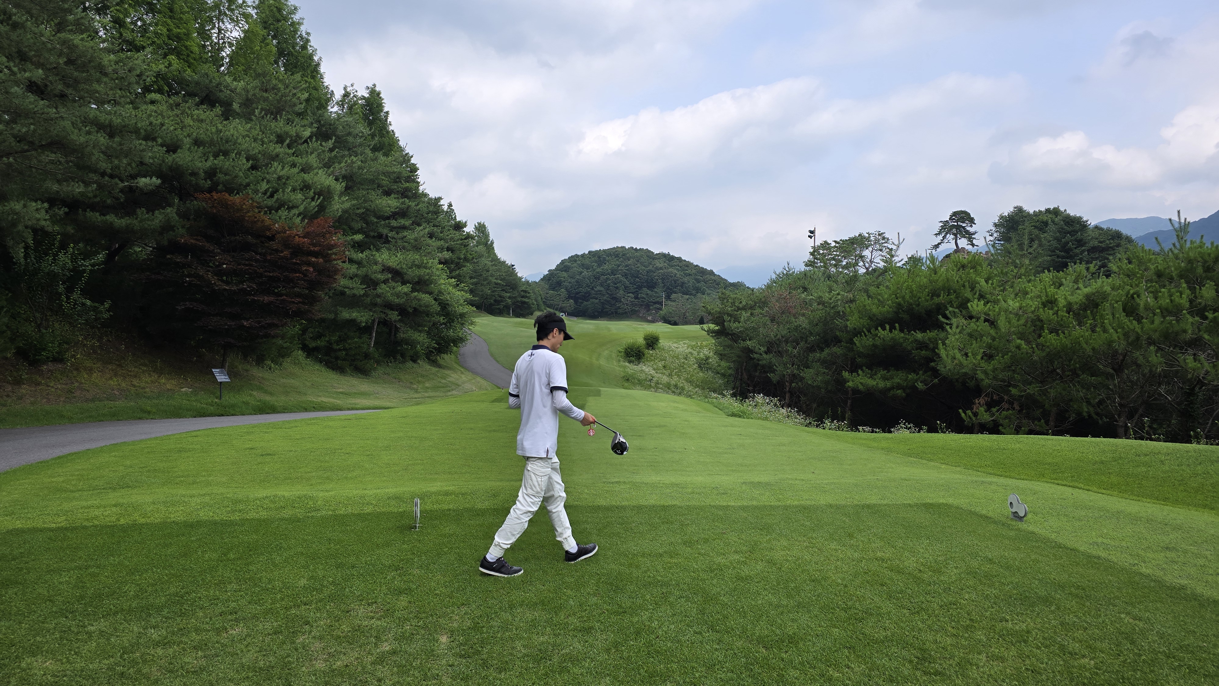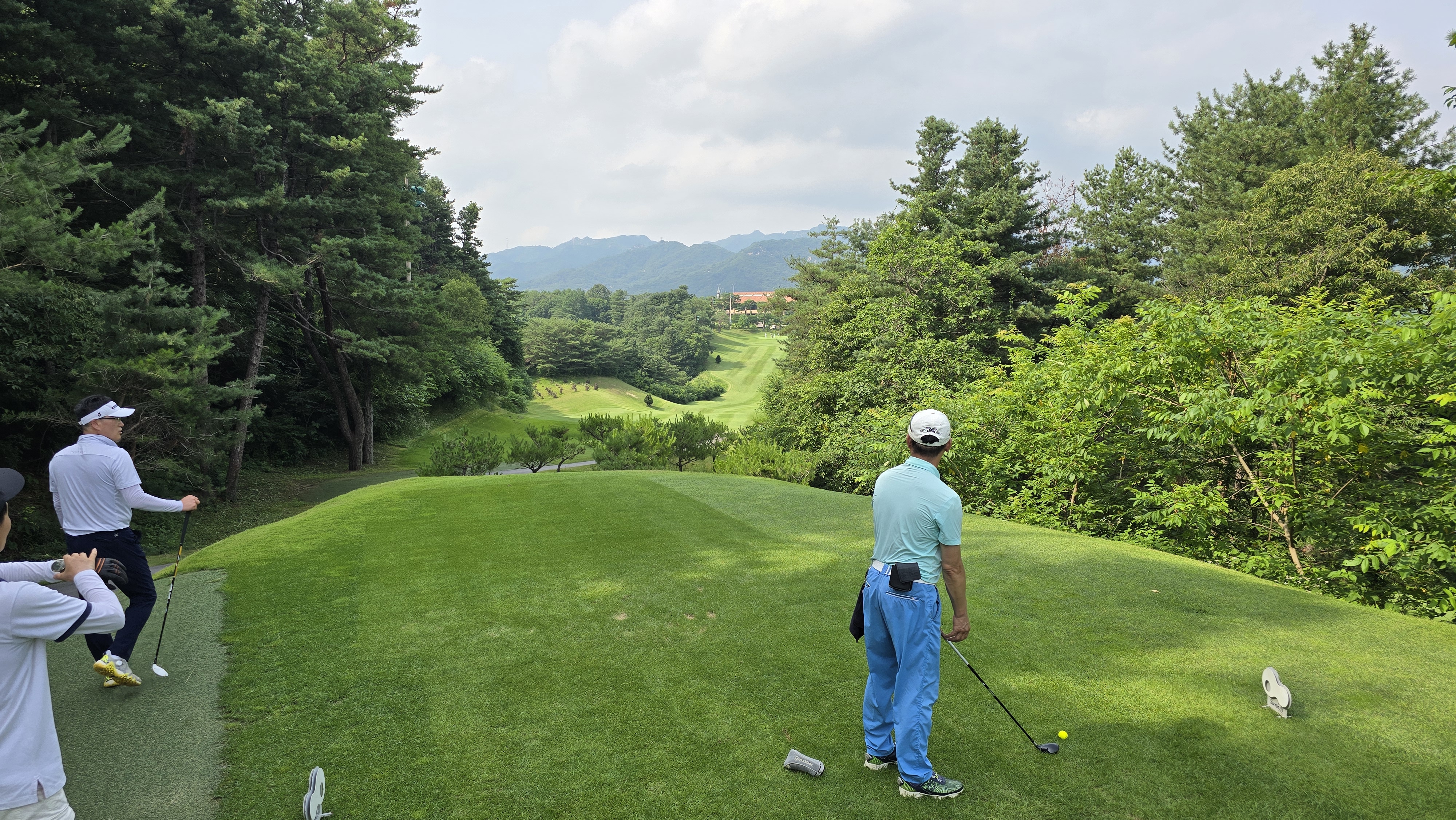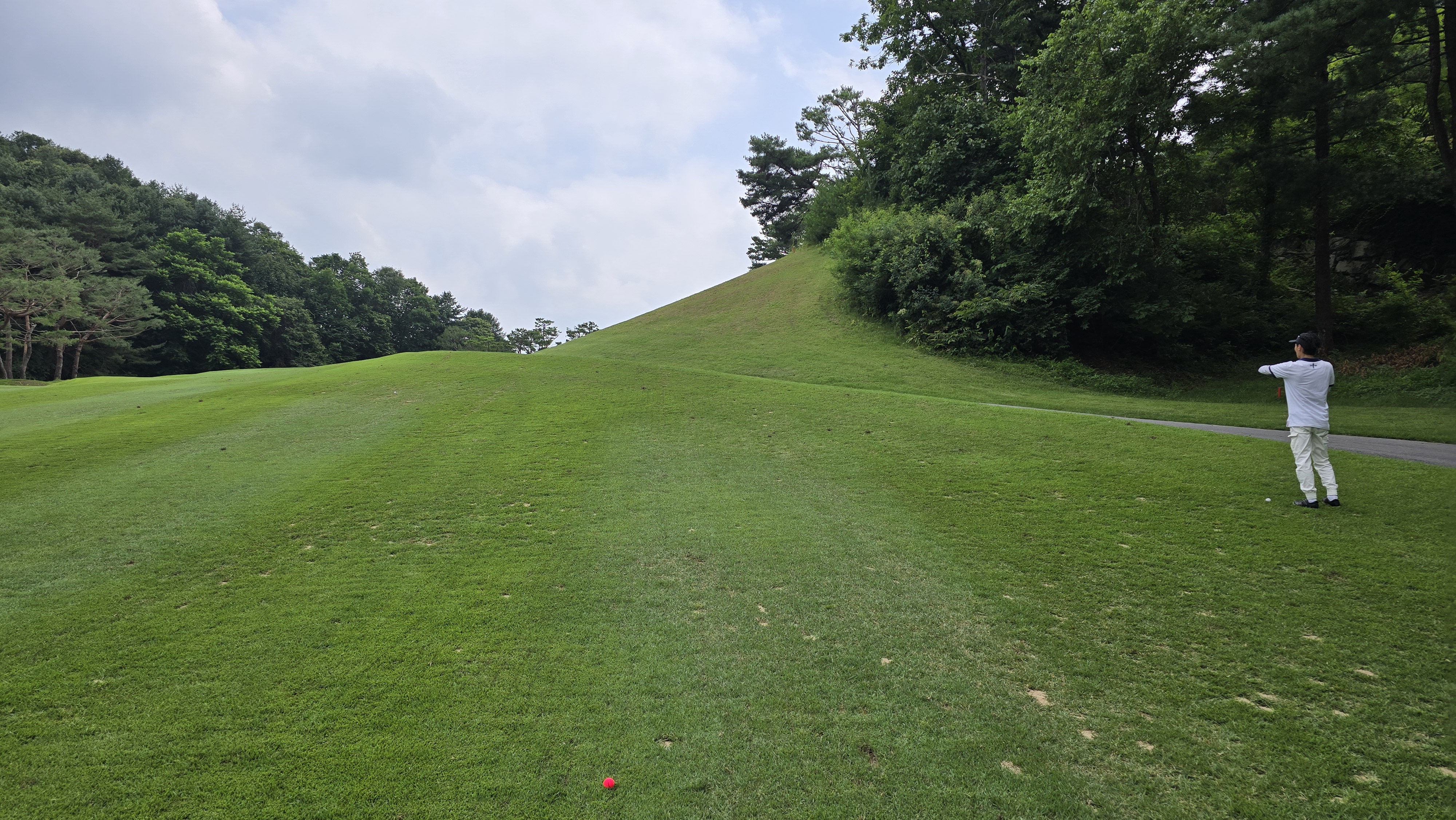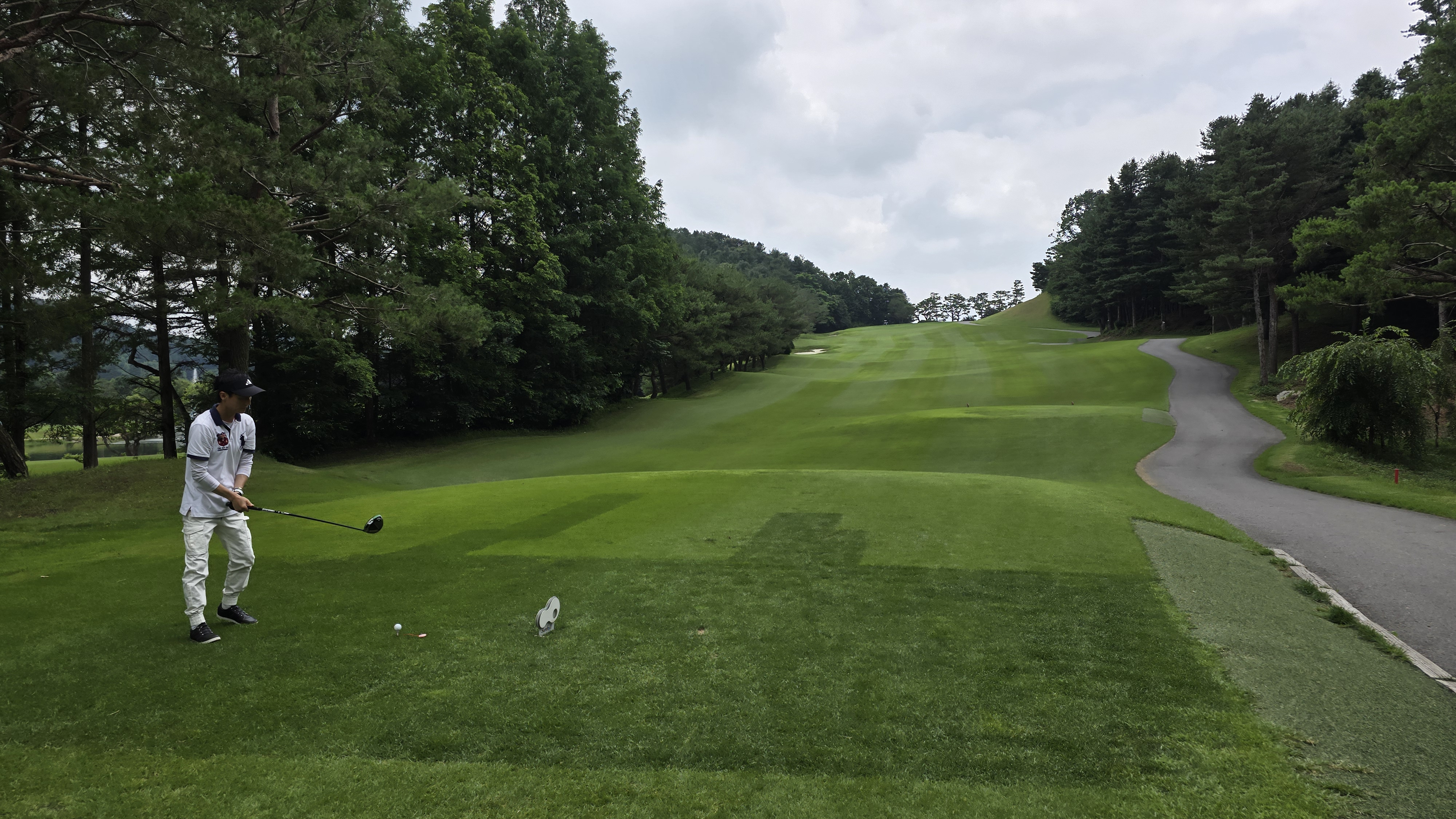 소나무 약간 왼쪽 방향으로 안정적으로 티샷하는 모습을 담아봅니다만 비거리가 200m 이상 나오는데 드로우가 걸리지 않아 경사 법면에 자리하게 되는 장면을 담아봅니다. 결코 만만한 홀이 아님을 알 수 있습니다.
