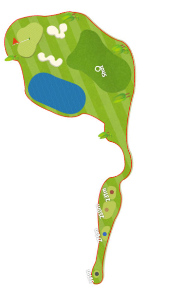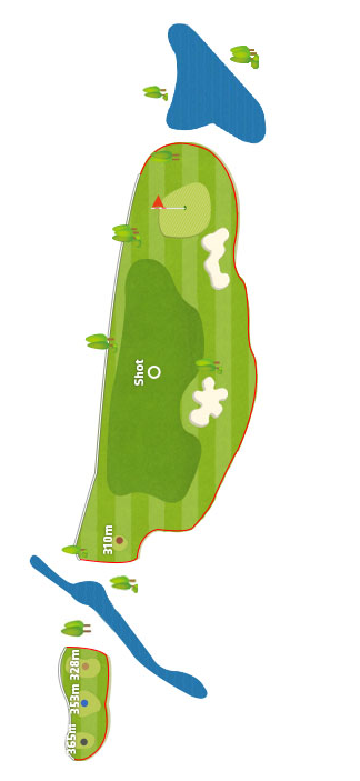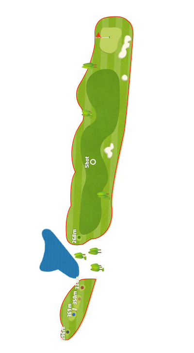 파인코스 2번 330m 전장의 우도그렉 파4홀로 호수방향 슬라이스가 나도록 설계되어 있어 정면 그린 왼쪽을 겨냥하는 것이 안정적입니다. 왼쪽으로 탄도가 난다해도 언덕 법면이 받아주기 때문에 안정적으로 세컨샷을 할 수 있으며 슬라이스만 조심하면 안전하게 마무리가 가능합니다.