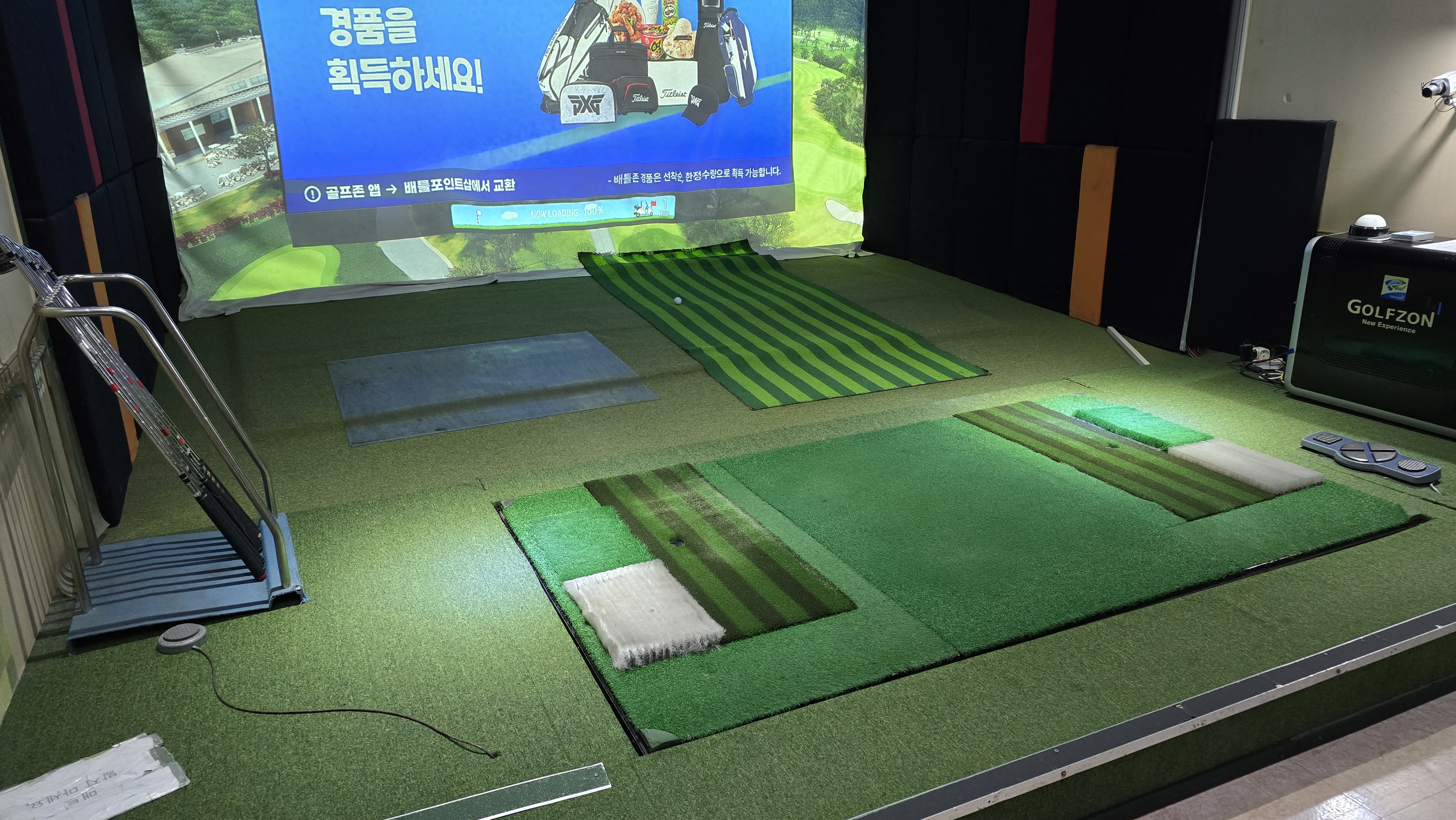 타석을 살펴보니 골프존 비전플러스 시스템으로 좌타석 우타석 모두 플레이가 가능한 매트를 보여주고 있습니다. 앞쪽에 퍼팅을 쉽게 하기 위함 인지 줄무늬 매트가 스크린까지 이어져 있는게 참으로 재미있어 보입니다.