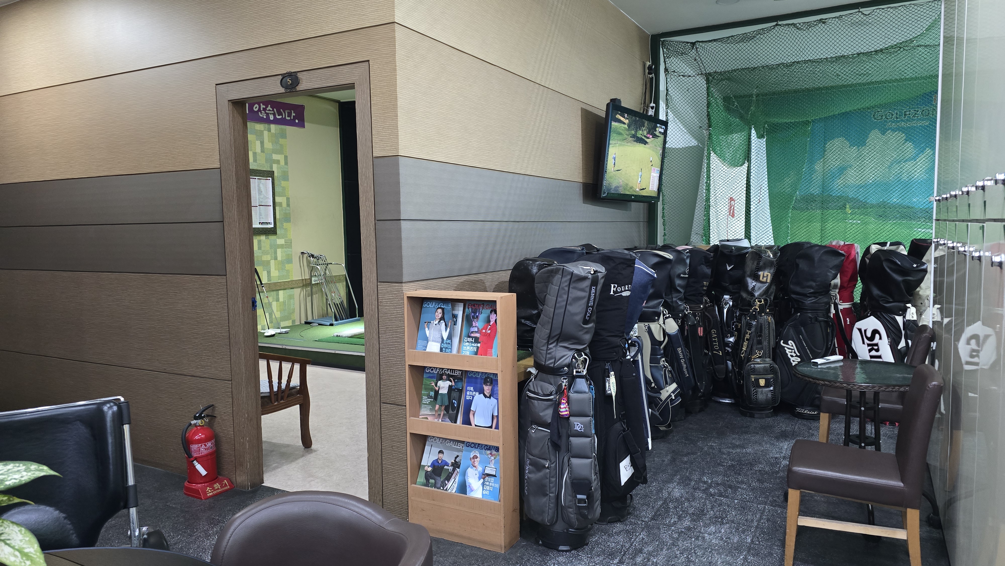 내려가서 매장을 살펴보니 오픈한지 조금 연식이 되어 보이는 인테리어지만 내부를 보니 총 4~5개의 방이 보이는데 꽉차있고 골프백이 지나다닐 틈없이 한쪽 구석에 진열되어 있는 것과 뒤쪽으로는 연습장이 설치되고 많은사람들이 인사를 주고 받는 것으로 보아 지역주민들이 아지트로 사용하고 있는 곳이라는 느낌이 강하게 전달되고 있습니다.