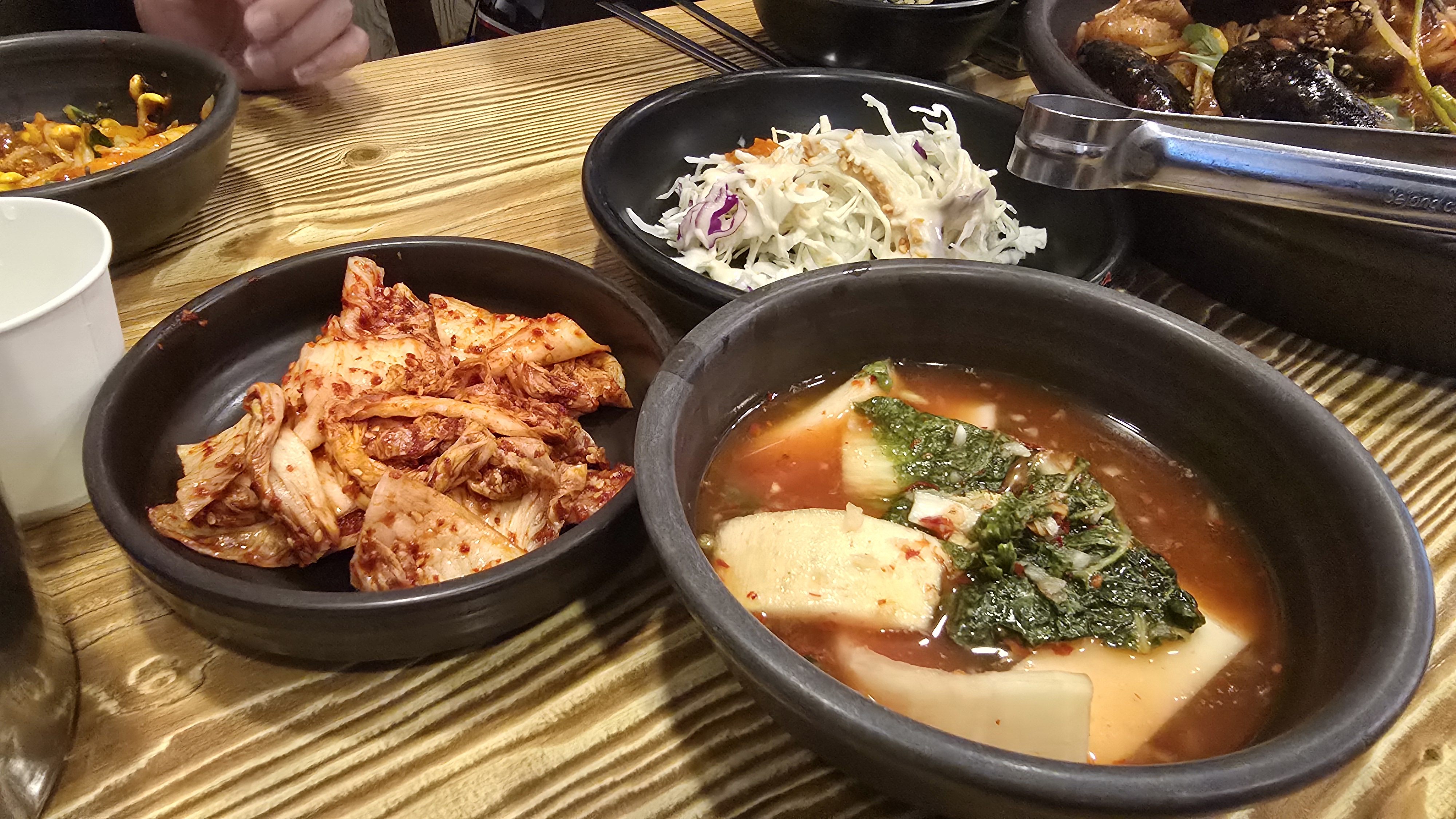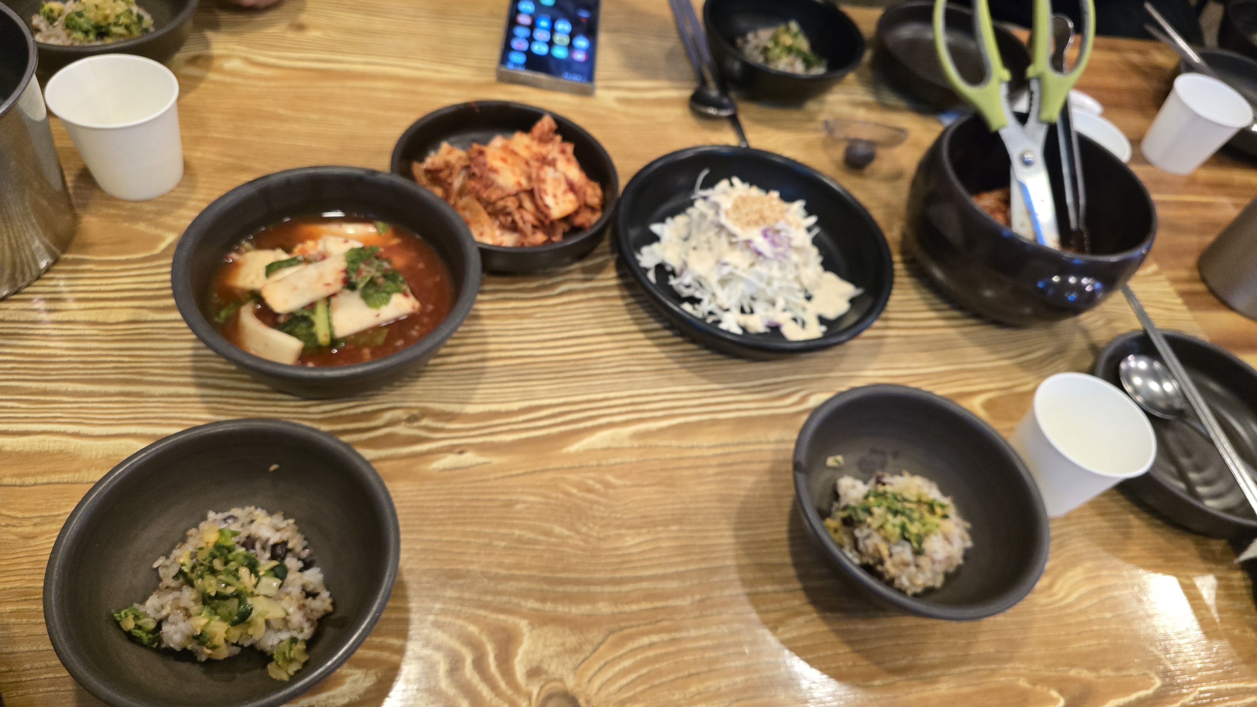 주문을 마치니 가장 먼저 밑반찬을 세팅해주십니다. 보리밥과 샐러드, 겉절이, 물김치가 나오며 식전에 먹기에 알맞은 구성으로 입맛을 상쾌하게 바꿔놓는 역할을 합니다.