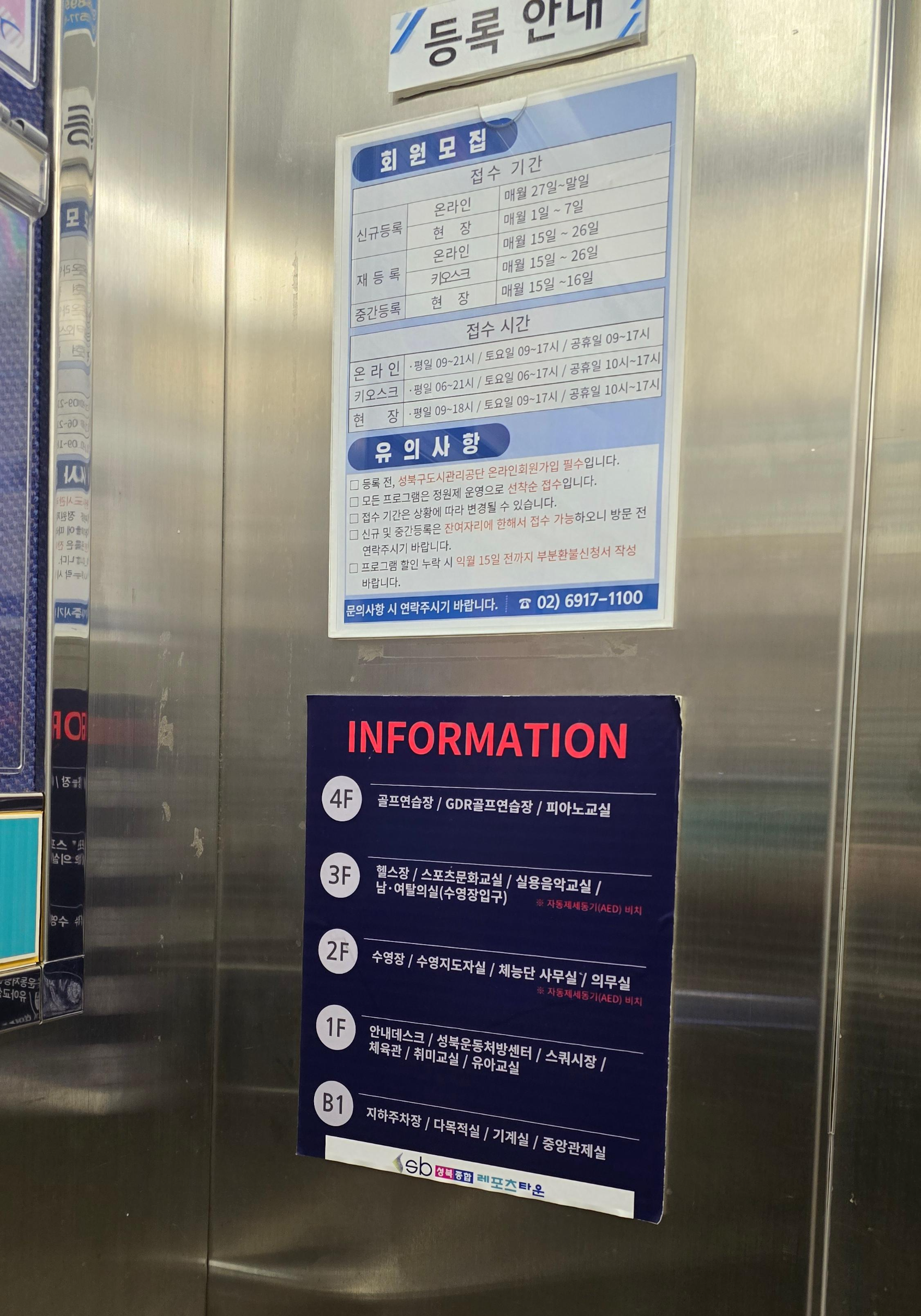 성북종합레포츠타운은 층별로 여러 레포츠를 즐길수 있는것을 표시하고 있으며 골프, 피아노, 헬스, 실용음악, 수영, 스쿼시 등 여러가지 레포츠를 즐길 수 있고 어린이들을 위해 저렴한 운동 프로그램도 운영하고 있기 때문에 인기가 많은 곳입니다. 꼭 성북구 주민만 등록할 수 있는 시스템은 아니니 원하는 레포츠를 선택하면 회원카드를 만들어주고 정기권 혹은 일반권을 선택하면 앞으로 회원권을 들고 즐길 수 가 있는 시스템입니다.