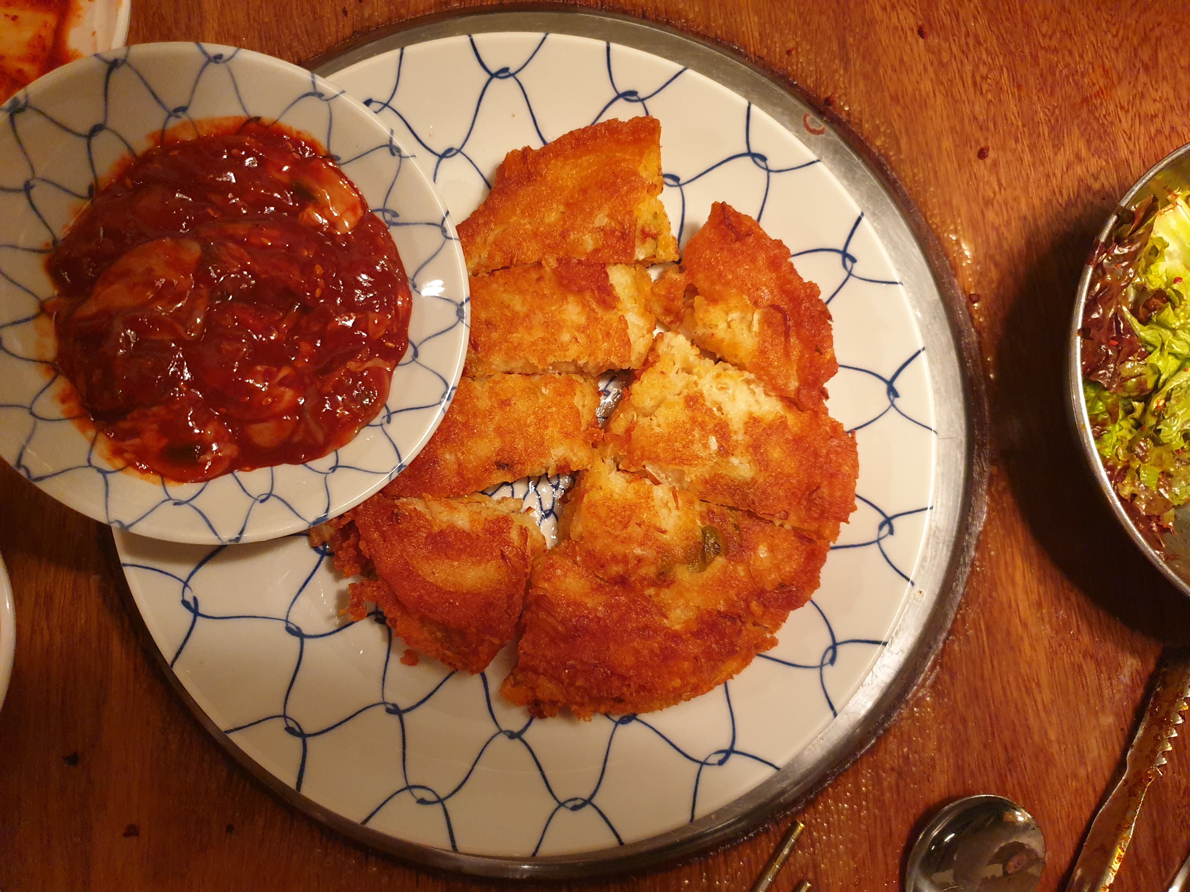 산꼼장어는 1인분당 양이 매우 적습니다. 산꼼장어를 순식간에 해치우고 아까 매뉴판에서 눈여겨봤던 세트A. 빈대떡과 어리굴젓을 시켜봅니다.
