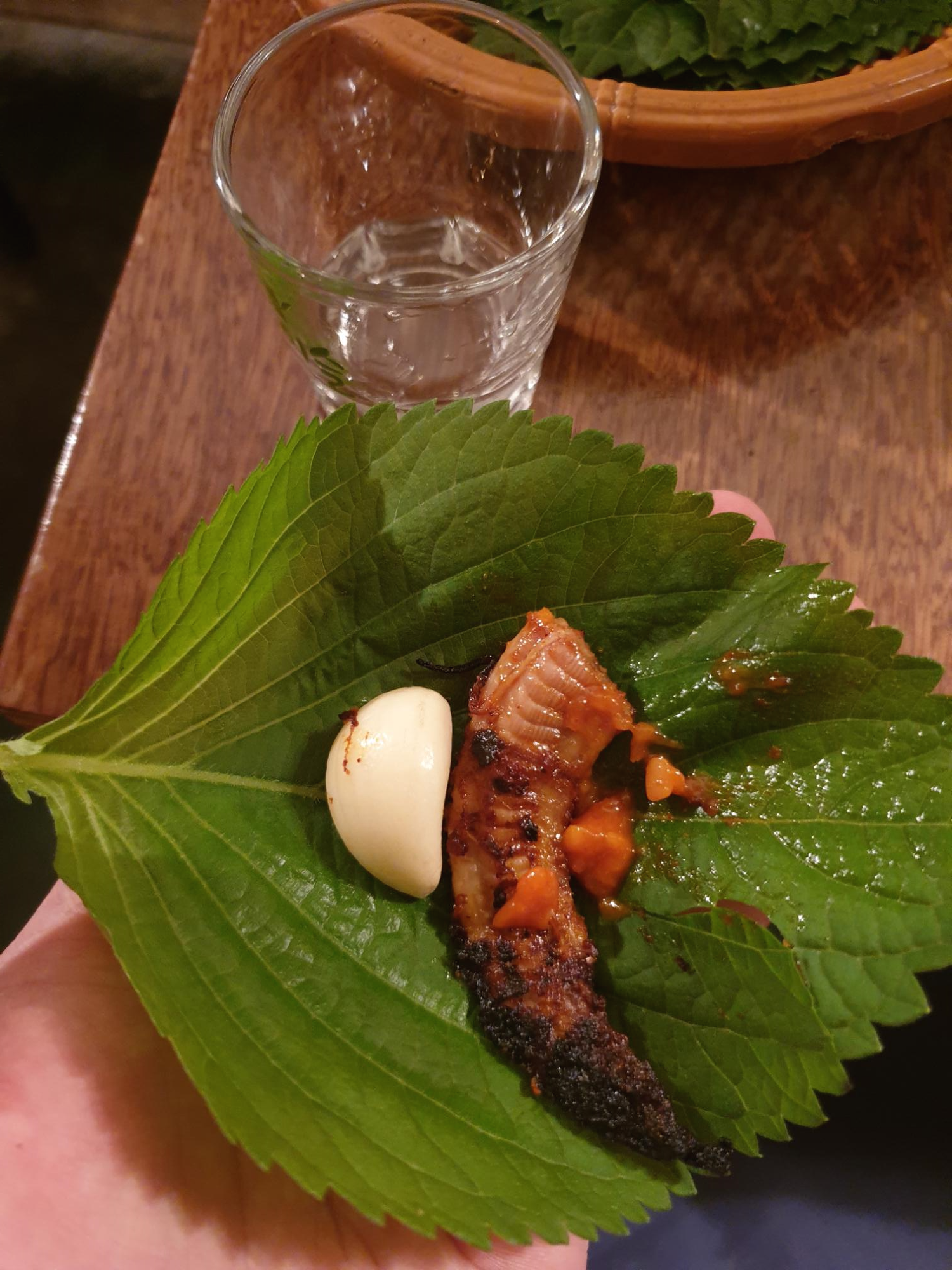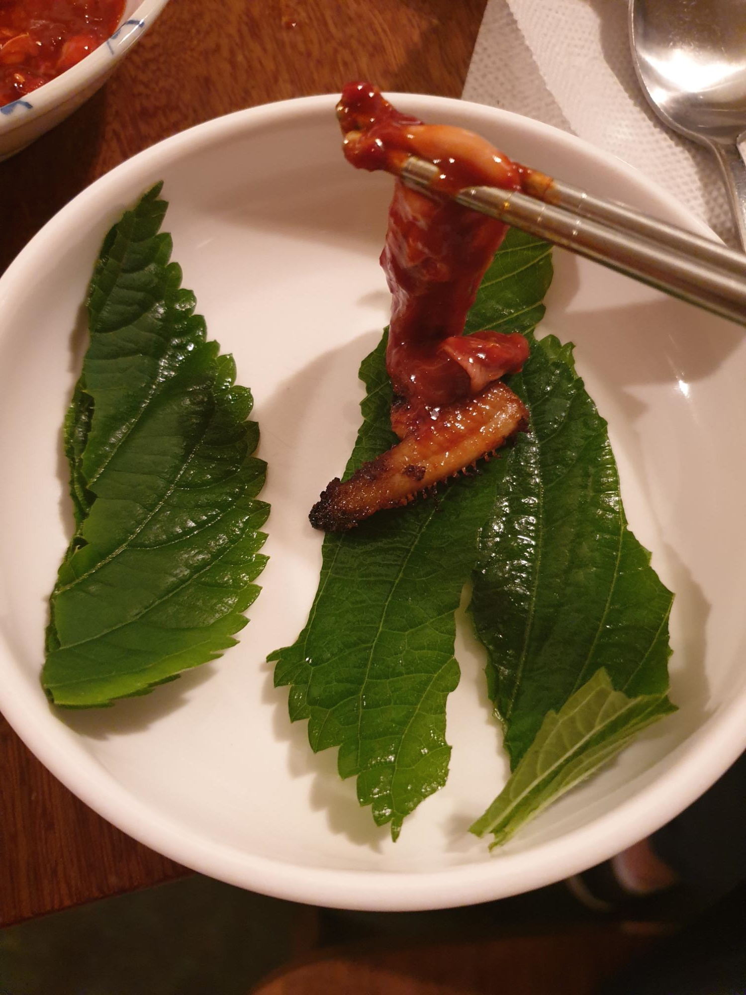 요번에는 꼼장어 꼬리를 깻잎에 얹어 마늘과 함께 싸먹습니다. 깻잎의 고소한맛이 배가되어 새로운맛을 느낄수 있습니다.