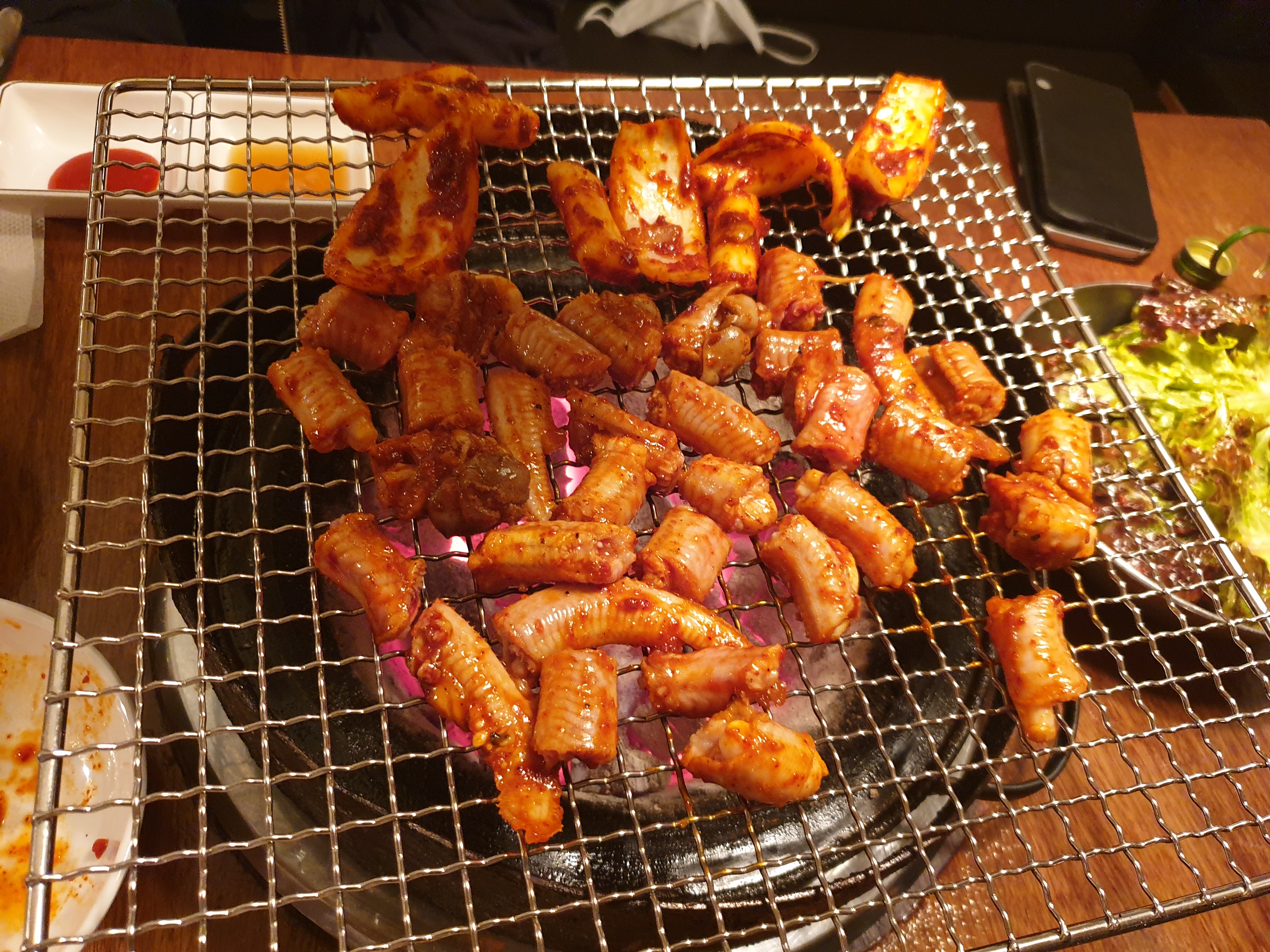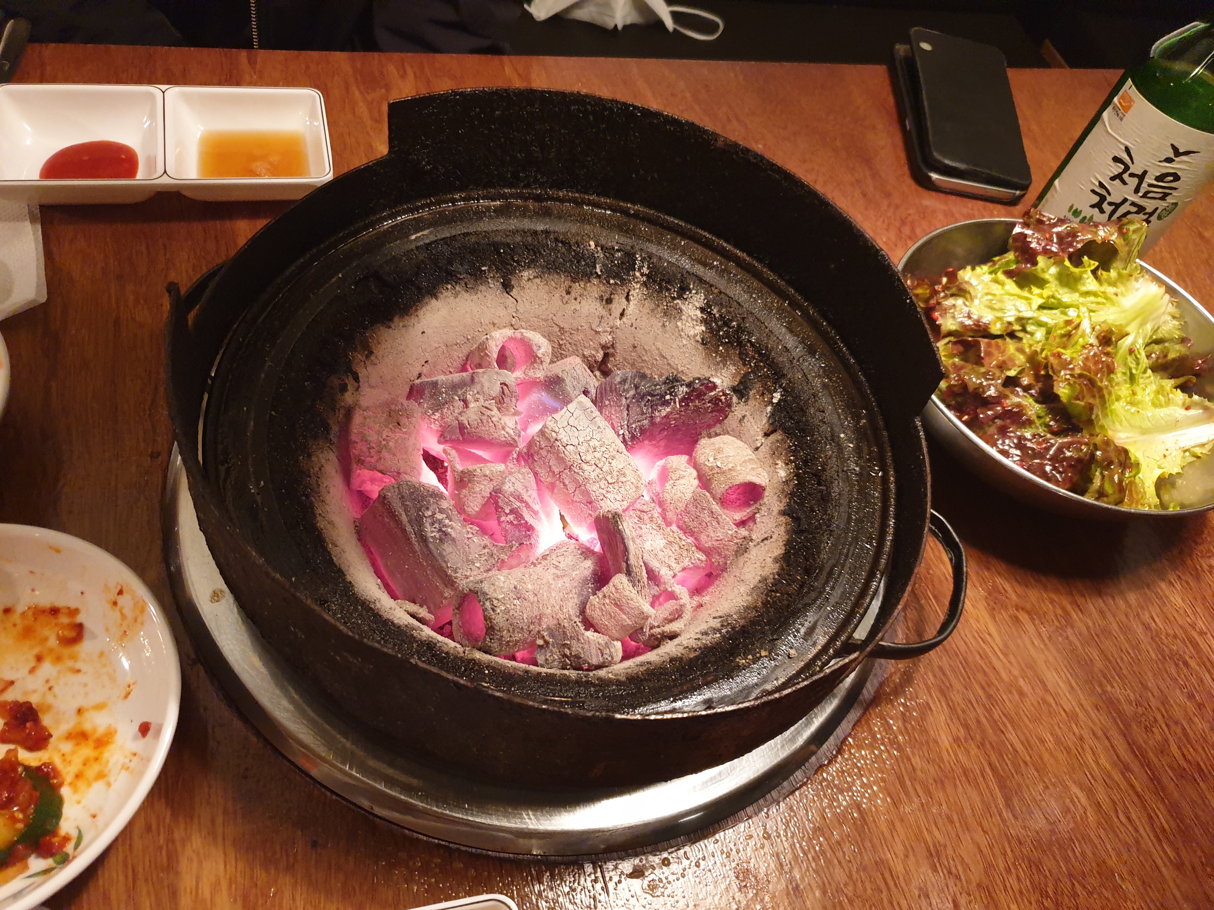 숯불이 나오고 산꼼장어를 보여주고는 "살아있죠?" 하고 확인하더니 다시 가져갑니다. 산꼼장어를 구울때 그 처절한 비주얼때문에 잘못먹는 손님들이 많으니 요즘은 산꼼장어를 보여주고 구워서 가져다 주나 봅니다. 저도 사실 산꼼장어는 맛있지만 굽는 모습은 보기 싫었는데 다행이라는 생각이 듭니다.