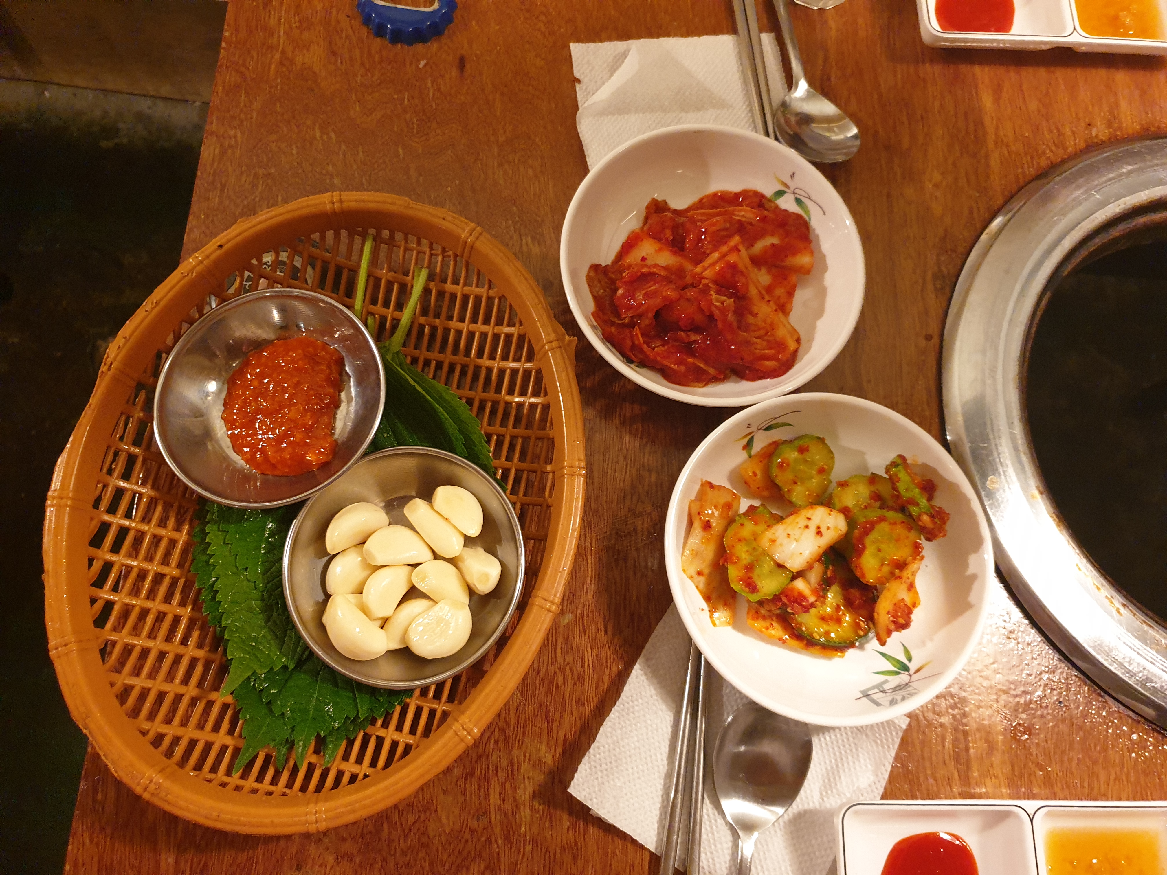 산꼼장어를 시키자 기본 밑반찬으로 오이와 김치가 나오고 깻잎과 마늘, 소스가 나옵니다. 오이의 무침정도가 아주 좋습니다.