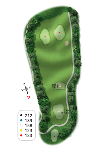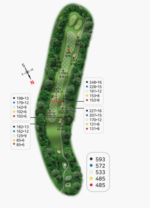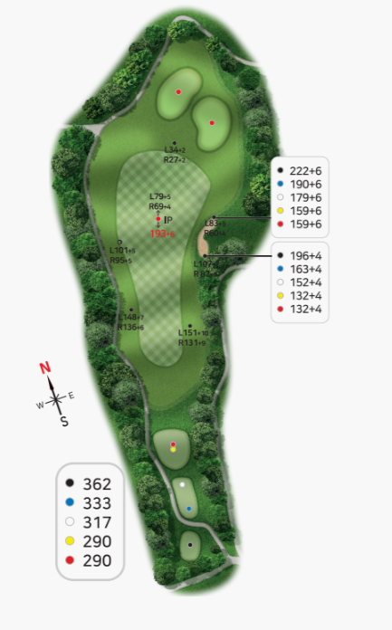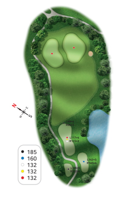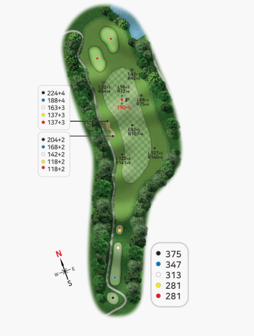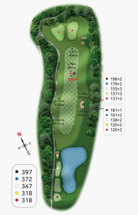 안전하게 마무리하느냐 모험으로 이글을 노리느냐 선택할 수 있으며 마무리 내기를 하는경우 매우매우 주의를 요하는 코스가 될수있습니다.