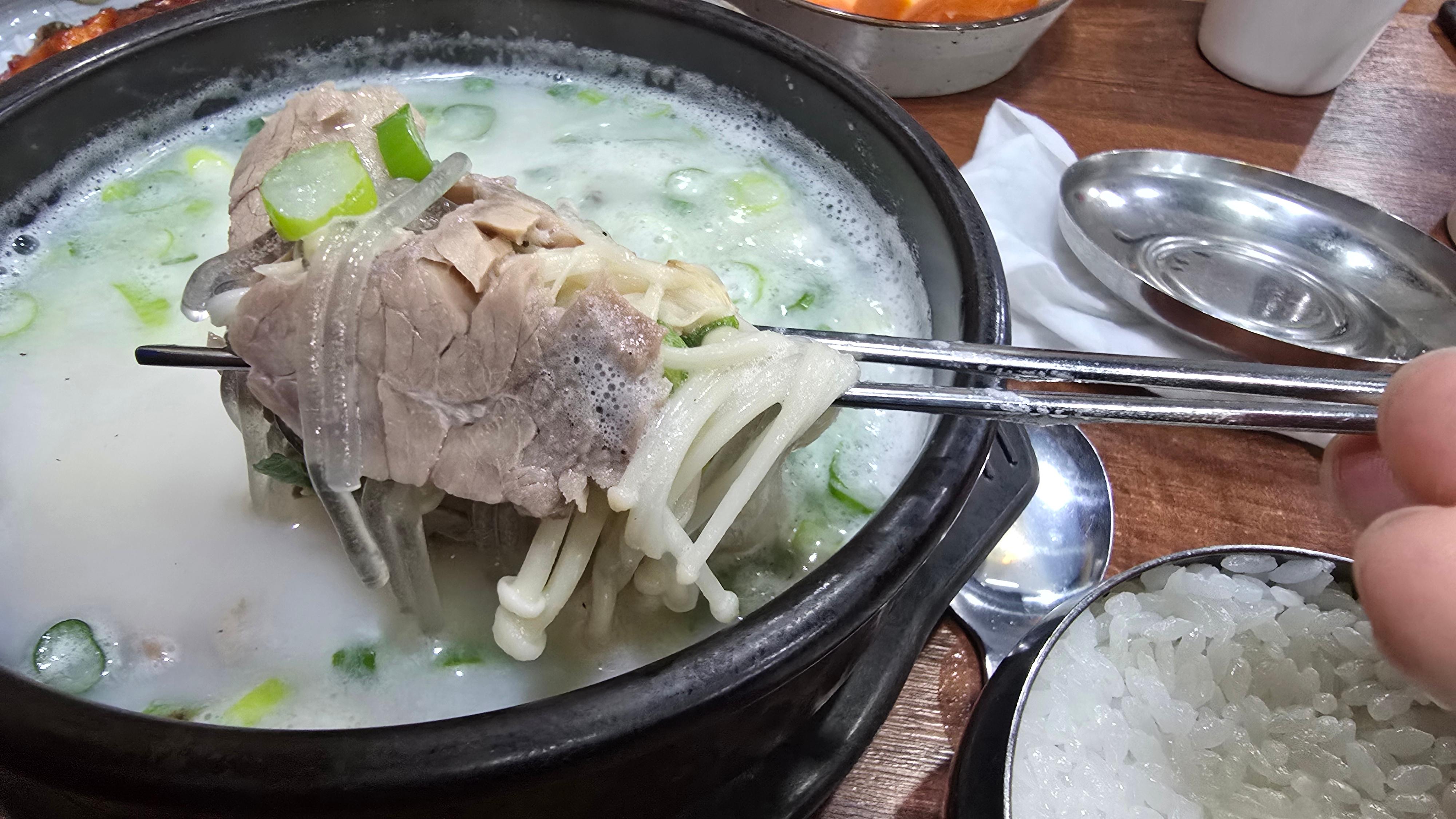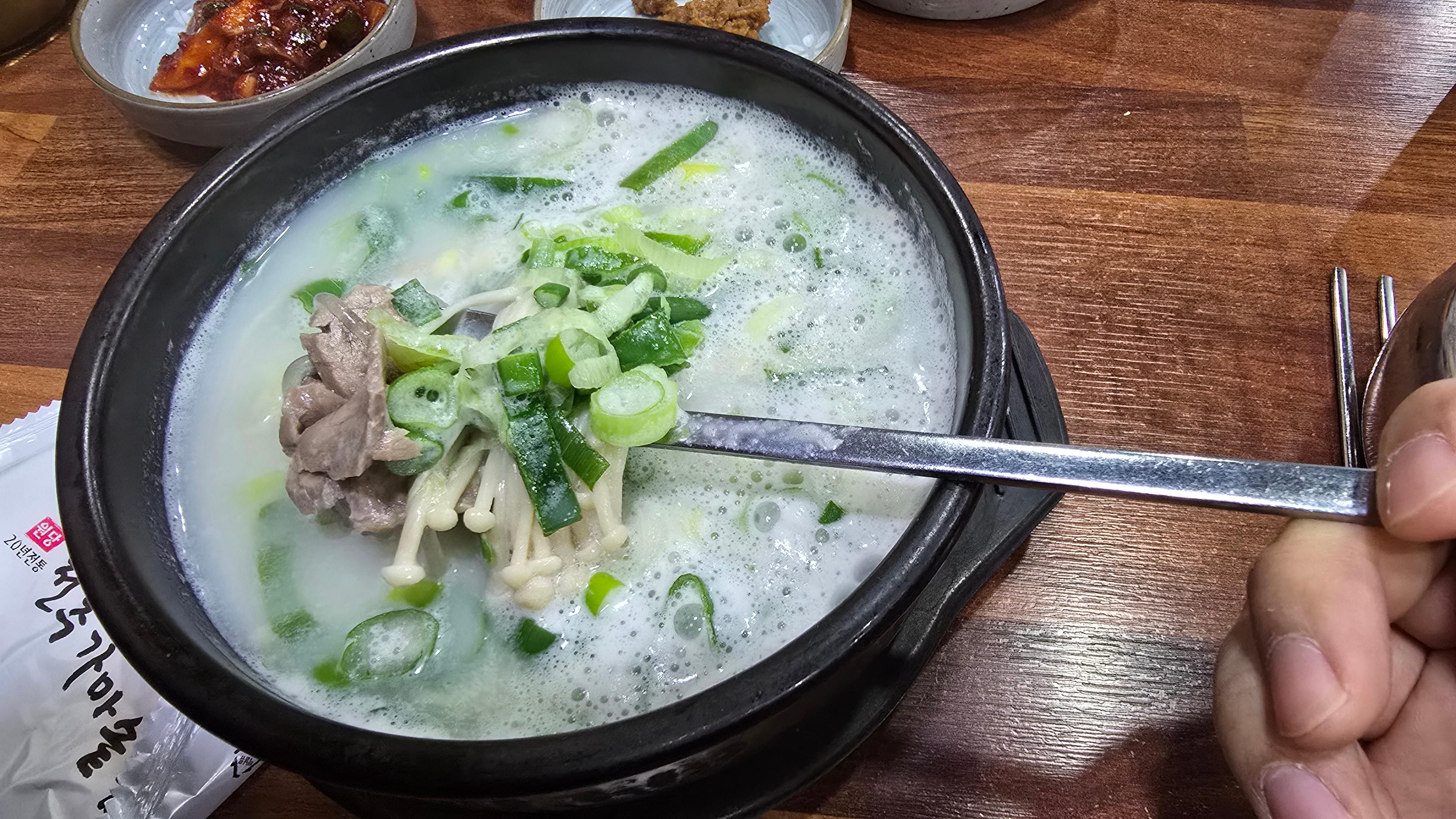 이것 저것 반찬을 맛보는동안 곰탕이 나와서 내용물을 살펴보니 고소한 곰탕국물에 고기와 면 그리고 야채들이 들어가 있는 모습을 보게 됩니다. 기본적인 곰탕이라 내용물은 약간 부실하지만 고소한 맛의 곰탕국물은 먹기 좋고 매운 김치와도 케미가 잘 맞기 때문에 무척 순조롭게 느껴지고 있습니다.