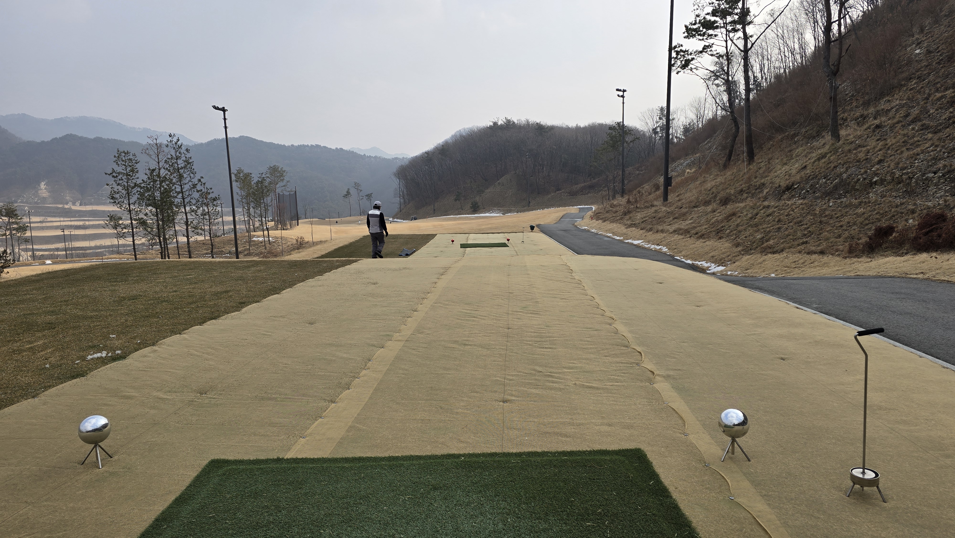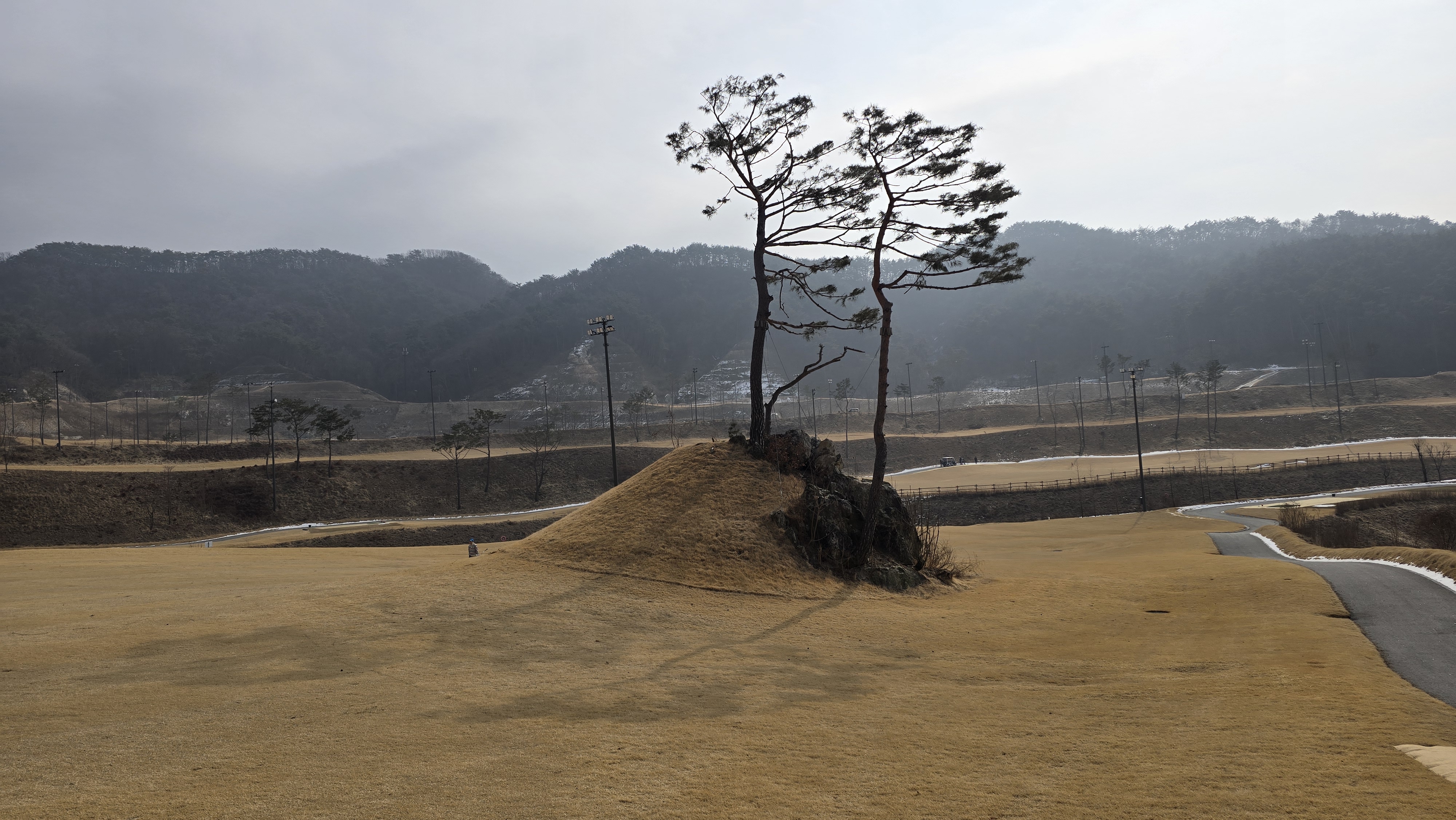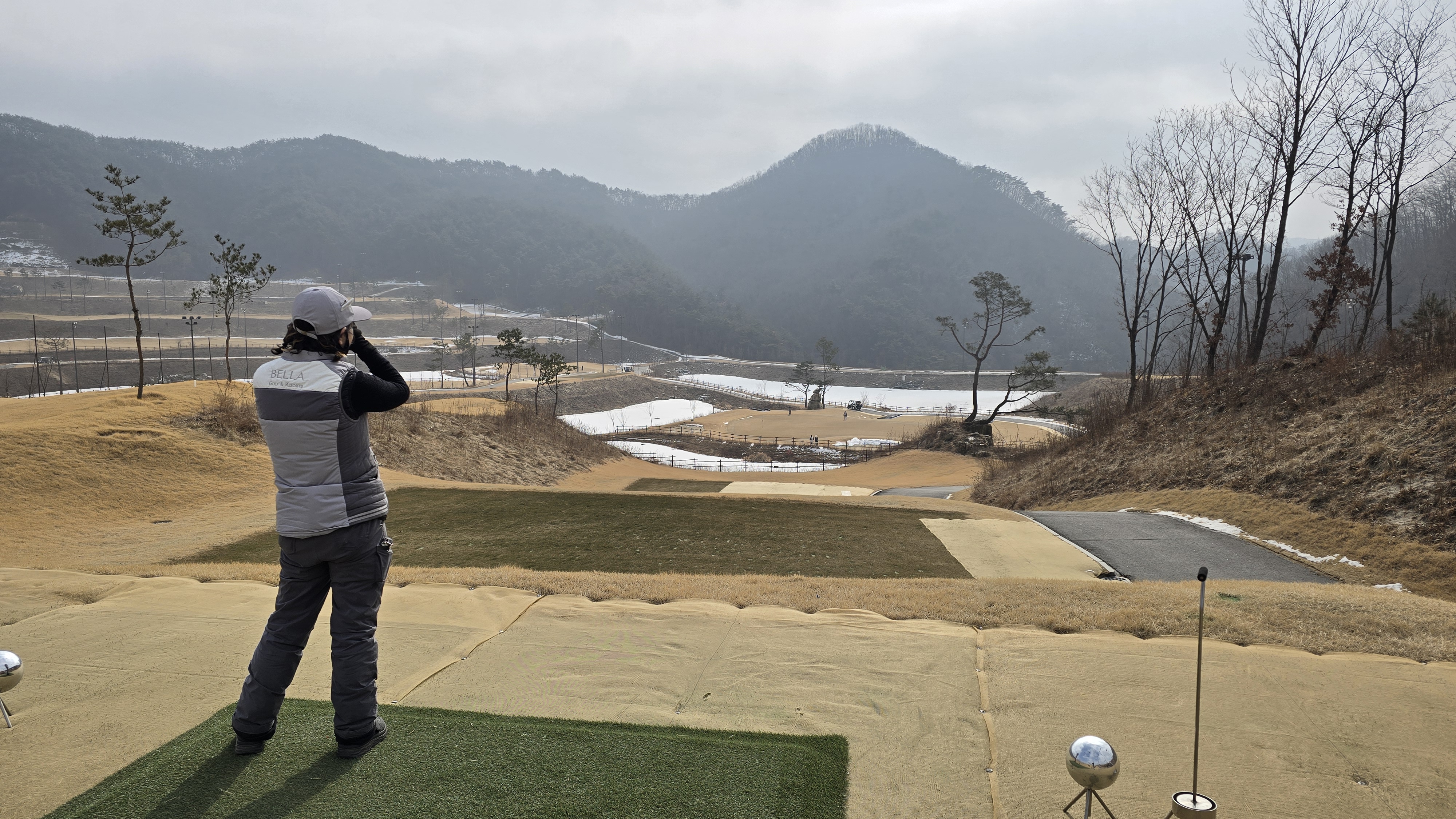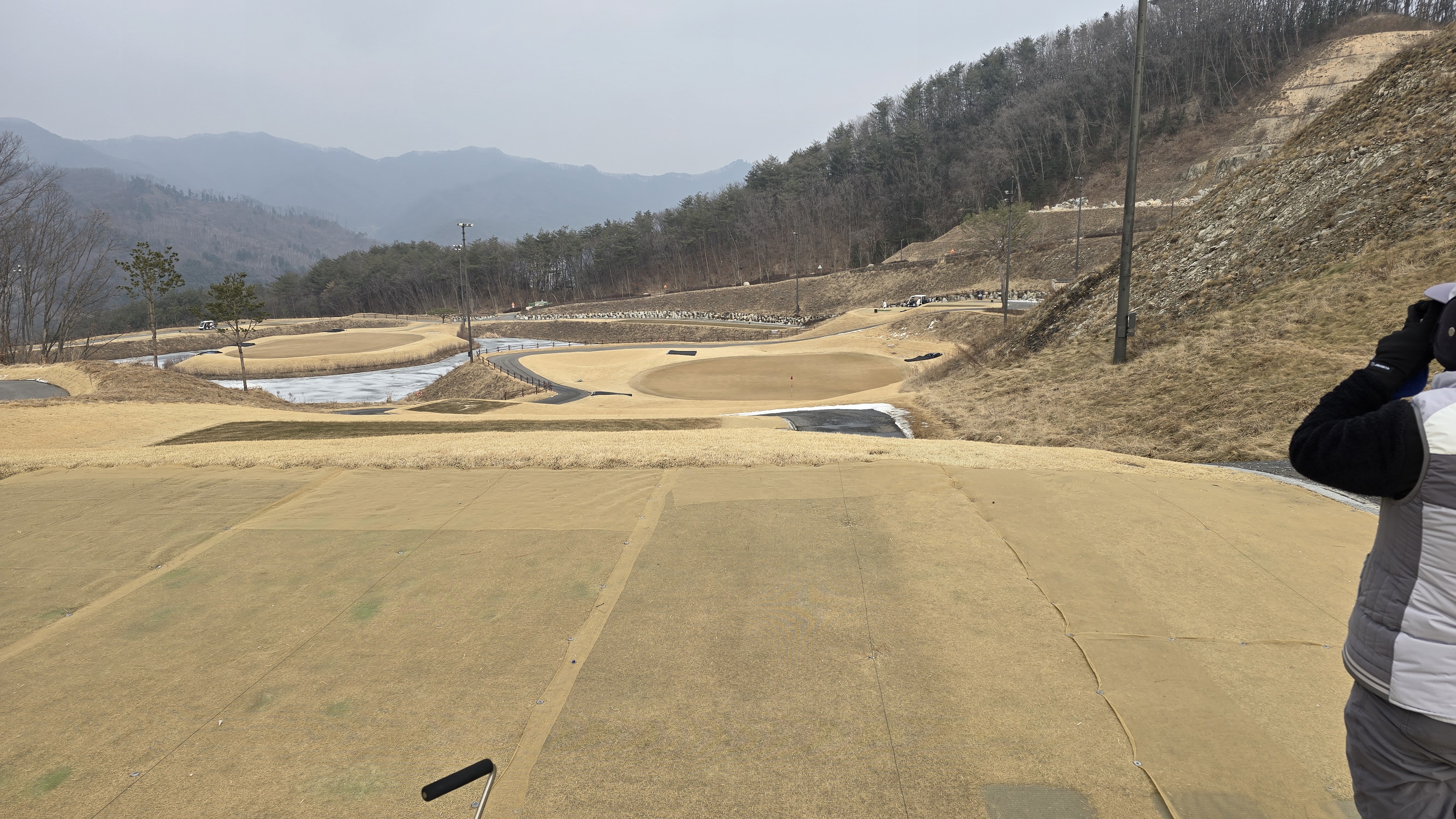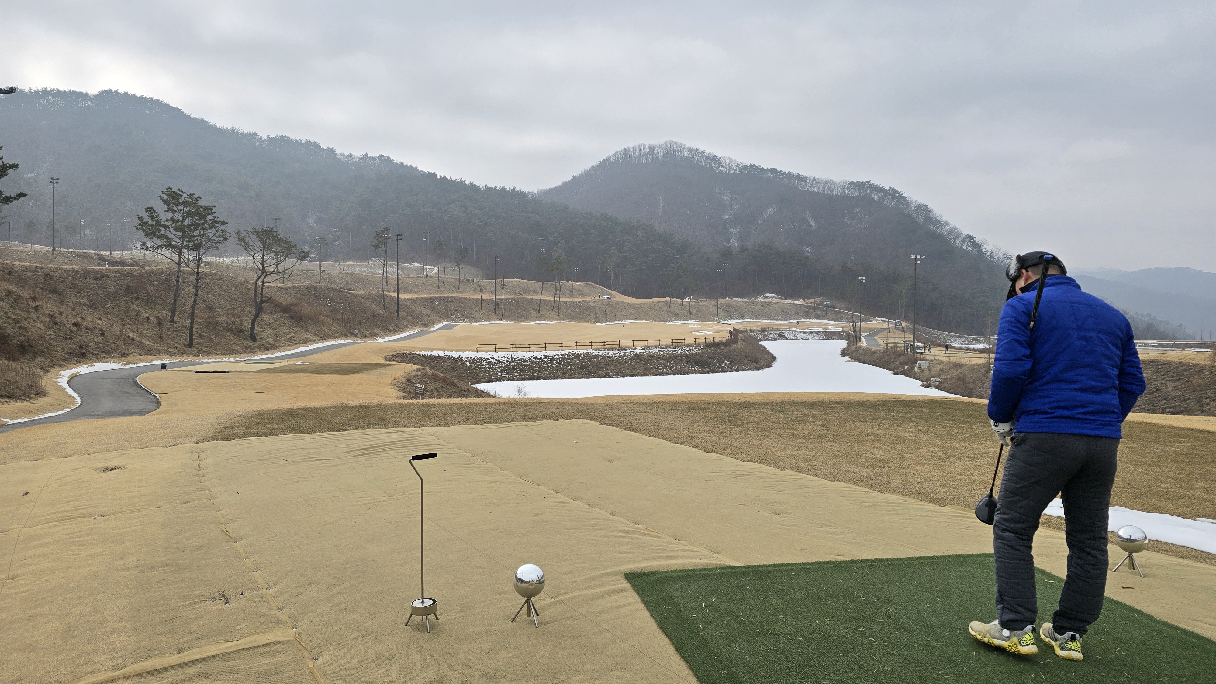 8번 460m 오르막 파5로 원래대로라면 호수를 넘겨 좁은 페이웨이에 티샷을 보내야 하는 어려운 홀이지만 겨울이라 그런지 화이트티를 무척 앞으로 빼놔서 상대적으로 쉽게 느껴집니다. 티샷방향과 그린방향이 일치하기 때문에 장타만 날리면 2온이 가능한 상황이 되어버렸습니다.