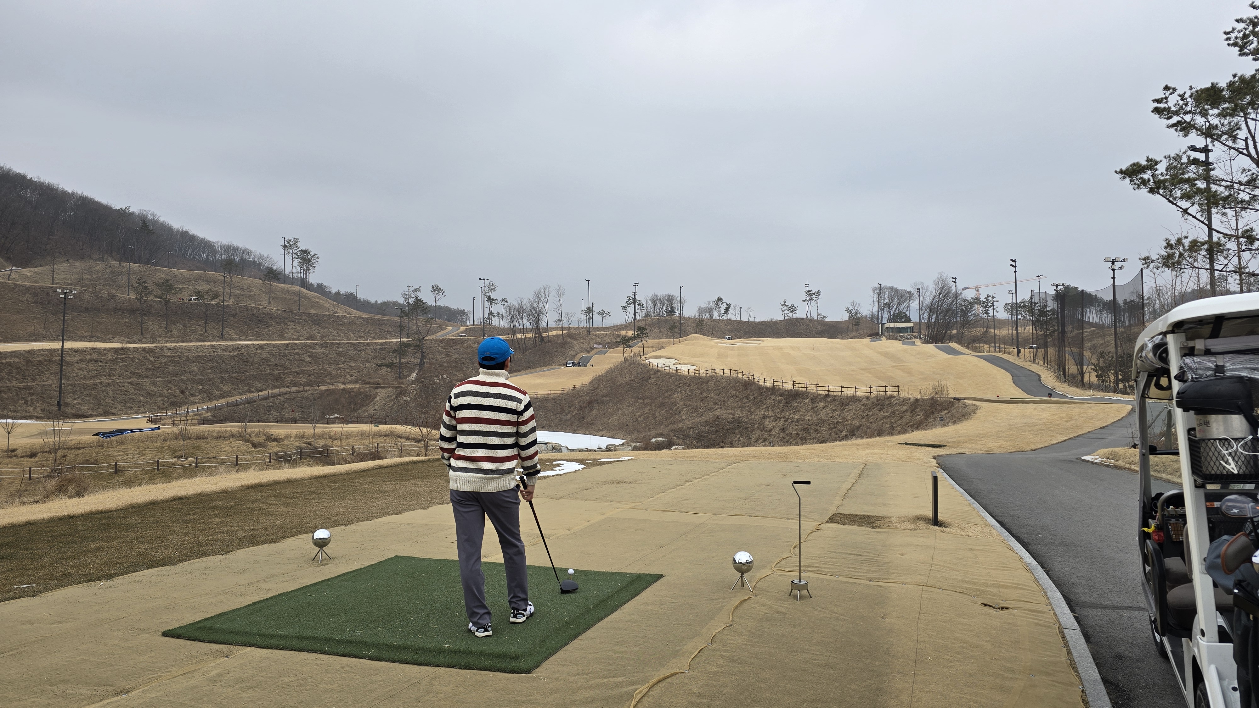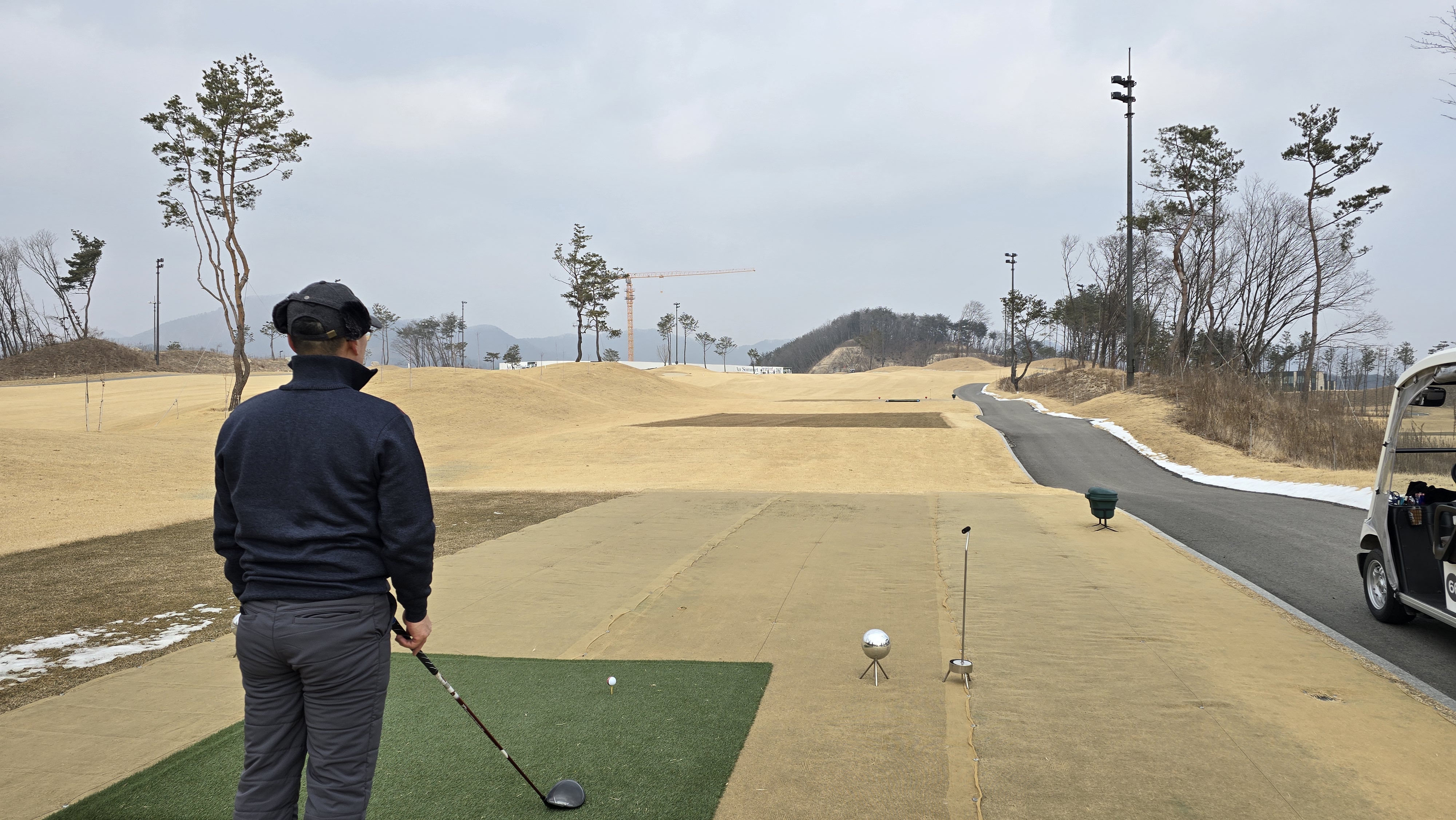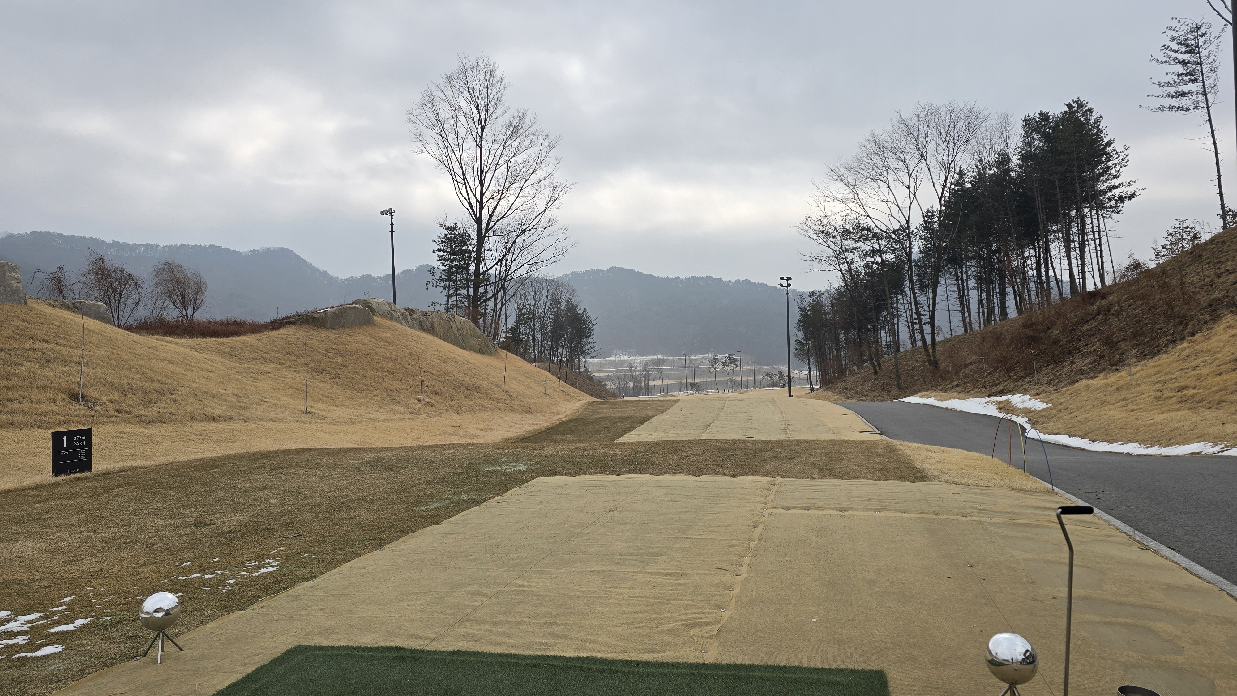 마스터즈 D코스 1번 396m의 파4 롱홀에서부터 시작합니다. 아직 겨울시즌이라 티샷구역은 매트가 깔려있으며 좌우 OB지역이라 힘이 들어갈수도 있습니다.