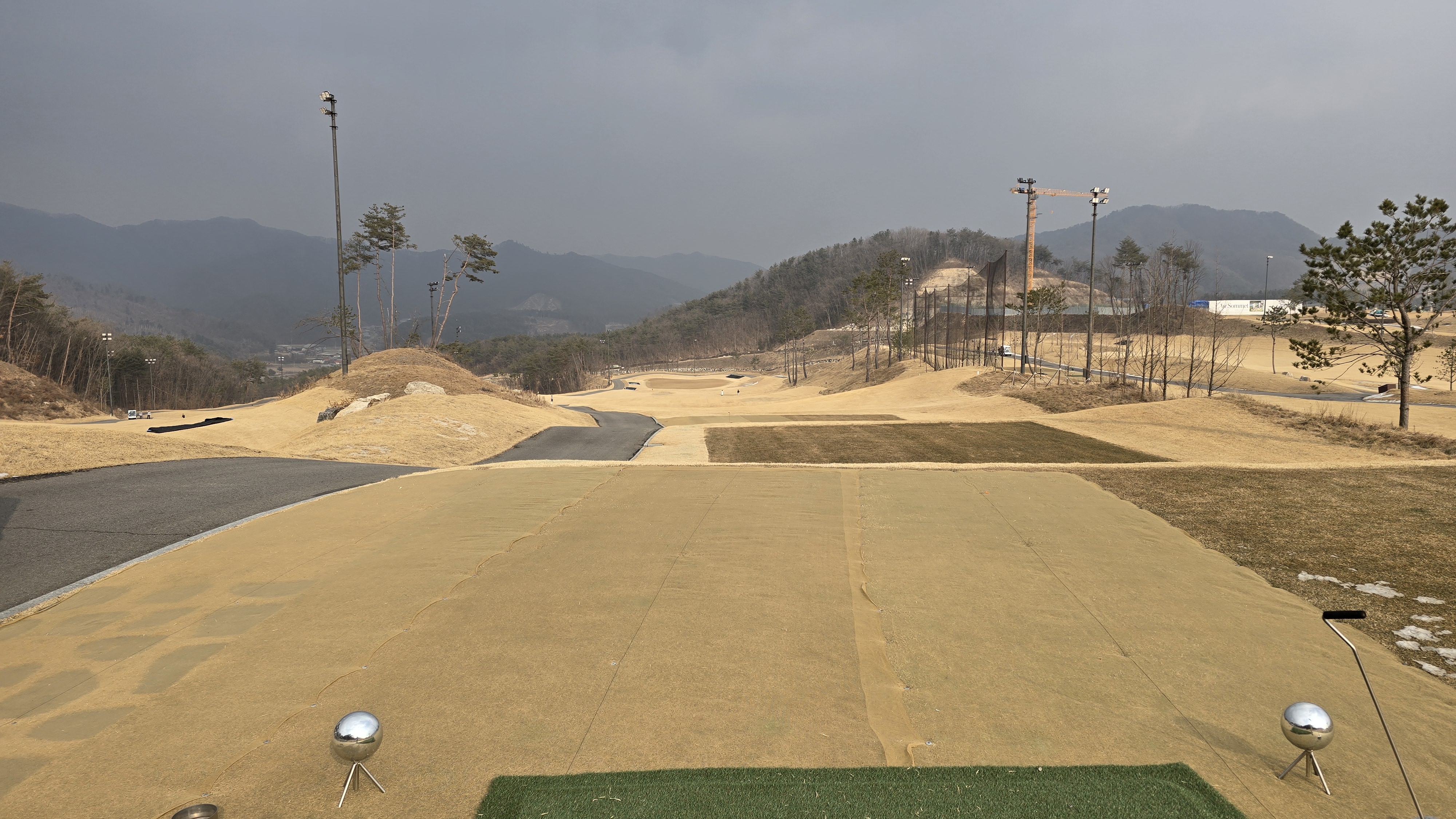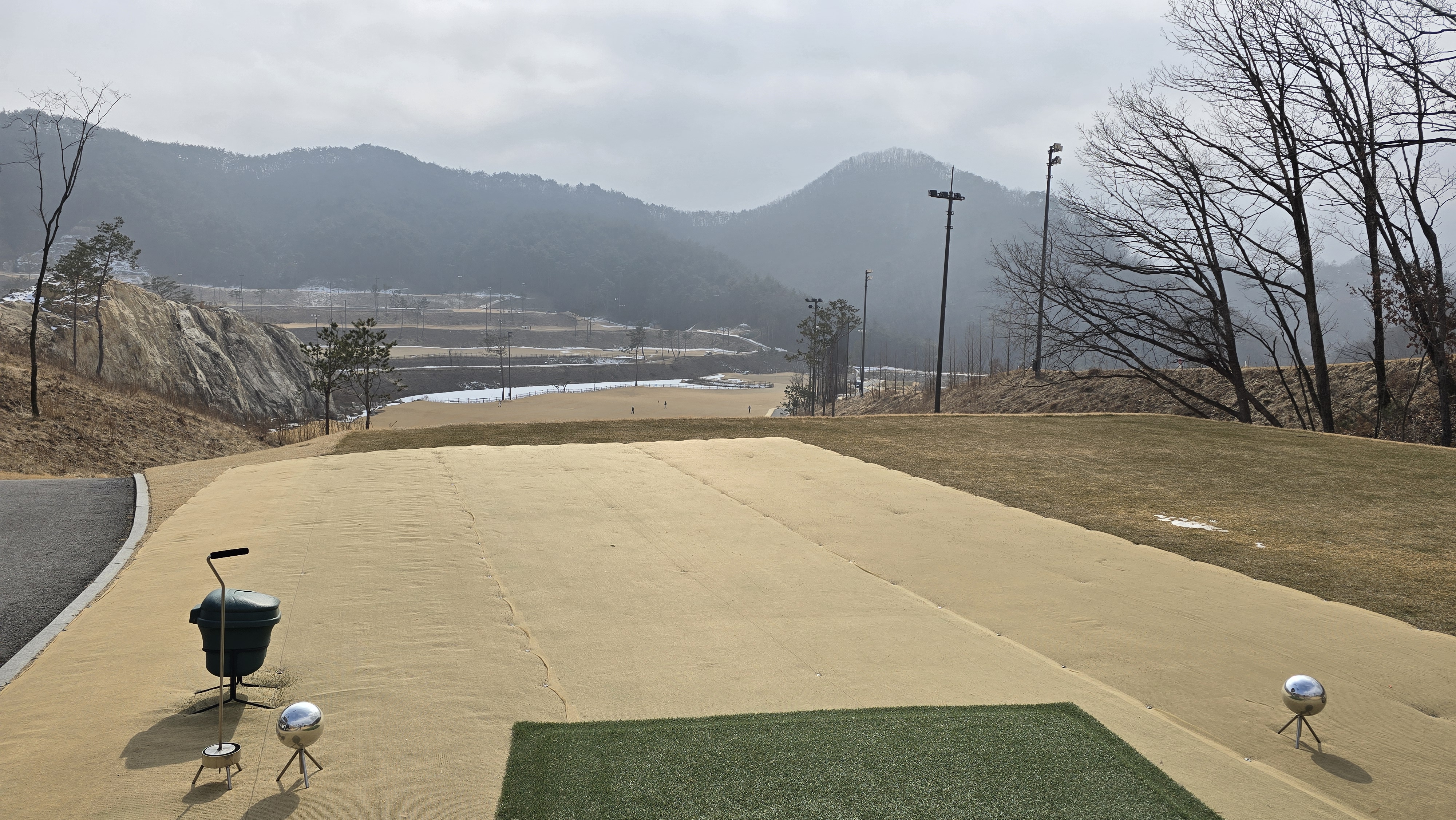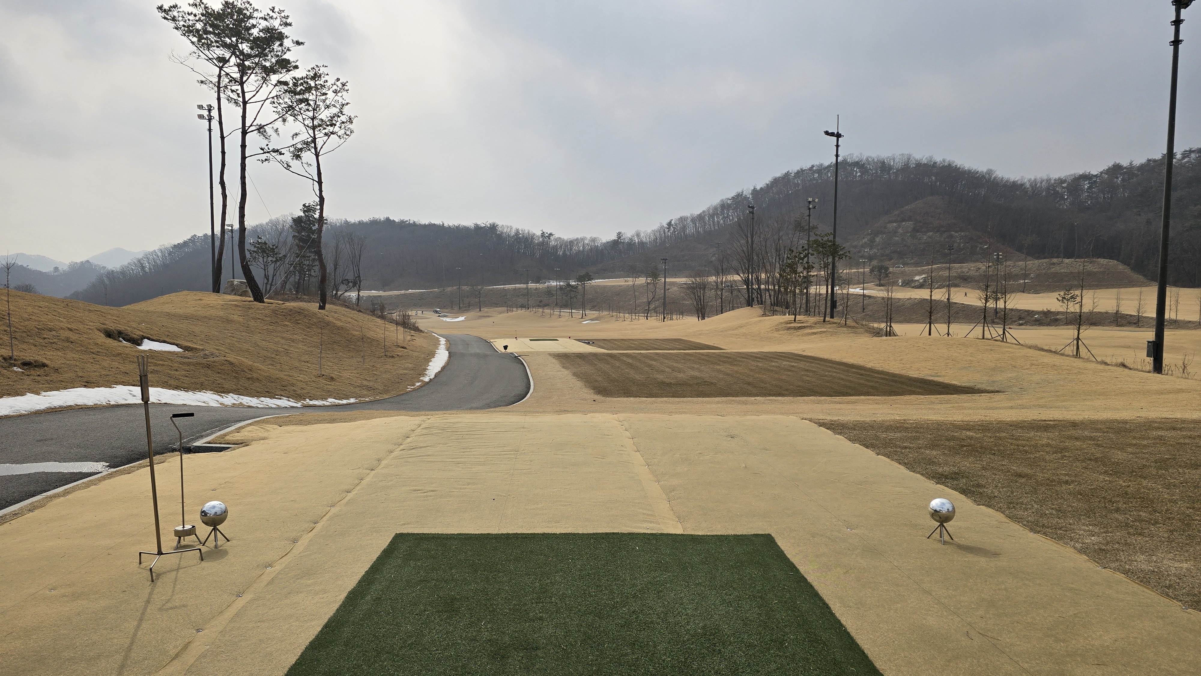 마스터즈 D코스 1번 396m의 파4 롱홀에서부터 시작합니다. 아직 겨울시즌이라 티샷구역은 매트가 깔려있으며 좌우 OB지역이라 힘이 들어갈수도 있습니다.