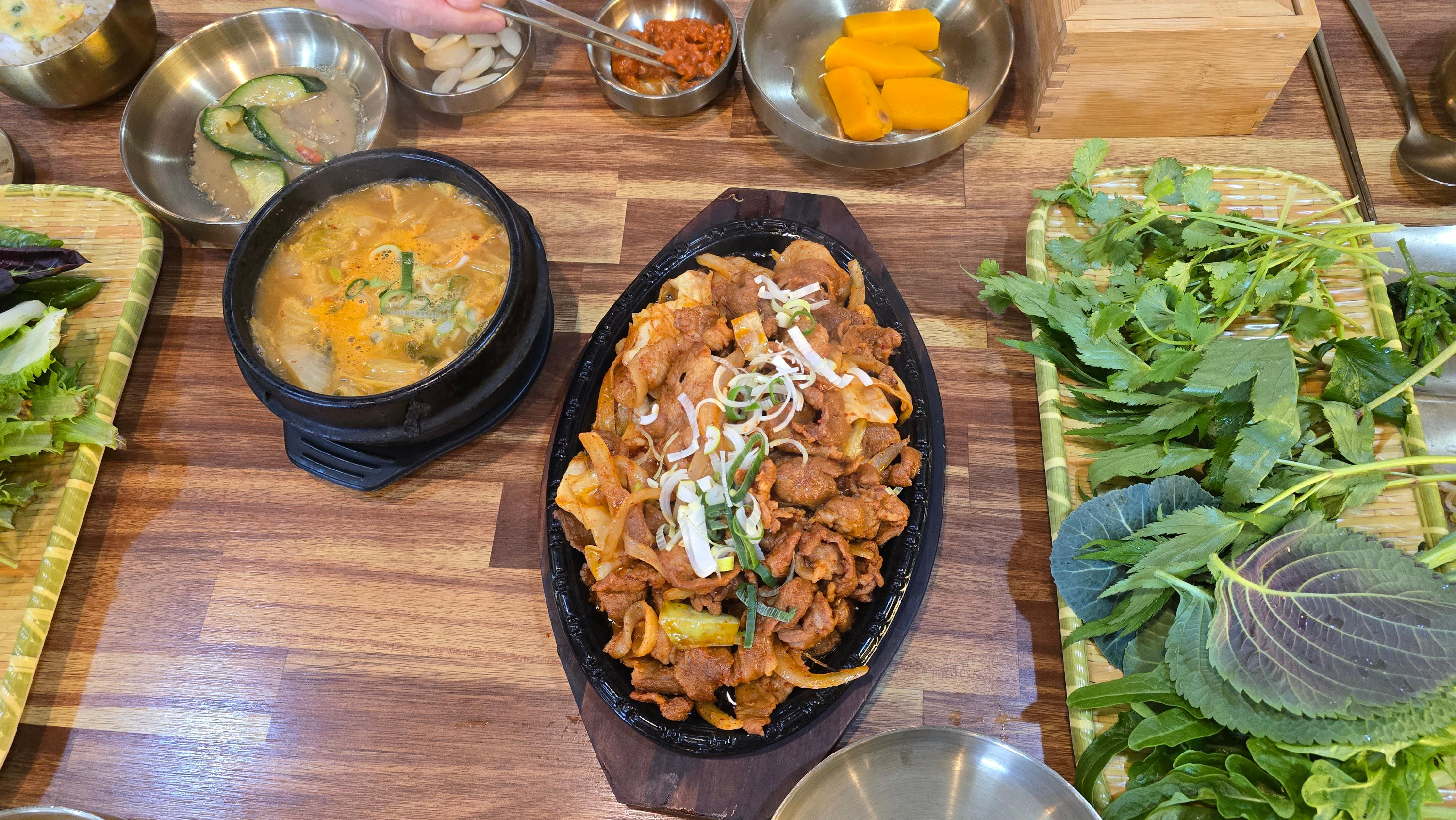 채소를 듬뿍 담아 기다리니 10가지나 넘는 반찬과 제육을 세팅해 주십니다. 보기만해도 건강해보이는 밥상으로 가게이름을 자연밥상으로 지은게 무척 잘 어울린다 생각되는 순간이 아닐수 없습니다.
