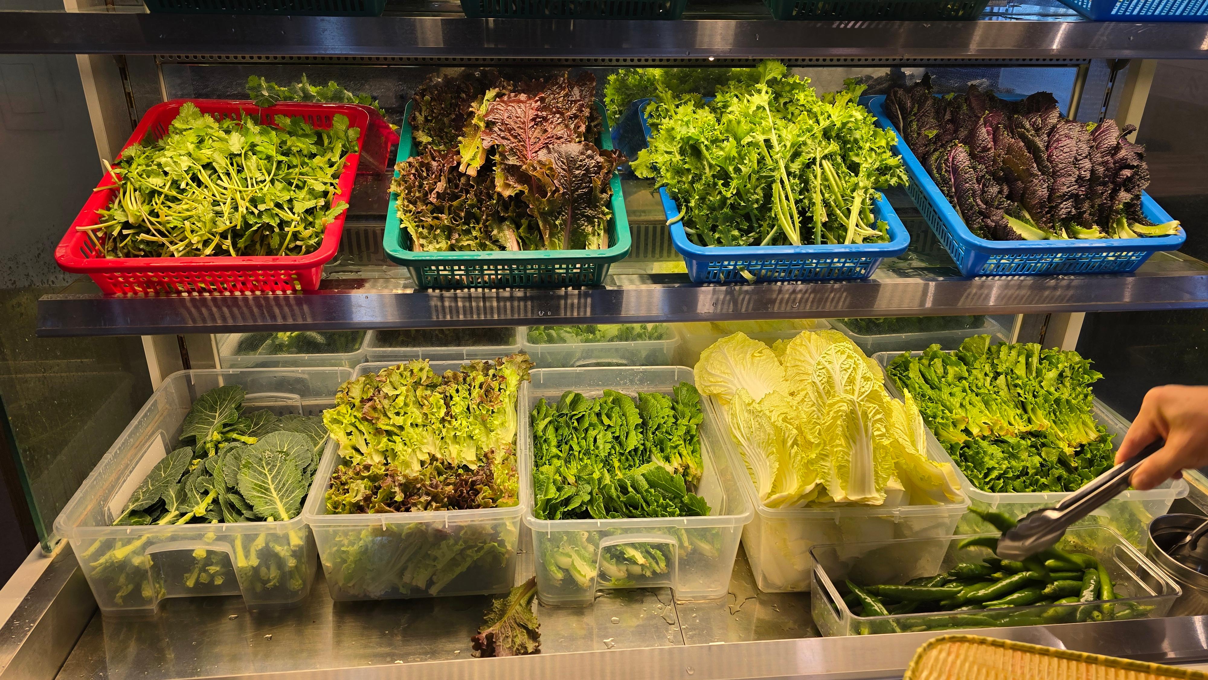 주문을 마치고 쌈을 담을 빈접시를 주면 셀프바로가서 먹고싶은 채소를 담으면 됩니다. 상추, 깻잎은 물론이고 와사비, 봄동 그리고 당귀와 고수까지 상당히 다양한 종류의 야채가 있는게 매우 인상적입니다.