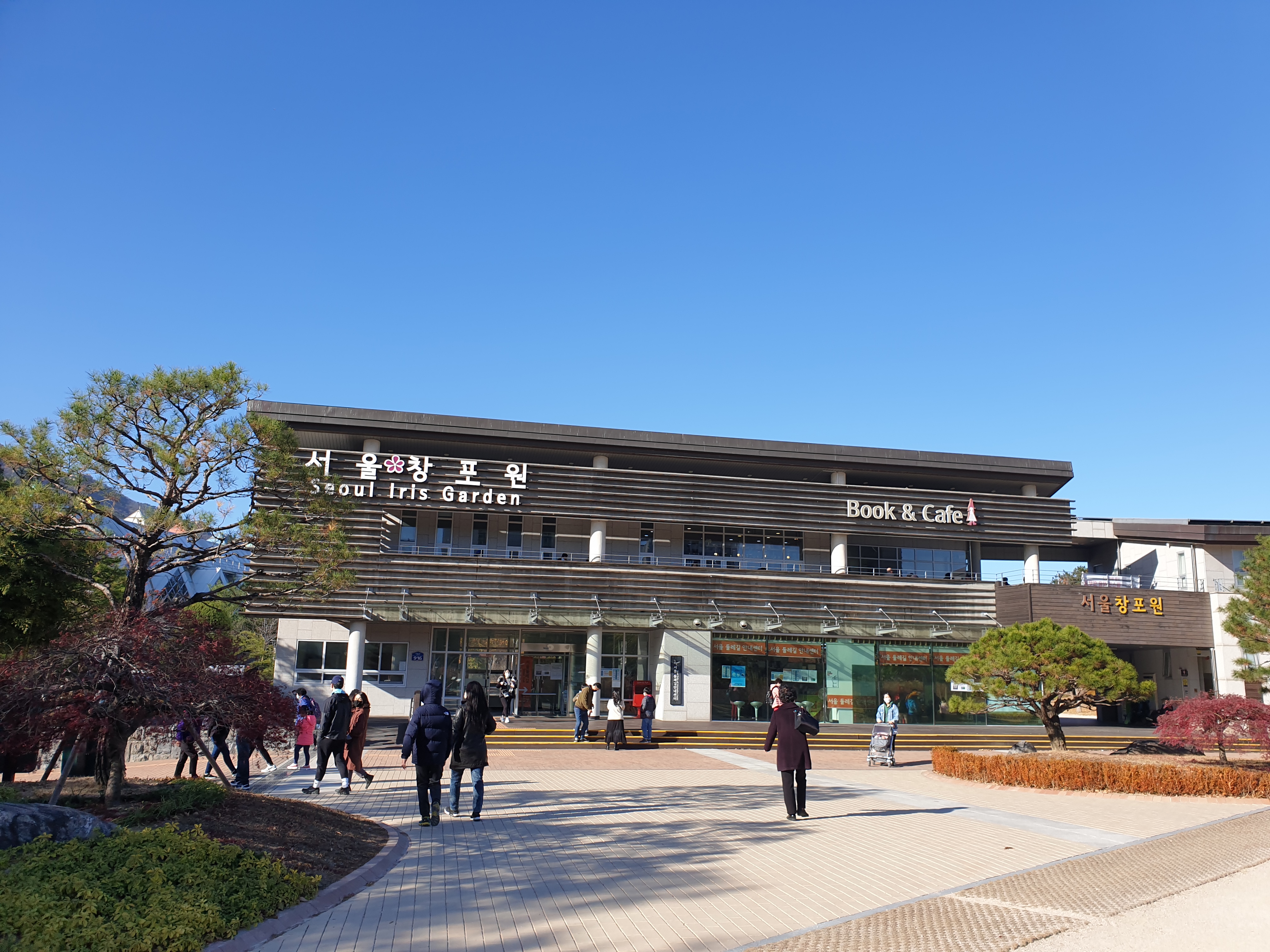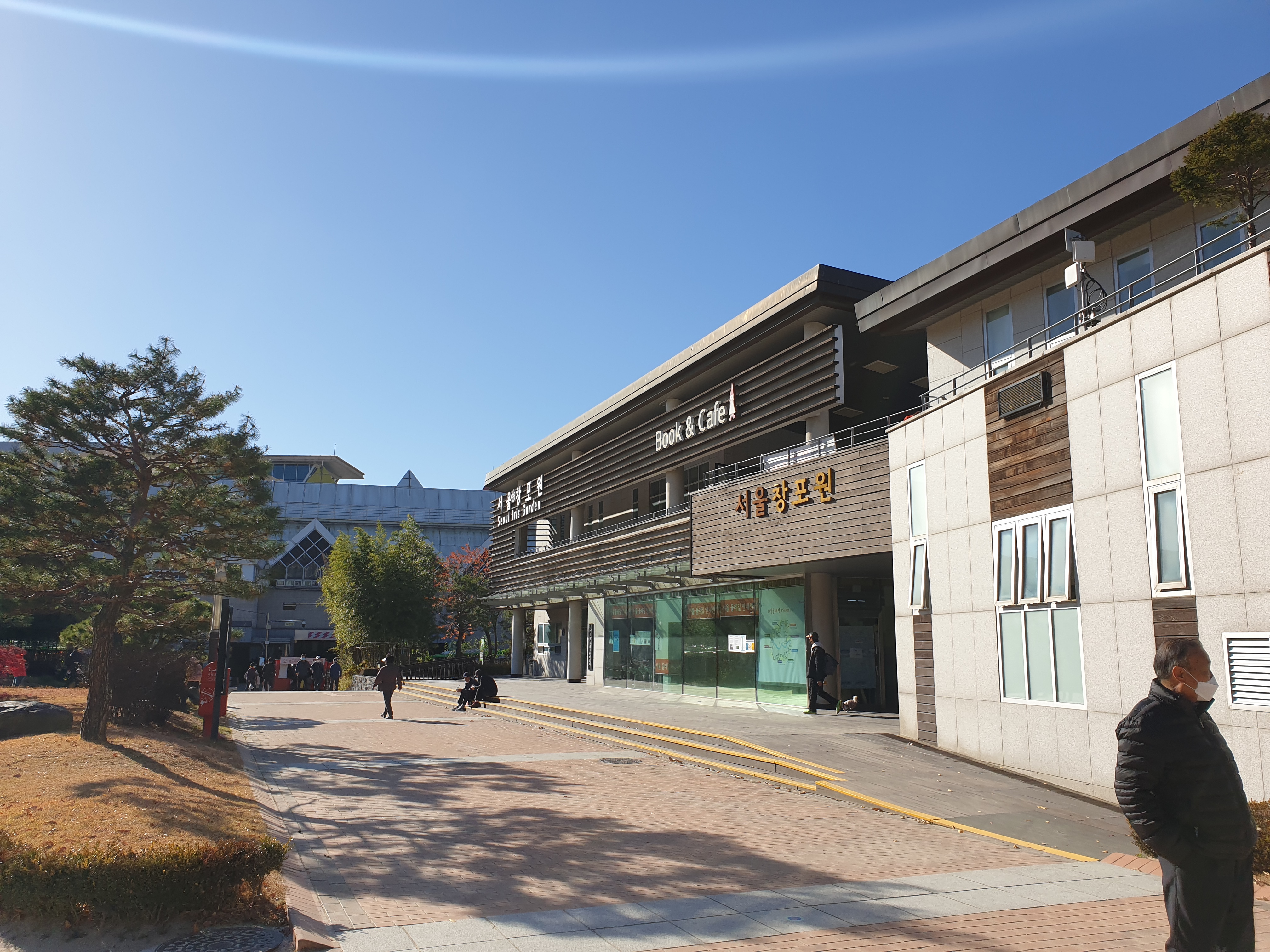 서울 창포원 정문의 모습입니다. 메인 건물에 창포원이라고 간판이 있으며 북카페가 보입니다. 겨울철이라 미세먼지 없이 높고 푸른하늘이 인상적입니다.