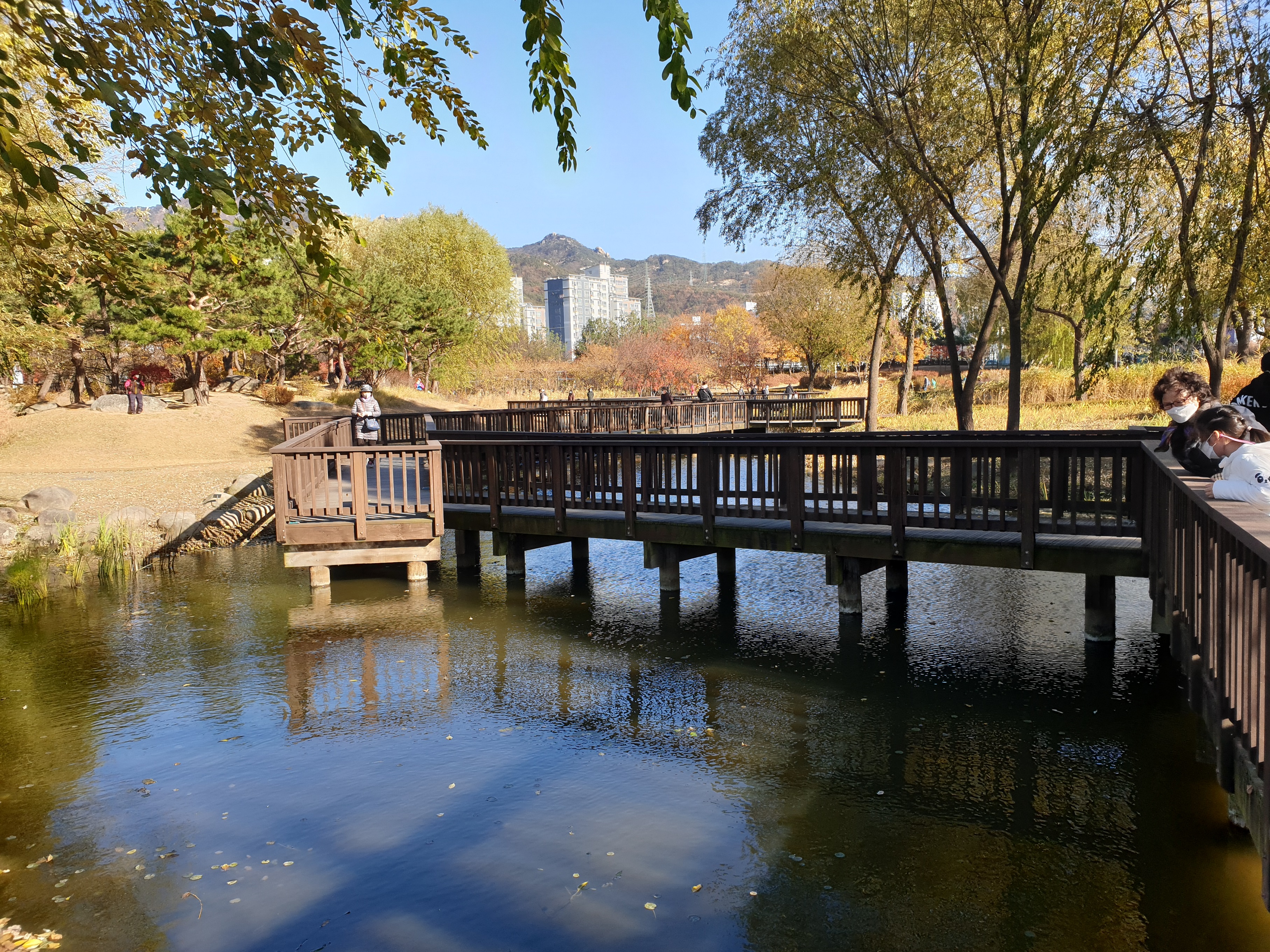다리에 올라가서 풍경을 찍어봅니다. 사람들이 다리 난간에 걸터서 물속을 바라보고 있습니다. 자세히 살펴보니 연못에서 물고기가 떼를 지어서 헤엄치고 있습니다.