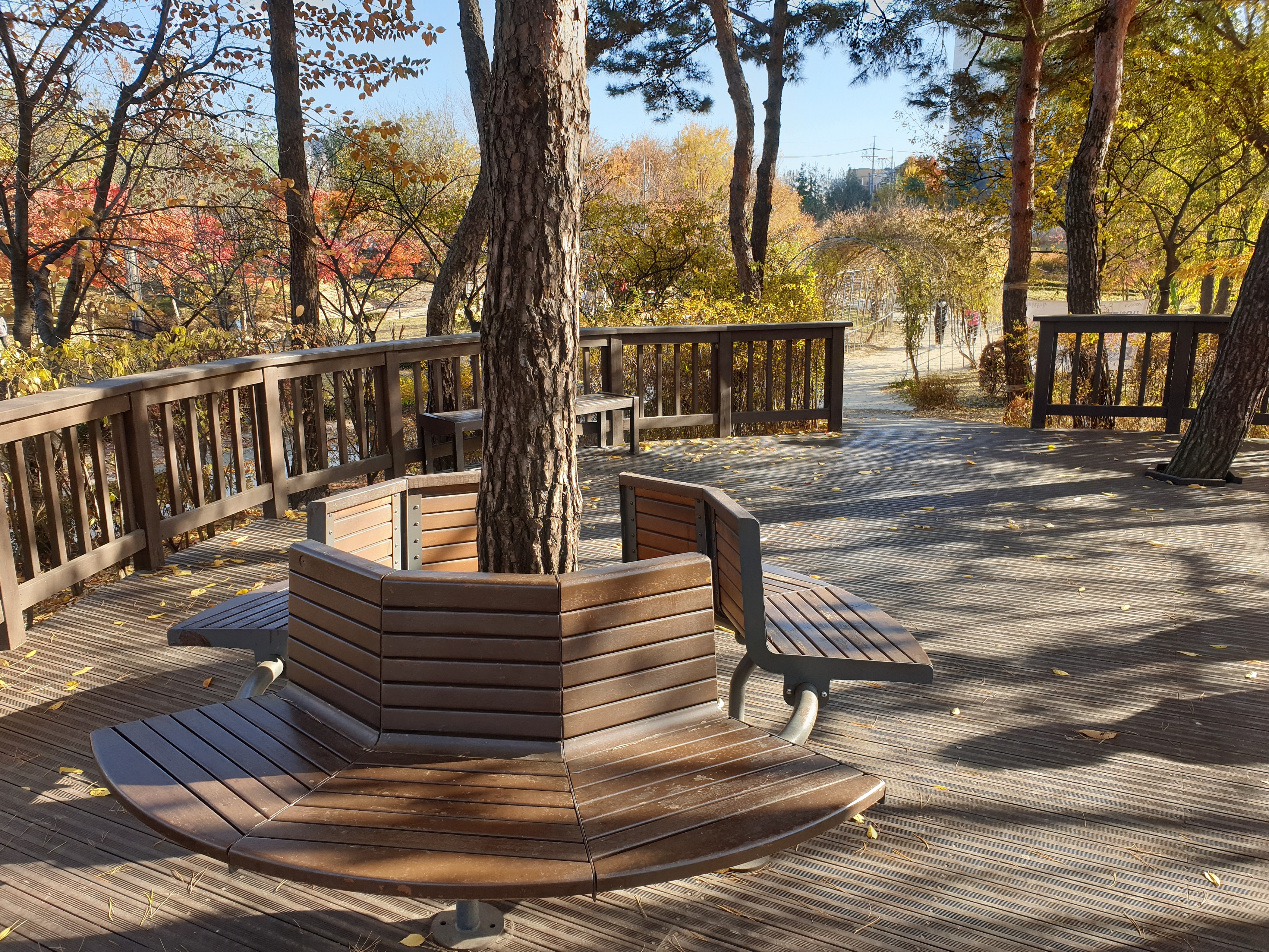 다리가 끝나고 조그마한 공터에 앉아쉴 벤치가 보입니다. 벤치에 앉아 쉬면서 풍경들을 감상하고 몸과 마음을 힐링합니다. 서울창포원은 동북쪽에서 가장 최근에 생긴 접근성이 좋고 여유가 있는 공원인것 같습니다.