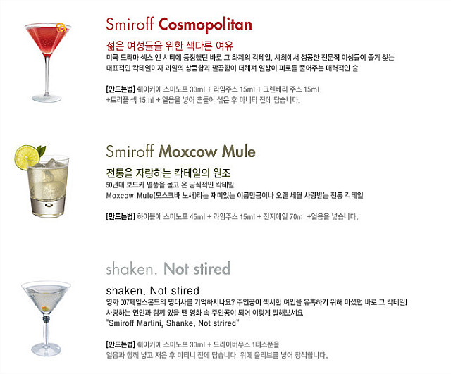 또한 다양한 칵테일로서 즐길수가 있으며 공식홈페이지에서는 다양한 칵테일 레시피를 공유하고 있습니다. 보드카는 마시는 방법이 무궁무진하므로 다양한 방식으로 즐겨보시길 바랍니다.