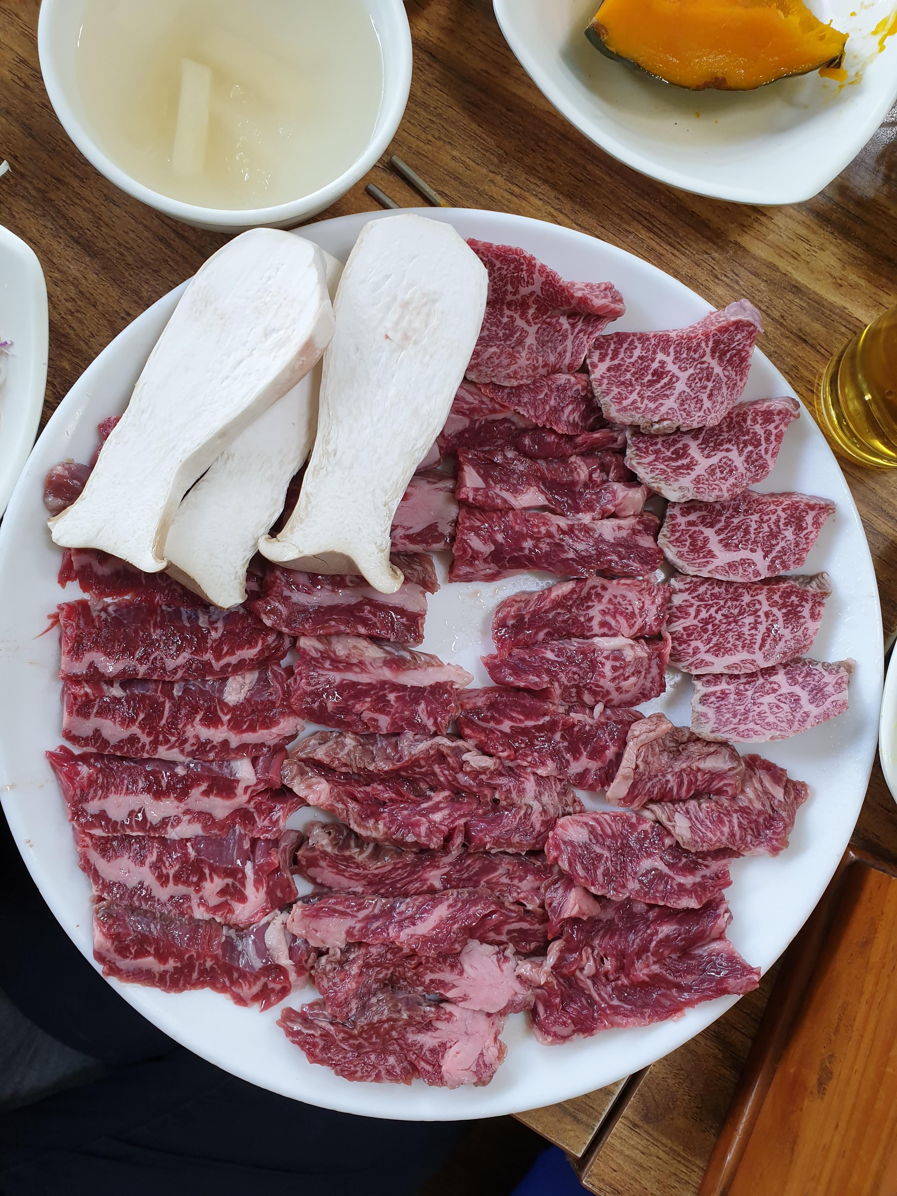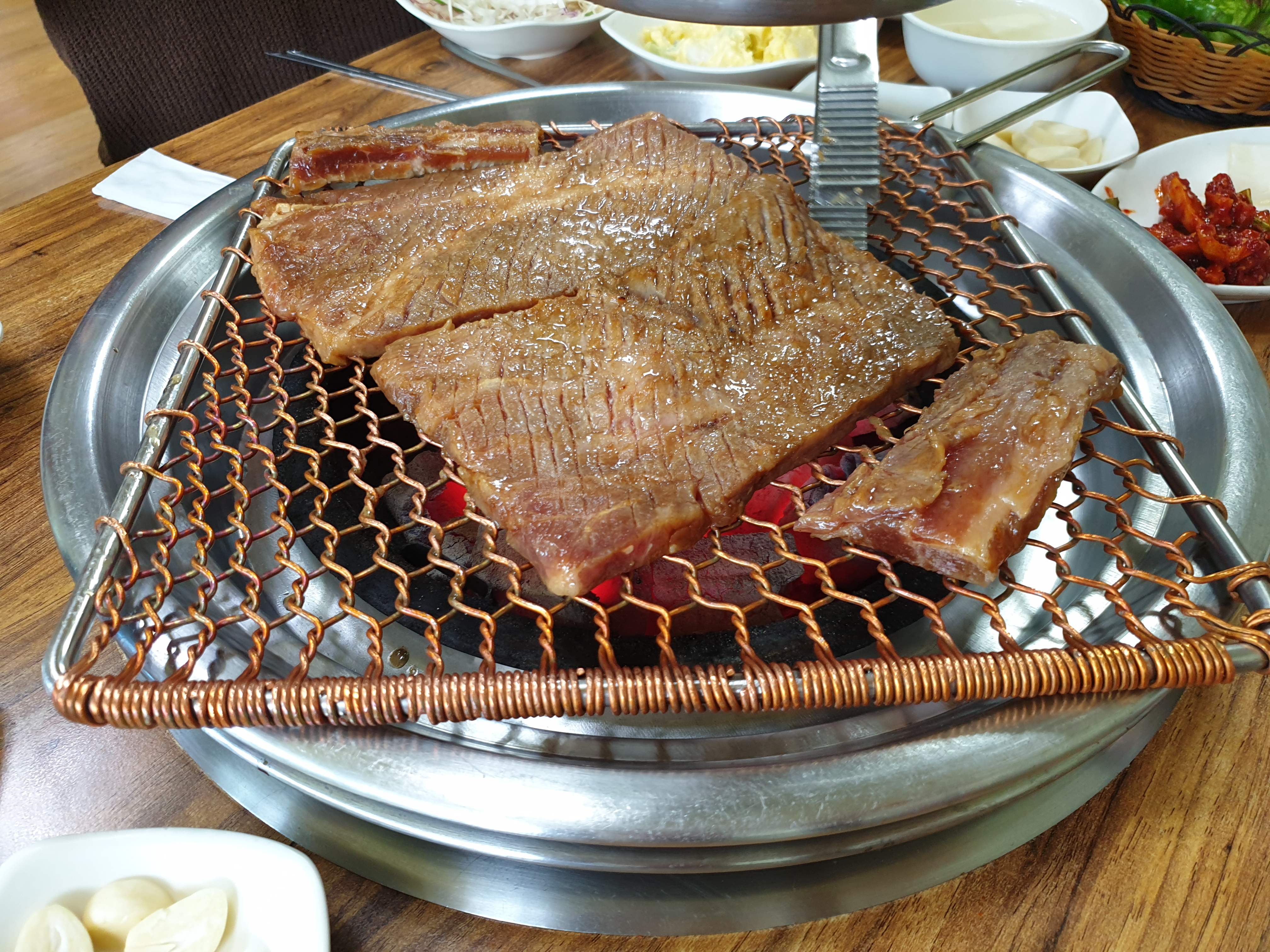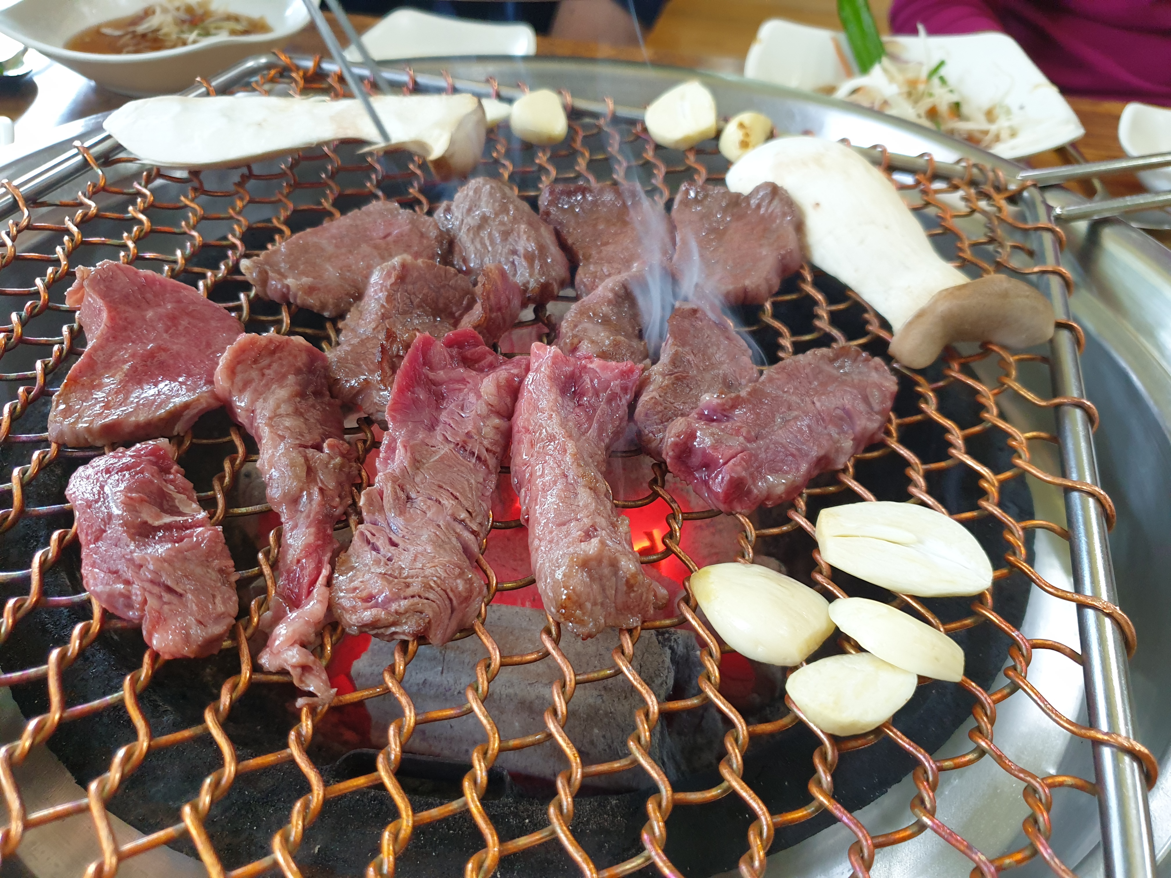 반찬을 맛보는동안 소고기가 맛있게 익어 가고 있습니다. 여러부위를 올려놓고 맛을 비교해가며 음미하면서 먹을 생각입니다. 살치살은 지방끼가 잔득올라 고소한맛이 일품이었으며 갈빗살은 냄새가 나지 않은 냉동처리를 하지않은 한우가 분명해 보입니다. 다른 부위들도 맛있었지만 위 두가지가 가장기억에 남습니다.