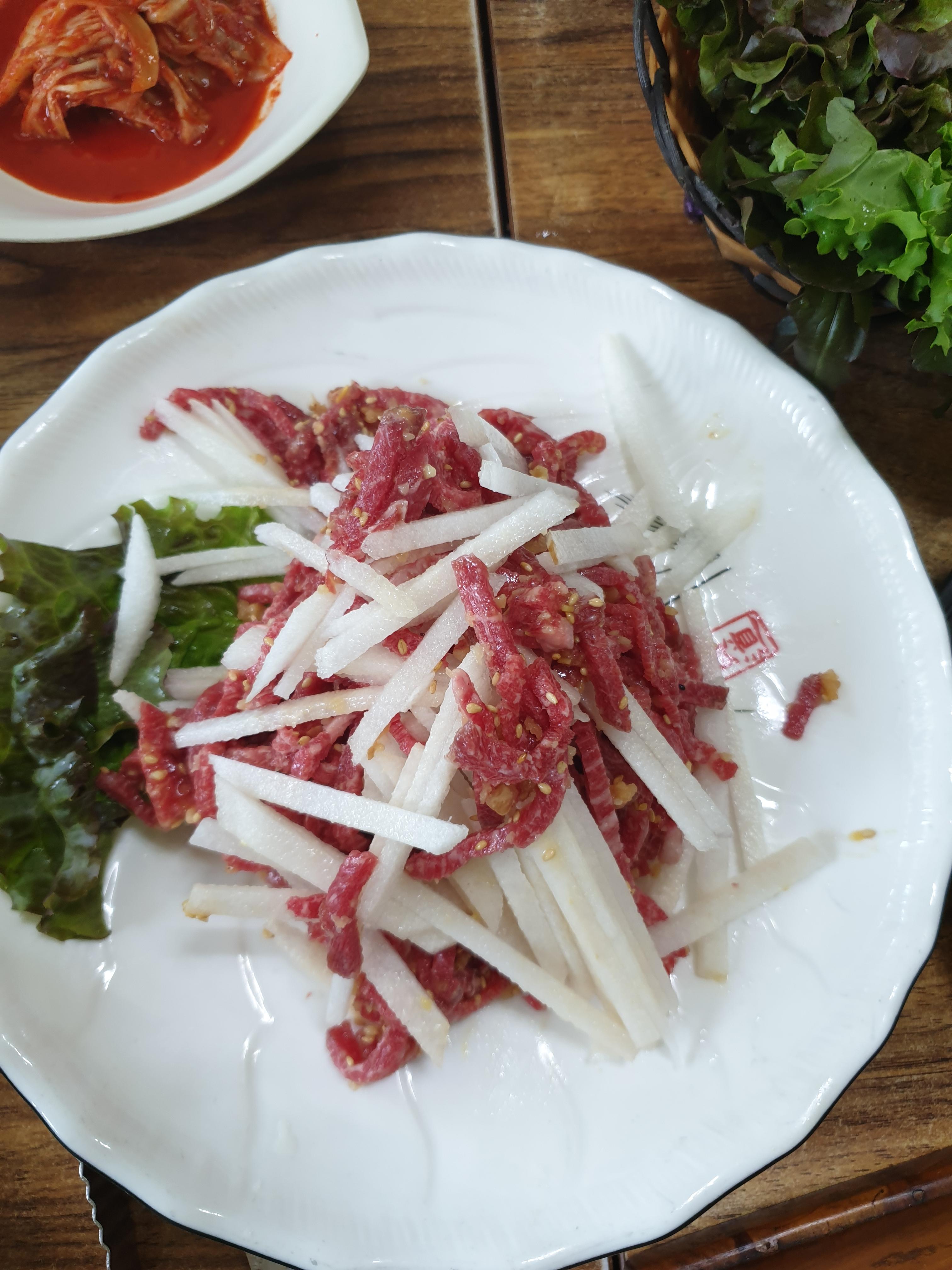 소고기 모듬구이를 먹다가 입맛을 고쳐보게 시킨 육회가 나왔습니다. 이게 진짜 대박입니다. 육회 신선함이 고소한 맛과 어우러지는데 이 고소한맛의 정체는 참기름과 참깨보다 더 진합니다. 처음보는 맛입니다. 이따가 주방장님께 비법이 뭔지 물어봐야겠습니다.