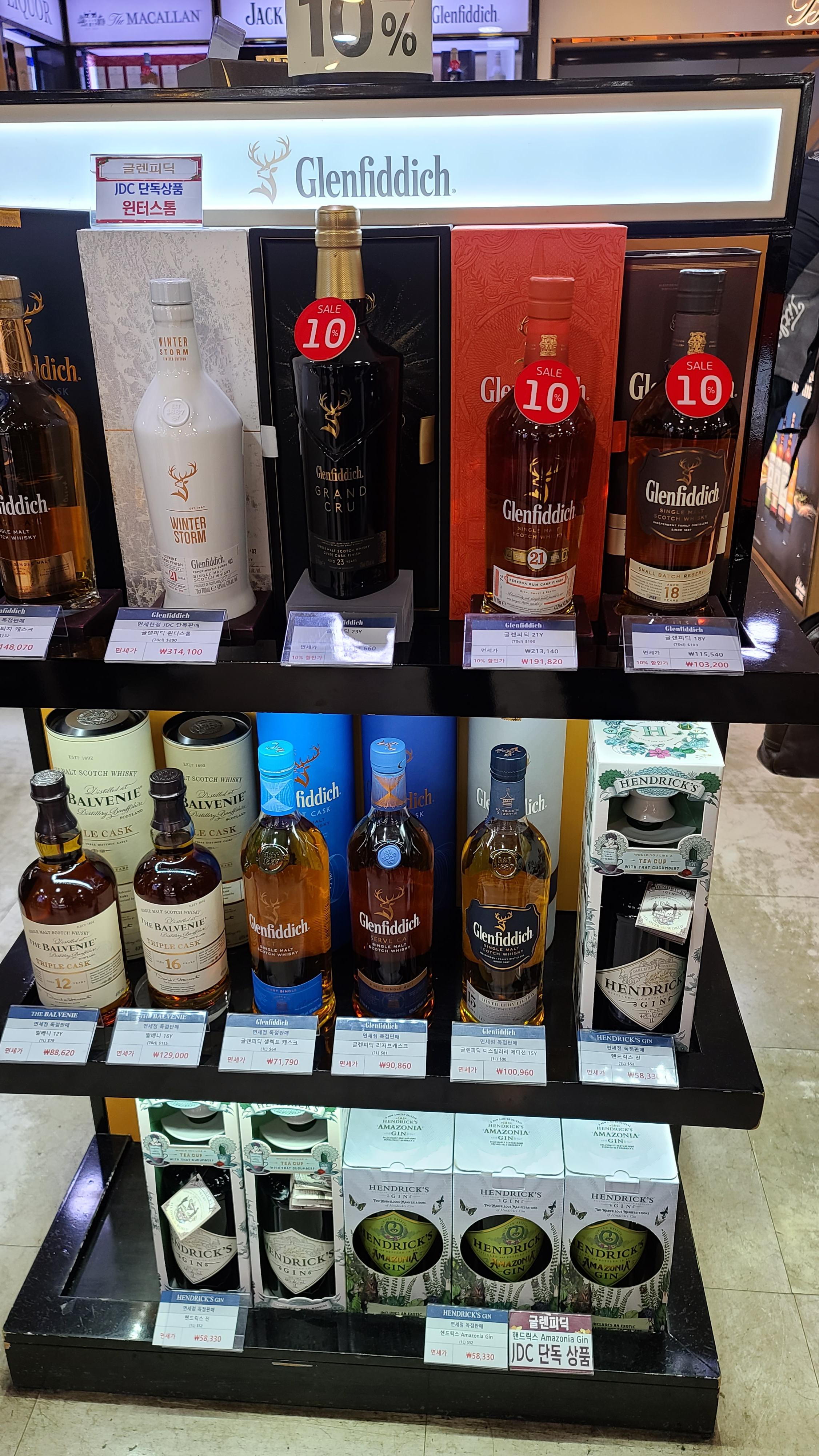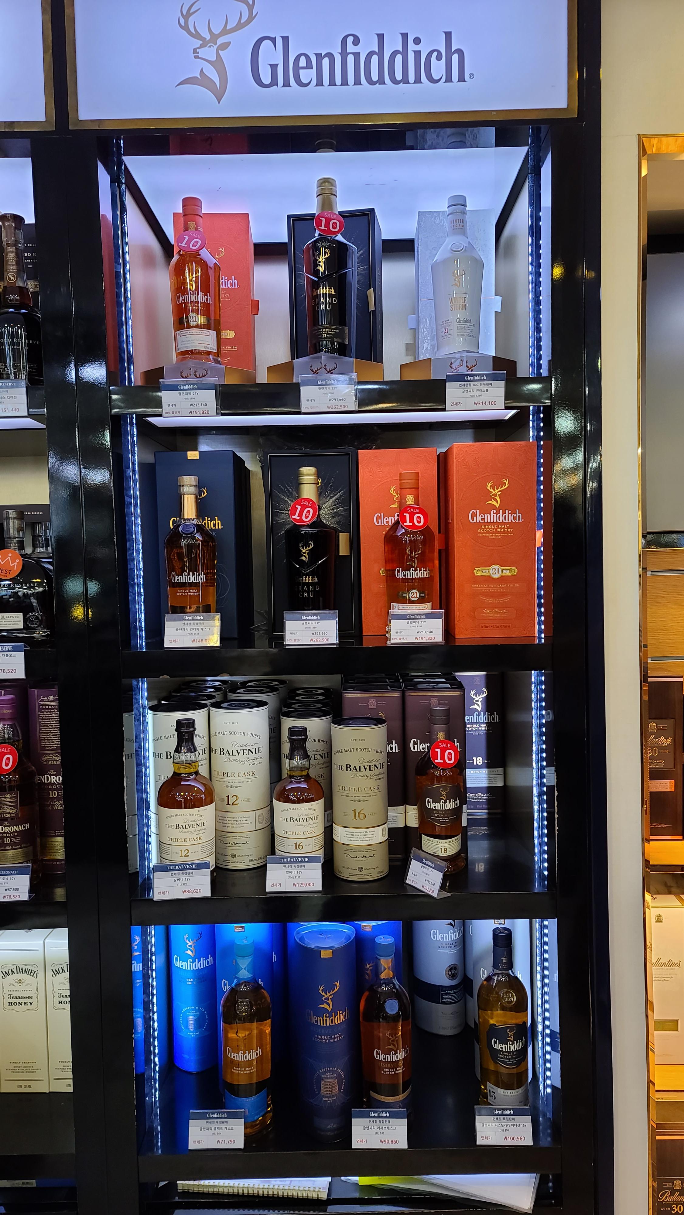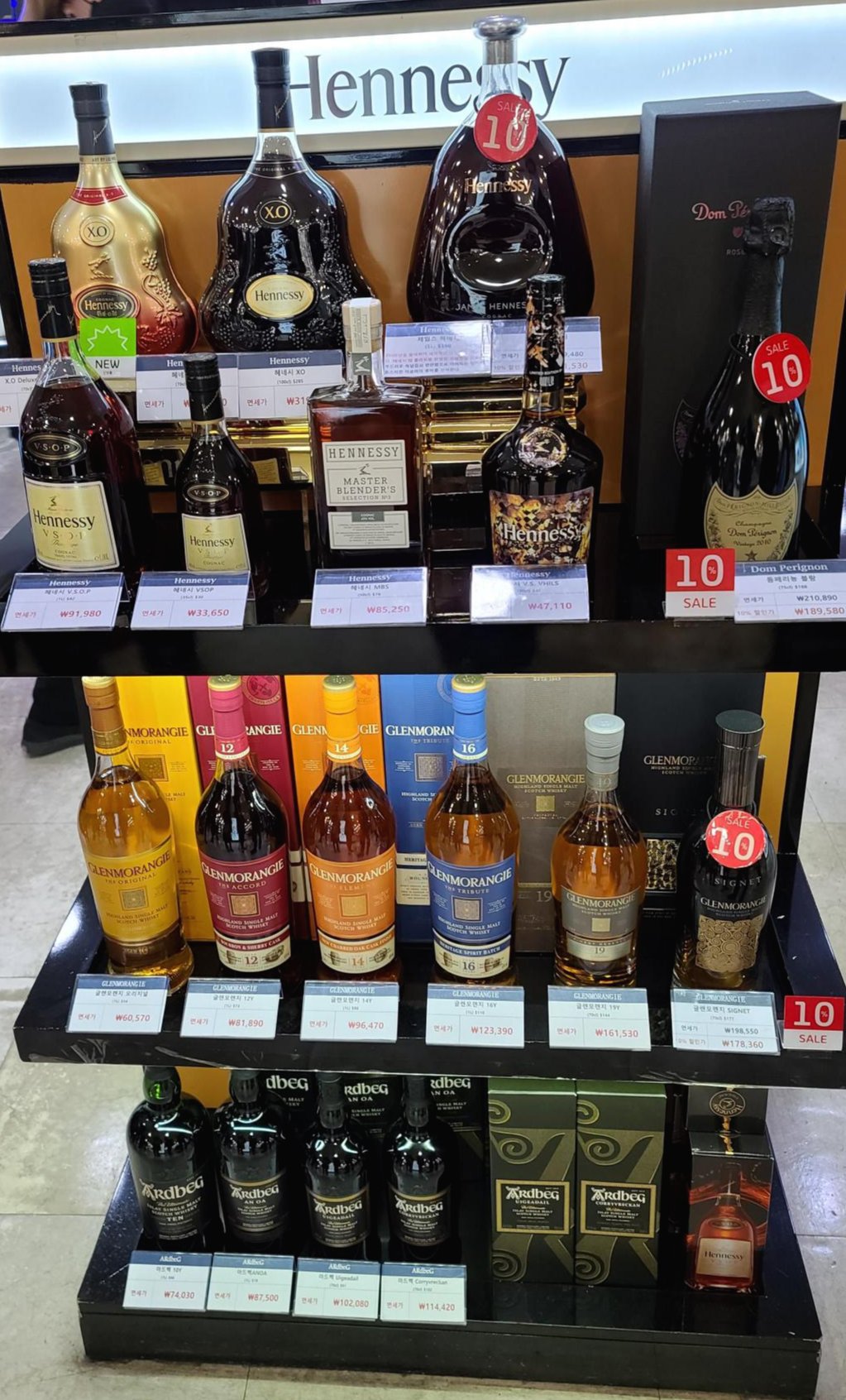 주류코너 첫번째 장식장부터 살펴봅니다. 헤네시와 글렌모렌지가 진열되어있고 제일 하단엔 유명한 피트위스키 아드벡이 보입니다. 글렌모렌지 시그넷의 경우 상당히 인기가 있는제품인데도 불구하고 비싼가격이라 그런지 10%할인을 실시하고 있는 모습입니다. 헤네시 옆으로는 돔페리뇽을 판매하고 있는 모습이 보입니다.