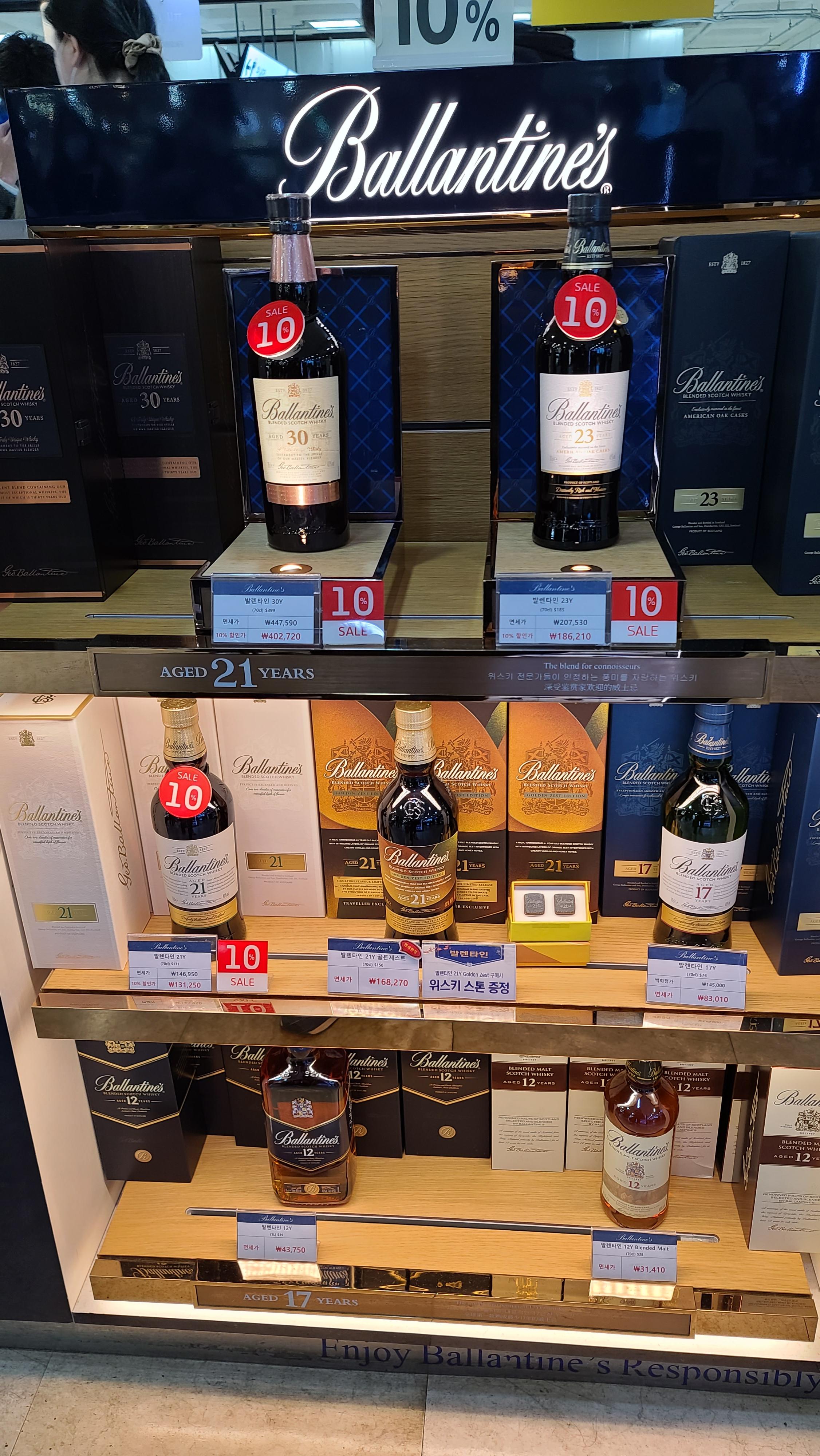 한국인이 가장 사랑하는 위스키 발렌타인 매대입니다. 발렌타인 30년, 23년, 21년, 골든캐스크, 17년, 12년 이 진열되어 있습니다.