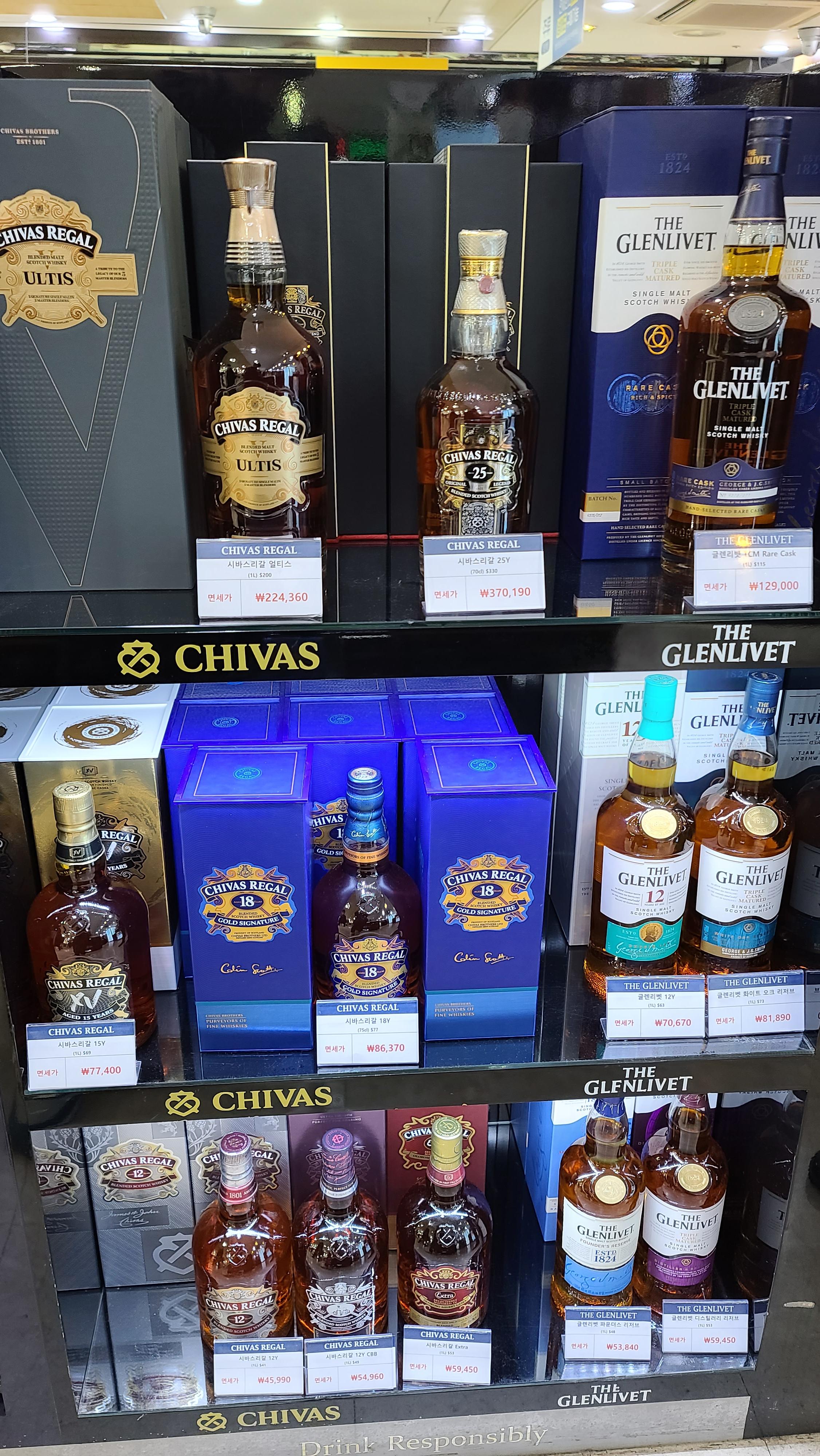 로얄살루트 다음엔 시바스 리갈과 글렌리벳이 보입니다. 시바스리갈 얼티스, 25년, 15년, 18년 등 여러가지 숙성라인업 및 글렌리벳도 파운더스리저브, 디스틸러리 리저브, 화이트 오크 리저브 등 다양한 제품군이 보입니다.