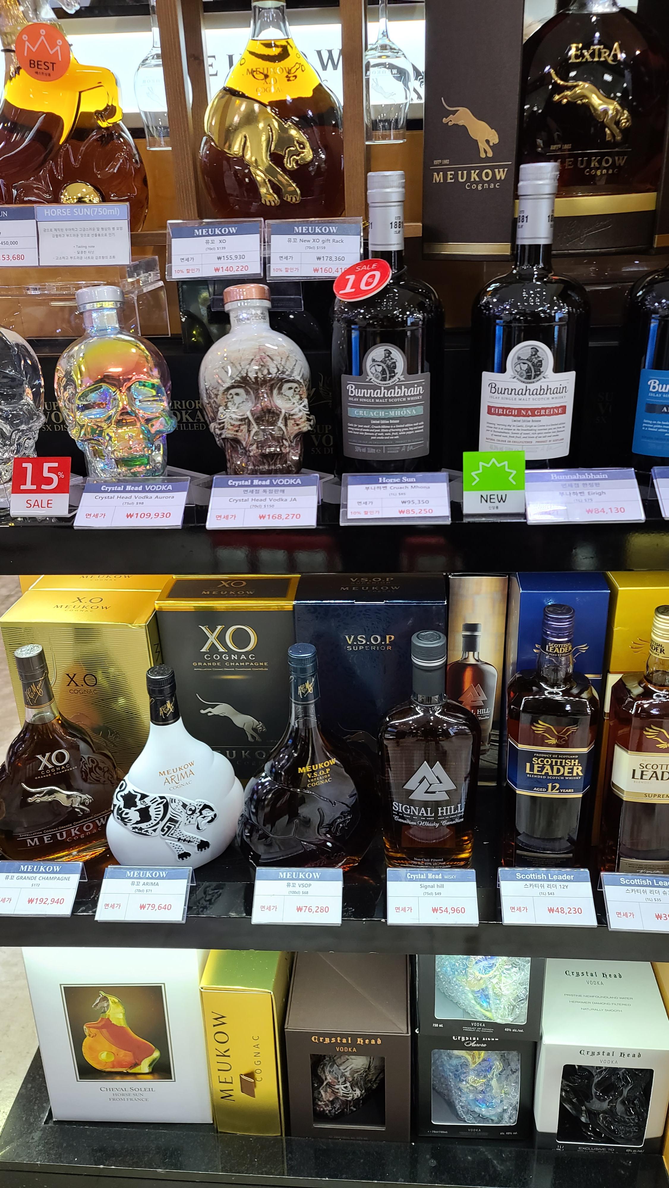 다음매대는 꼬냑과 화이트 스피릿이 보입니다. 뮤꼬XO, 뮤꼬 ARIMA, 부나하벤, 크리스탈헤드 보드카, 크리스탈헤드 위스키 시그널힐, 스카티시 리더 등 다양한 꼬냑, 위스키, 보드카 등이 보입니다.