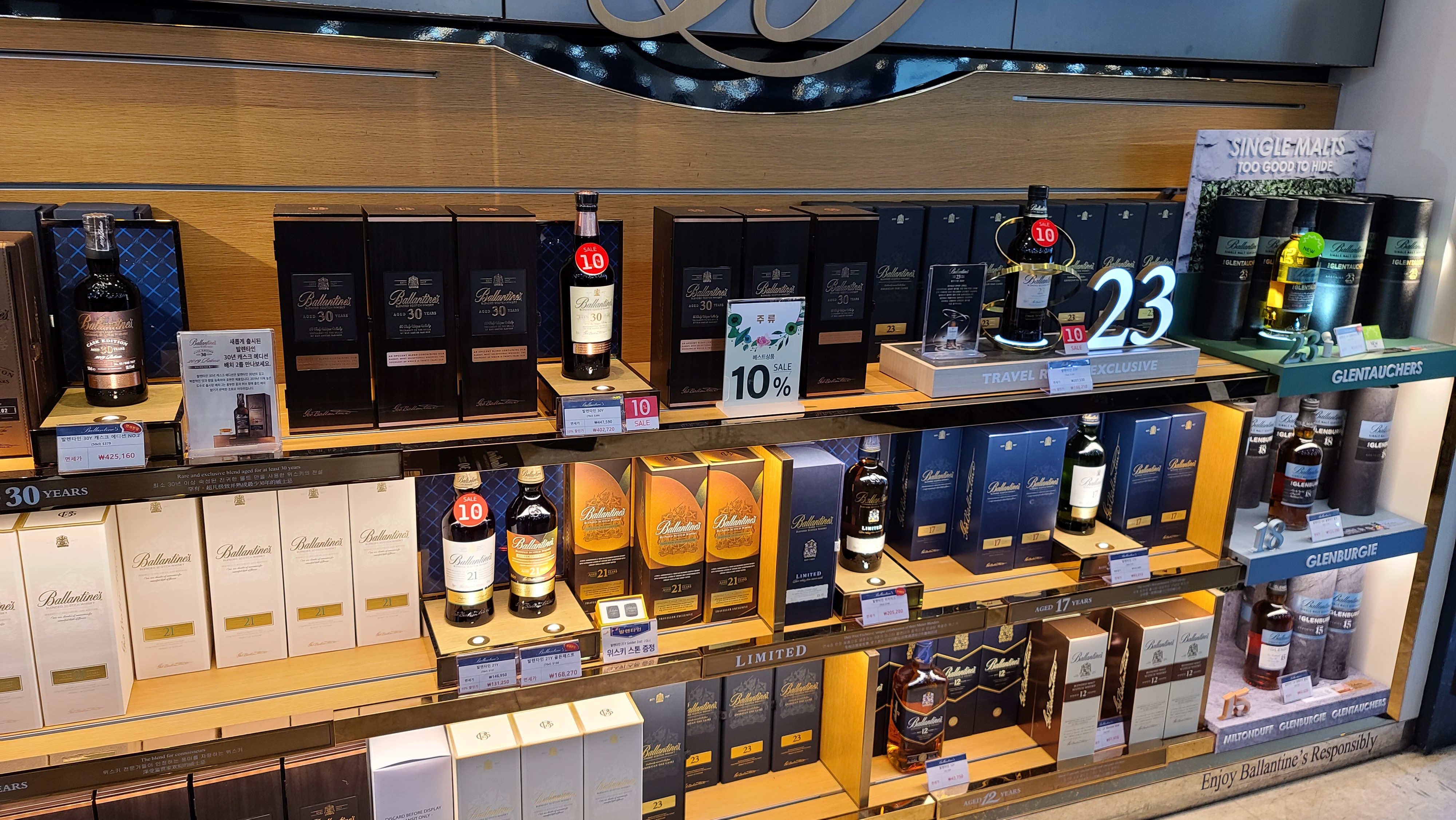 발렌타인 측면을 보니 발렌타인 싱글몰트가 보입니다. 15년 글렌버기, 18년 글렌버기, 18년 글렌토커스 시리즈가 진열되어 있습니다.