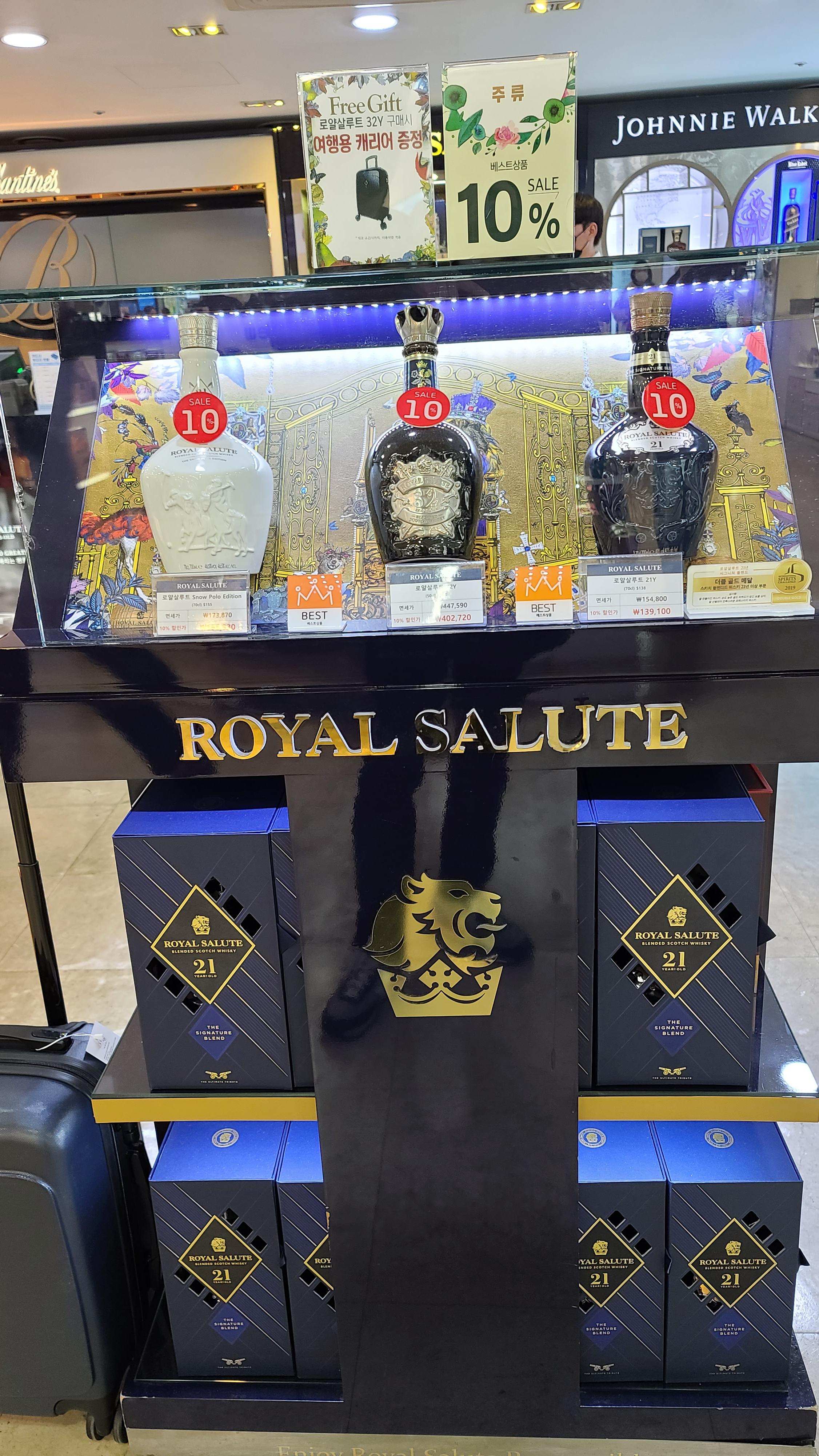 면세점의 절대강자 로얄살루트 매대입니다. 로얄살루트 21년, 32년 그리고 스노우 폴로에디션이 보이고 32년을 구매하면 여행용 캐리어를 상품으로 준다고 써있습니다. 아주 공격적인 판촉이 아닐수 없습니다.