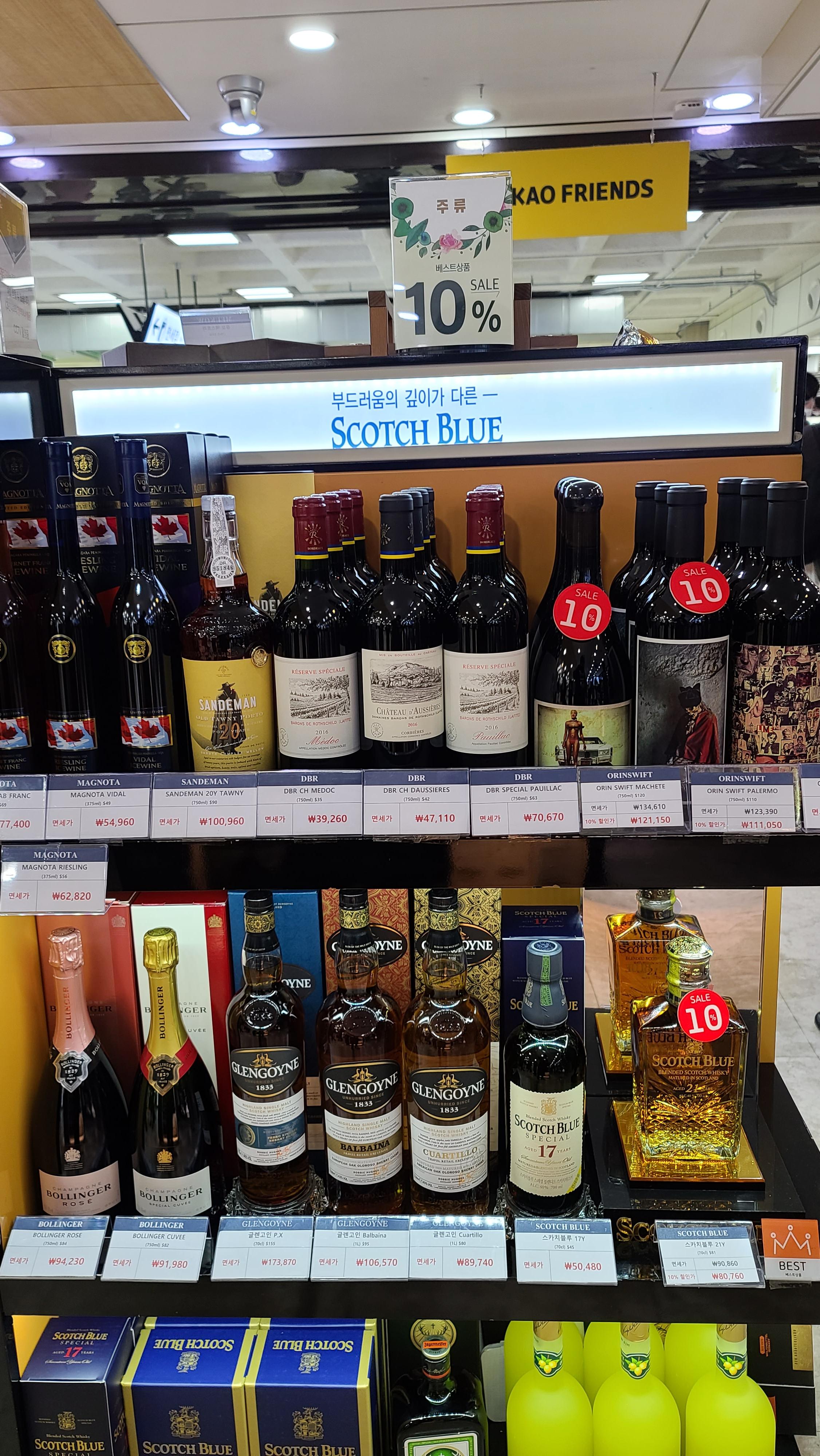 안쪽으로 살펴보니 글렌고인, 스카치블루, 볼랭저, 샌드맨, 매그노타, DBR, 오린스위프트 등 다양한 롯데주류코너가 보입니다.