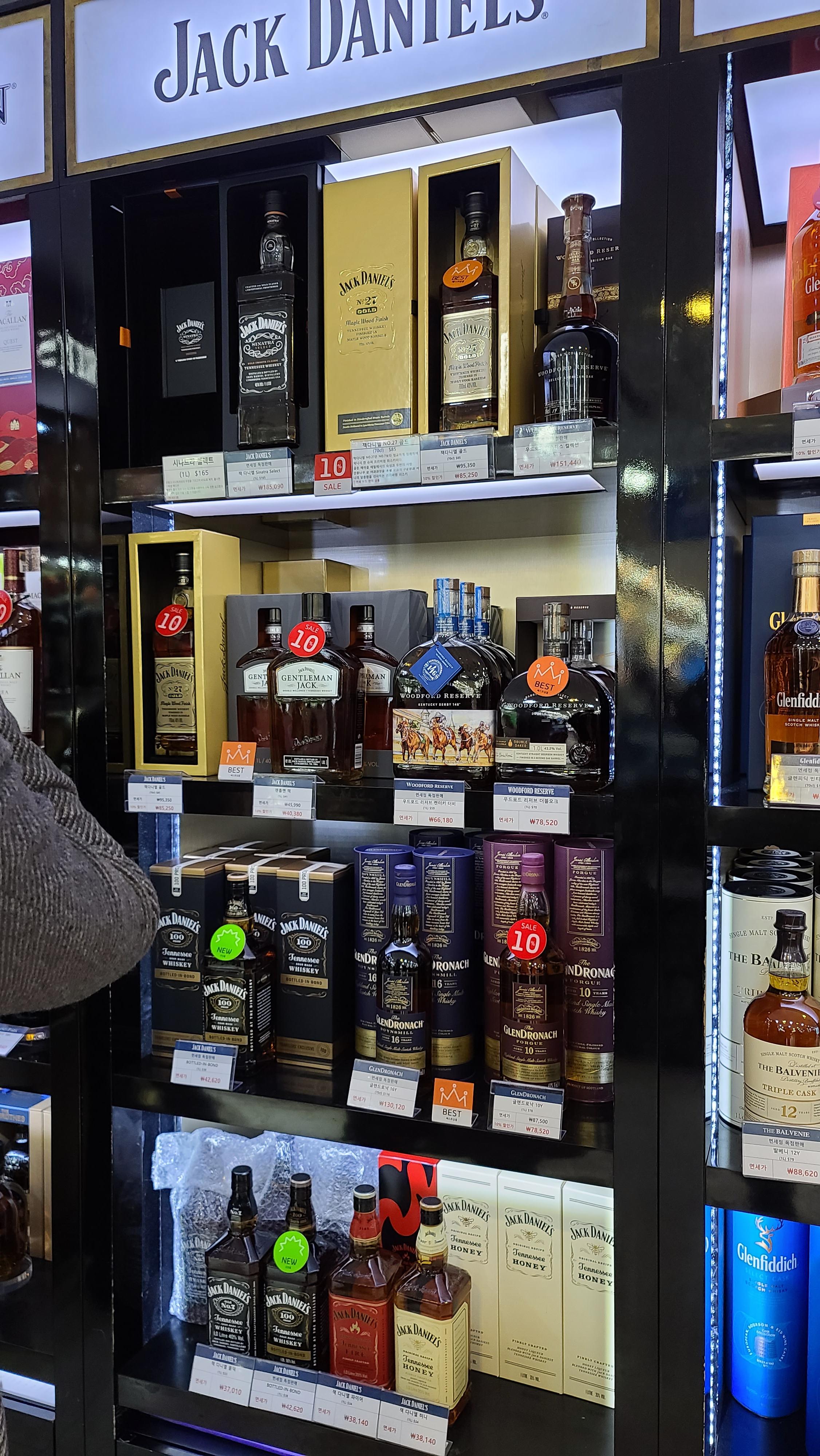 다양한 잭다니엘스 시리즈와 글렌드로낙이 인상적인 매대입니다. 우드포드 리저브 켄터키와 더블오크 그리고 마스터스 컬렉션도 보입니다.