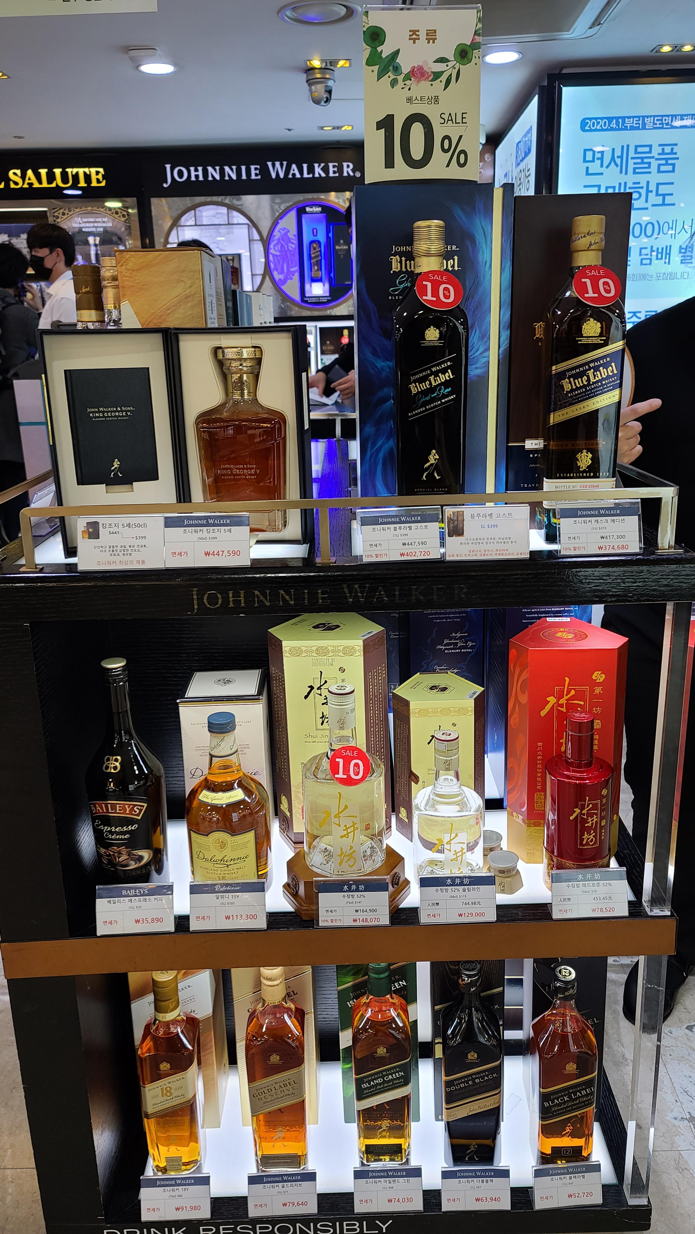 하단에는 조니워커 킹조지, 18년, 골드, 그린, 블랙, 더블블랙의 시리즈가 자리잡고 있고 위로는 베일리스, 달위니 그리고 수정방 고량주가 자리하고 있습니다. 모두 같은회사 제품인걸 보니 회사별로 판매대를 만들었나봅니다.